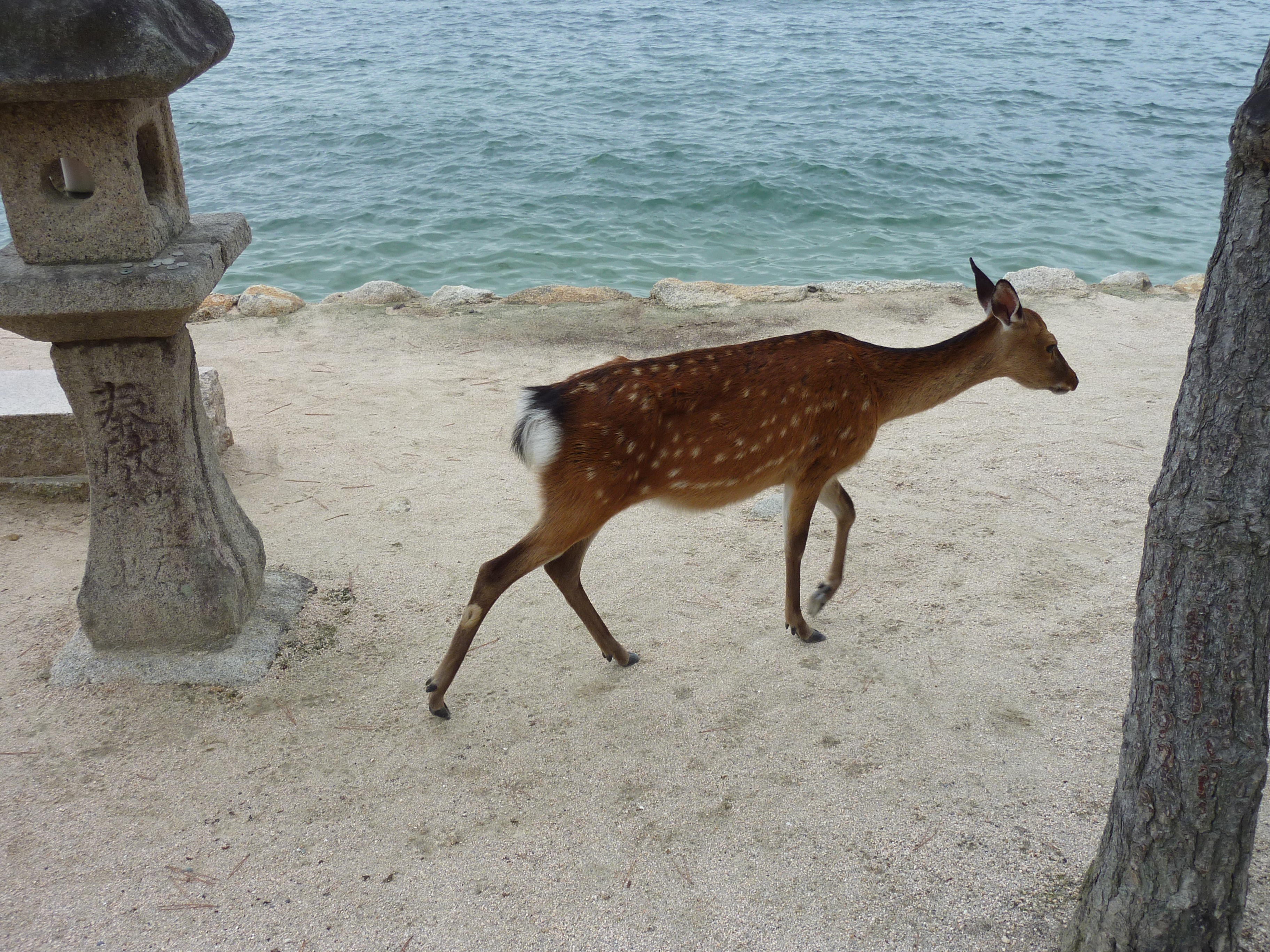 Pour cette journée, de la pluie était prévue sur l’ouest du Japon: Que je reste à Kyôto ou que je bouge, je m’exposais à un temps peu propice aux visites en extérieur. C’est donc assez débilement que je suis parti vers Hiroshima (80% de chance de pluie). après 2h de Shinkansen et 25 minutes de train local, j’arrive en face de l’île sacrée de Miyajima. Le temps est couvert, mais ça tient. La traversée en ferry est rapide, est à peine débarqués nous sommes accueillis par des daims, qui pullulent ici, que ce soit sur la plage ou dans les montagnes. La plupart du temps ils ignorent les humains. Ils ont raison les cons.