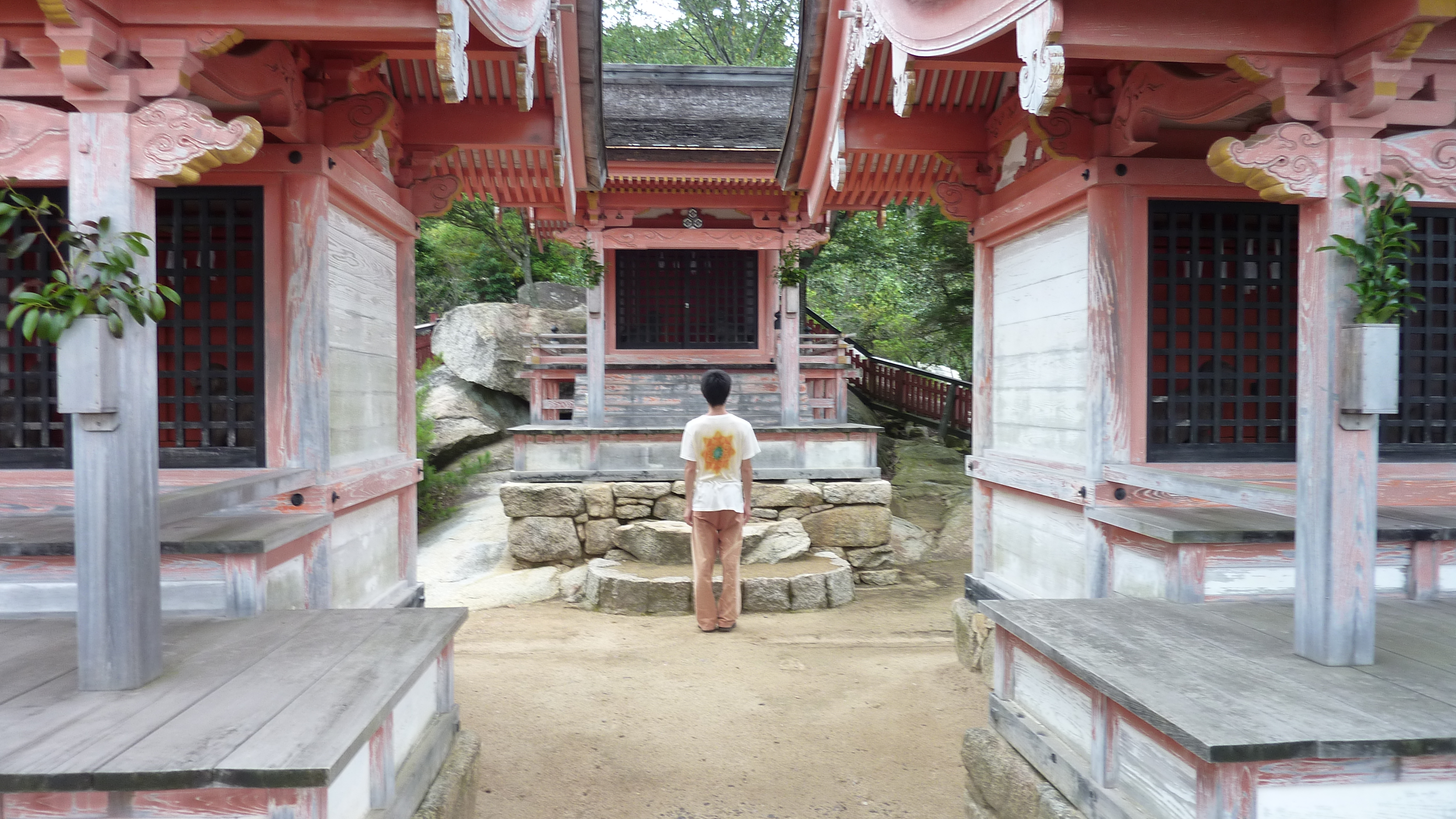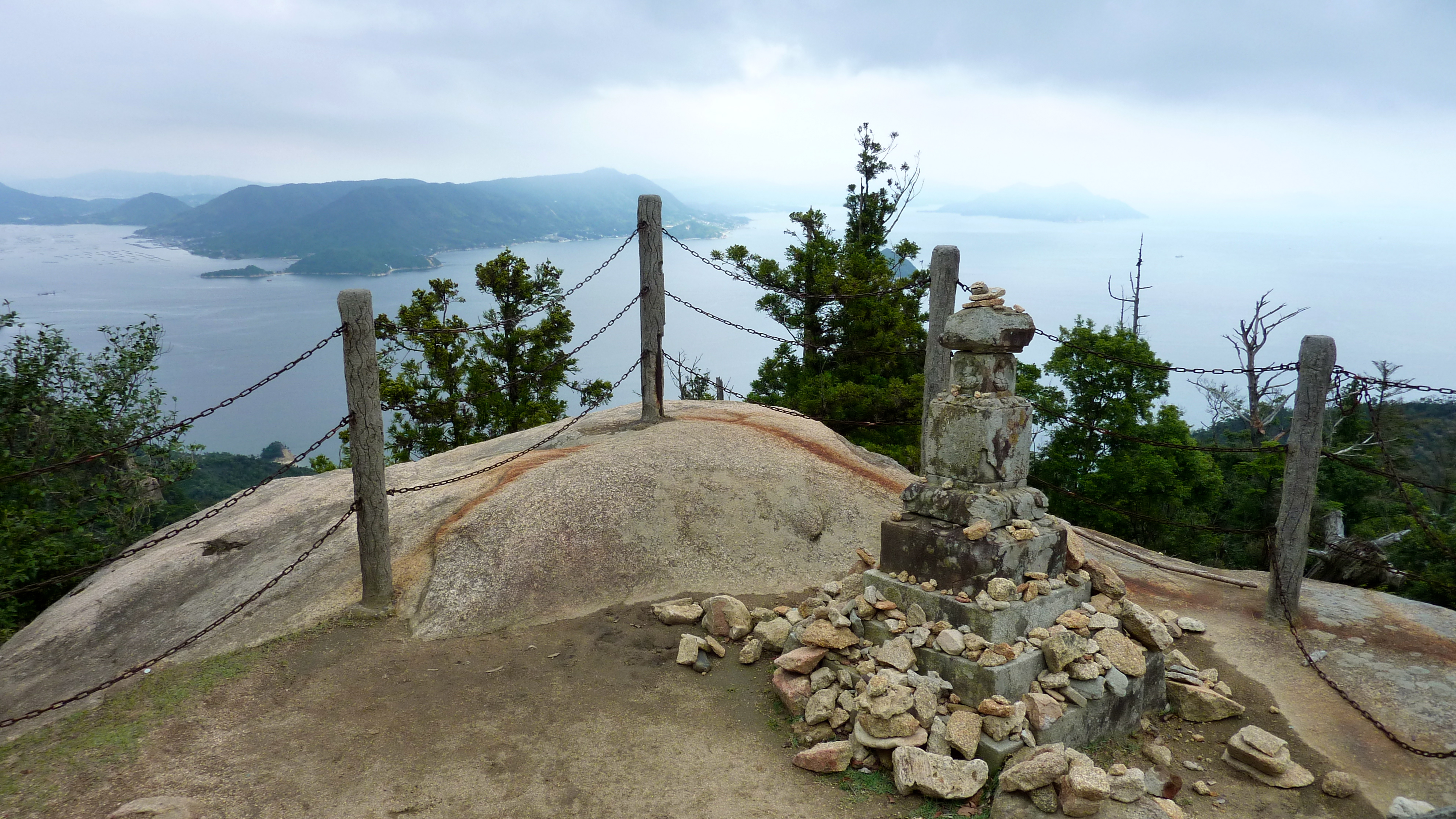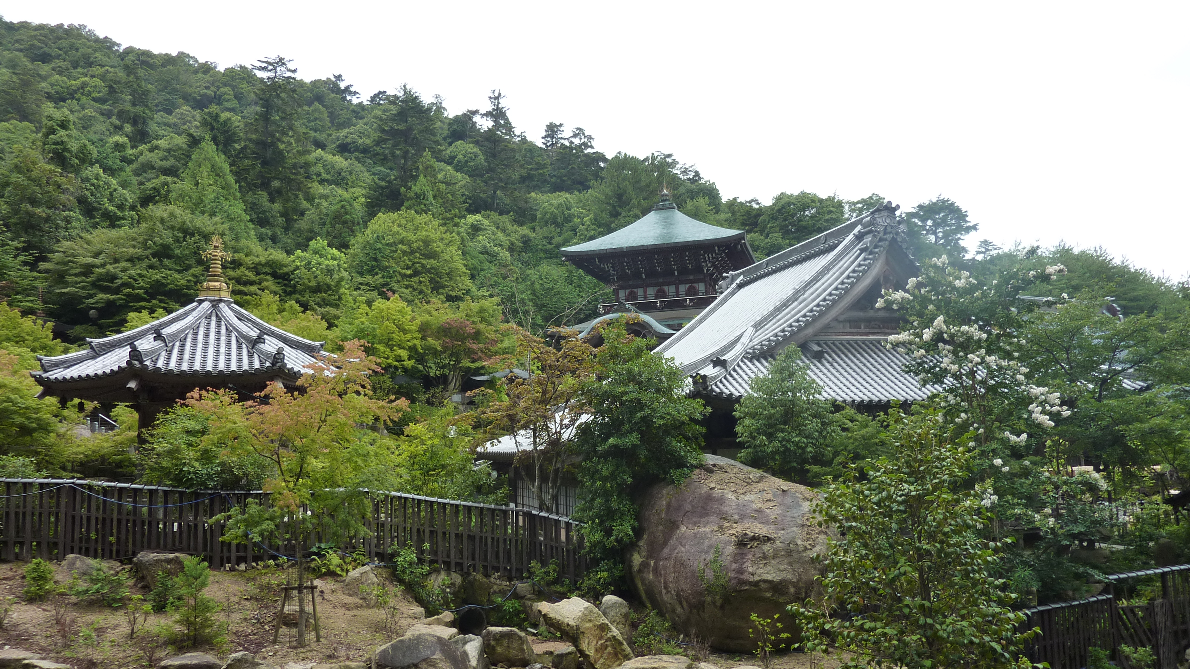 Après une visite du sanctuaire Itsukushima, un temple “les pieds dans l’eau”, et la traversée du parc Momijidani, je prends une remontée mécanique, puis finit par gravir les derniers hectomêtres vers le mont Misen, point culminant de l’île. Le temps change alors, et c’est sous la pluie que je fais la descente pédestrement. Pendant une heure, je ne croise personne sur le chemin -pas même un daim-, c’est impressionant.