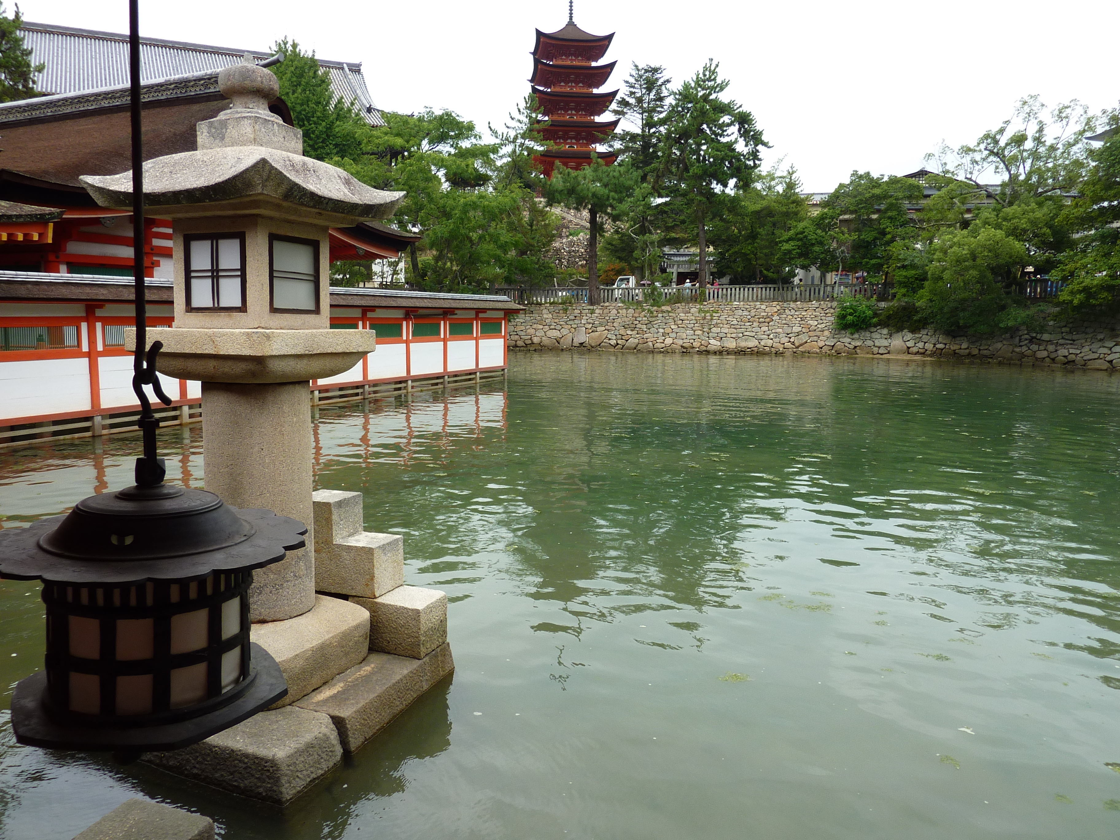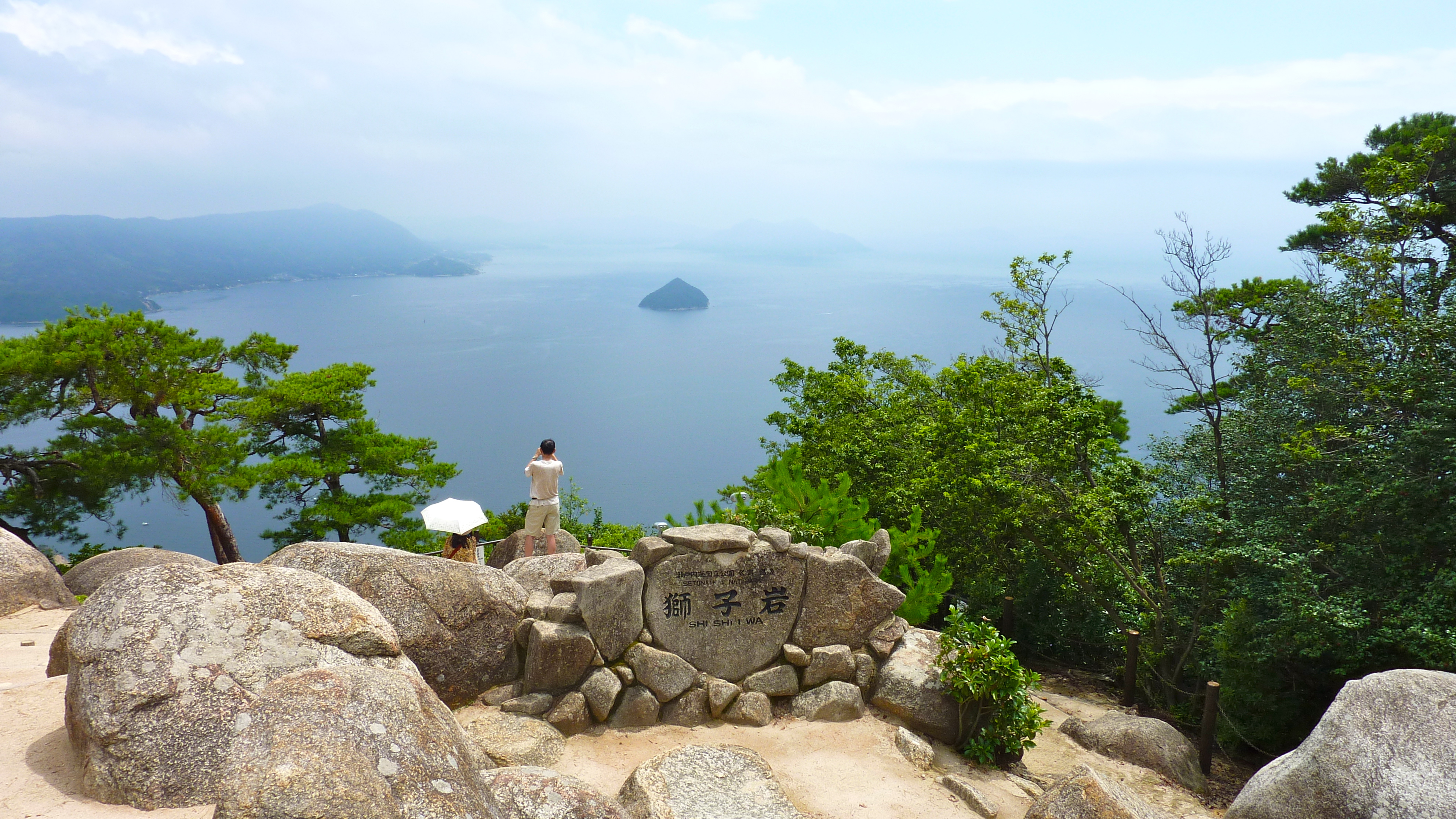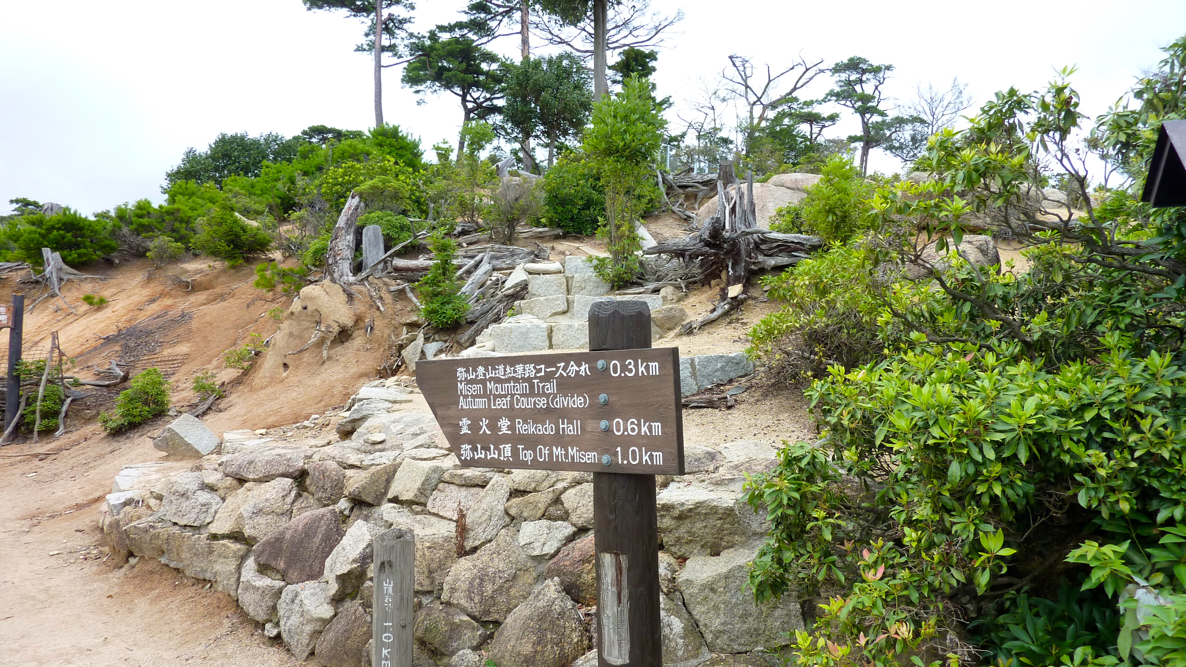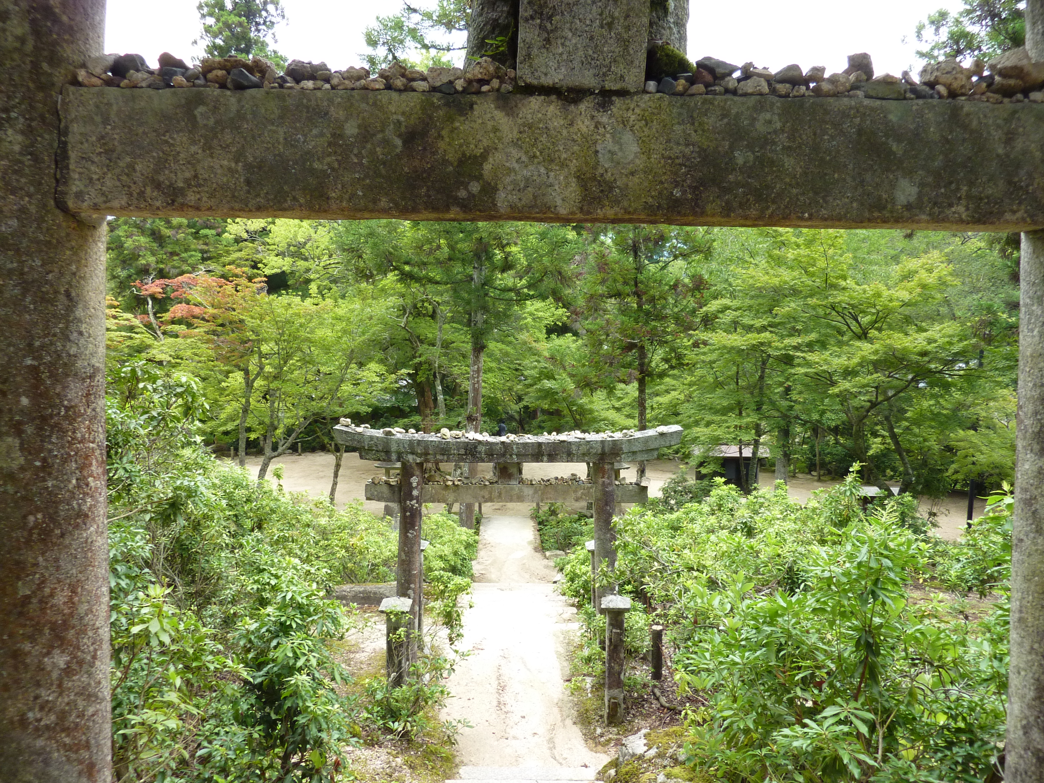 Après une visite du sanctuaire Itsukushima, un temple “les pieds dans l’eau”, et la traversée du parc Momijidani, je prends une remontée mécanique, puis finit par gravir les derniers hectomêtres vers le mont Misen, point culminant de l’île. Le temps change alors, et c’est sous la pluie que je fais la descente pédestrement. Pendant une heure, je ne croise personne sur le chemin -pas même un daim-, c’est impressionant.