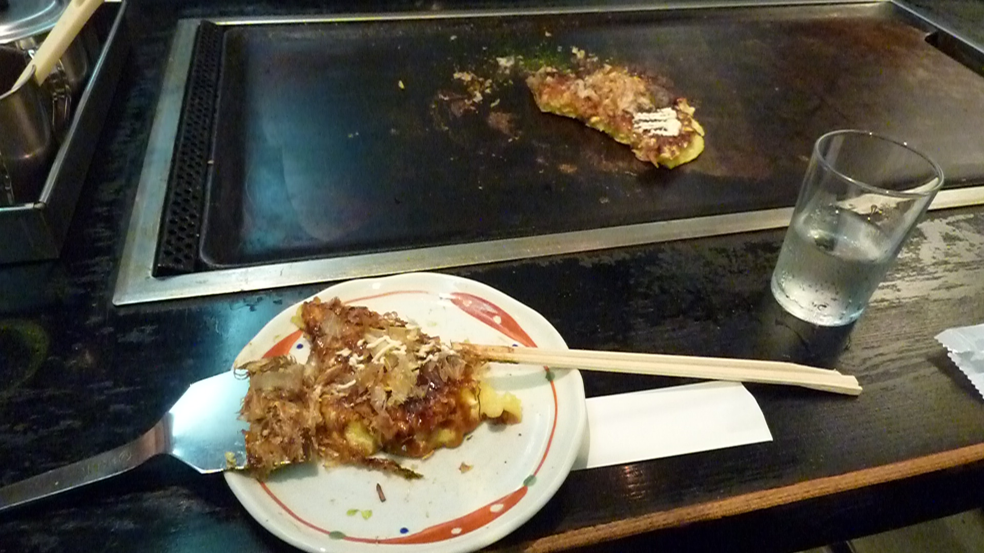 Avant de poursuivre les visites, je m’arrête dans un restaurant d’okonomiyaki, une des spécialités de la région. Il s’agit d’une omelette garnie (pour moi de crevettes), que le cuistot laisse chauffer sur une plaque incrusté dans la table, en rajoutant diverses sauces, des herbes, du Katsuobushi (j’ai appris aujourd’hui ce que c’était, même si j’en ai mangé 4 ou 5 fois depuis que je suis ici). Avec une petite pelle, on se coupe des morceaux que l’on mange pendant que le reste est au chaud. C’est vraiment délicieux et pas cher (ici 700 yens).