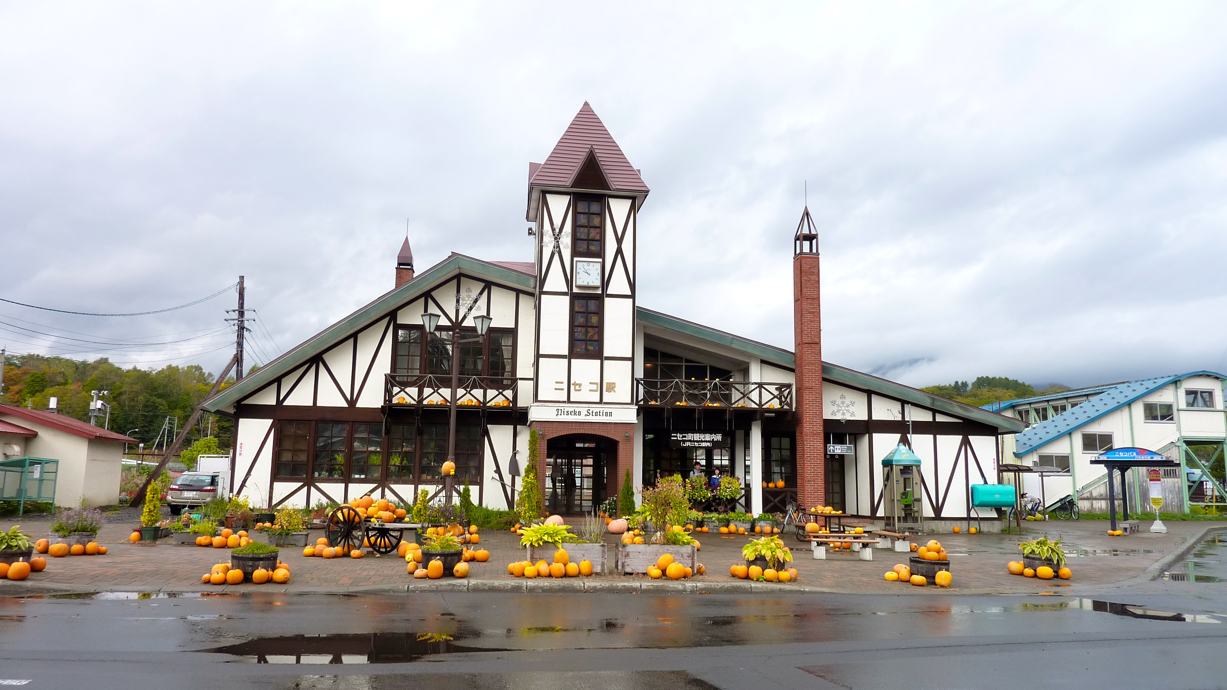 er dans un train dès 7h pour arriver en milieu de matinée à Niseko. La gare est déjà en mode Halloween, et dans toutes les rues des citrouilles apportent une touche de couleur dans la grisaille du temps.Il plût un bon moment, mais pas de quoi non plus faire fondre un breton ou effrayer un Yannick. Après un frugal repas de boulettes de riz accompagné d’un soda au melon, j’ai rallié la gare de Hirafu, par laquelle nous étions passés le matin et qui m’avait intrigué.