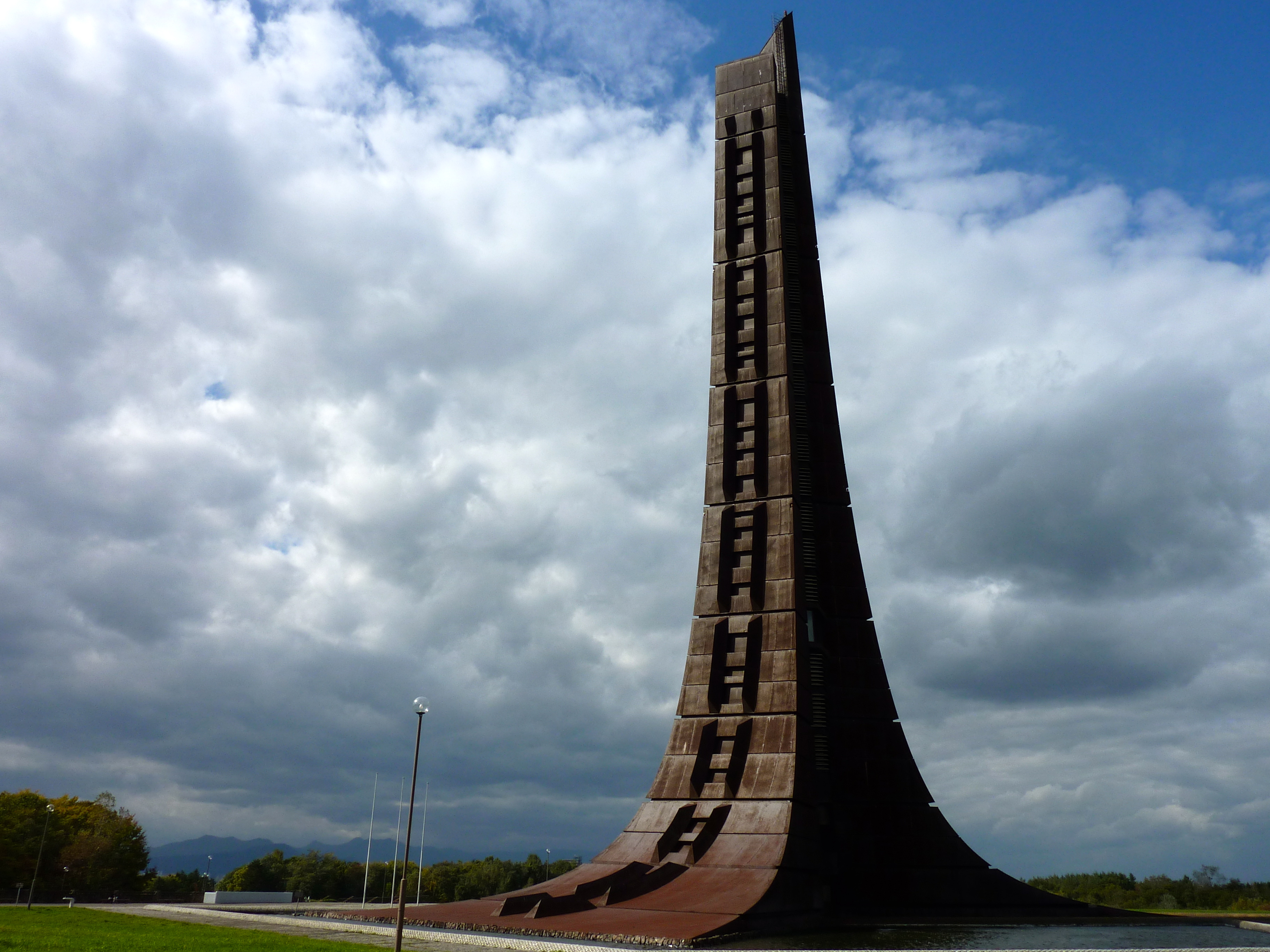 La forêt elle-même est surement jolie, mais les chemins boueux m’ont vite fait rebrousser chemin. Et pas question de marcher dans une bouse d’ours. Aux abords de la forêt se trouve un monument improbable, la tour mémorielle du centenaire d’Hokkaido. Complètement nawak, on dirait qu’elle sort de l’imagination de Giger, et on la verrait bien dans un film de S.F.
