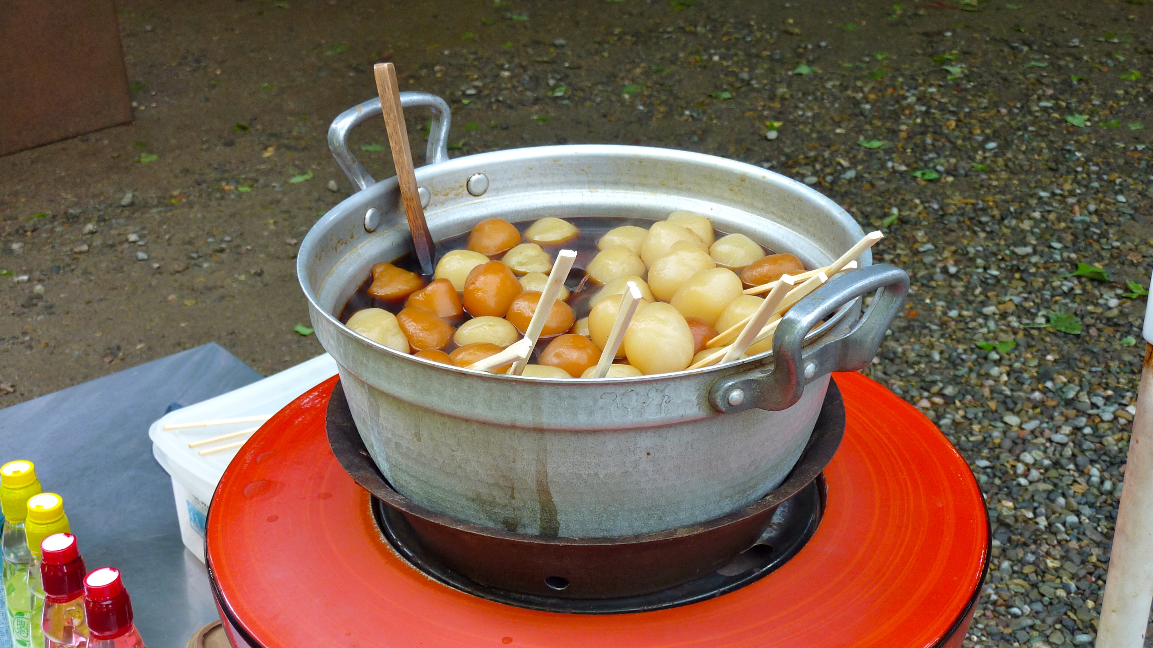 C’est de bon matin donc que je repasse par Sendai pour rejoindre les lieux en train local. Les premières marches sont à quelques minutes de la gare. Sentant qu’il va me falloir des forces, et aussi car ça a l’air d’être la coutume et que c’est amusant, je me sépare de 100 yens pour un bâton de 3 Konnyaku avec moutarde (forte!!!). D’après la photo et sans l’article wikipedia, vous aurez peut-être du mal à deviner ce que c’est. 🙂