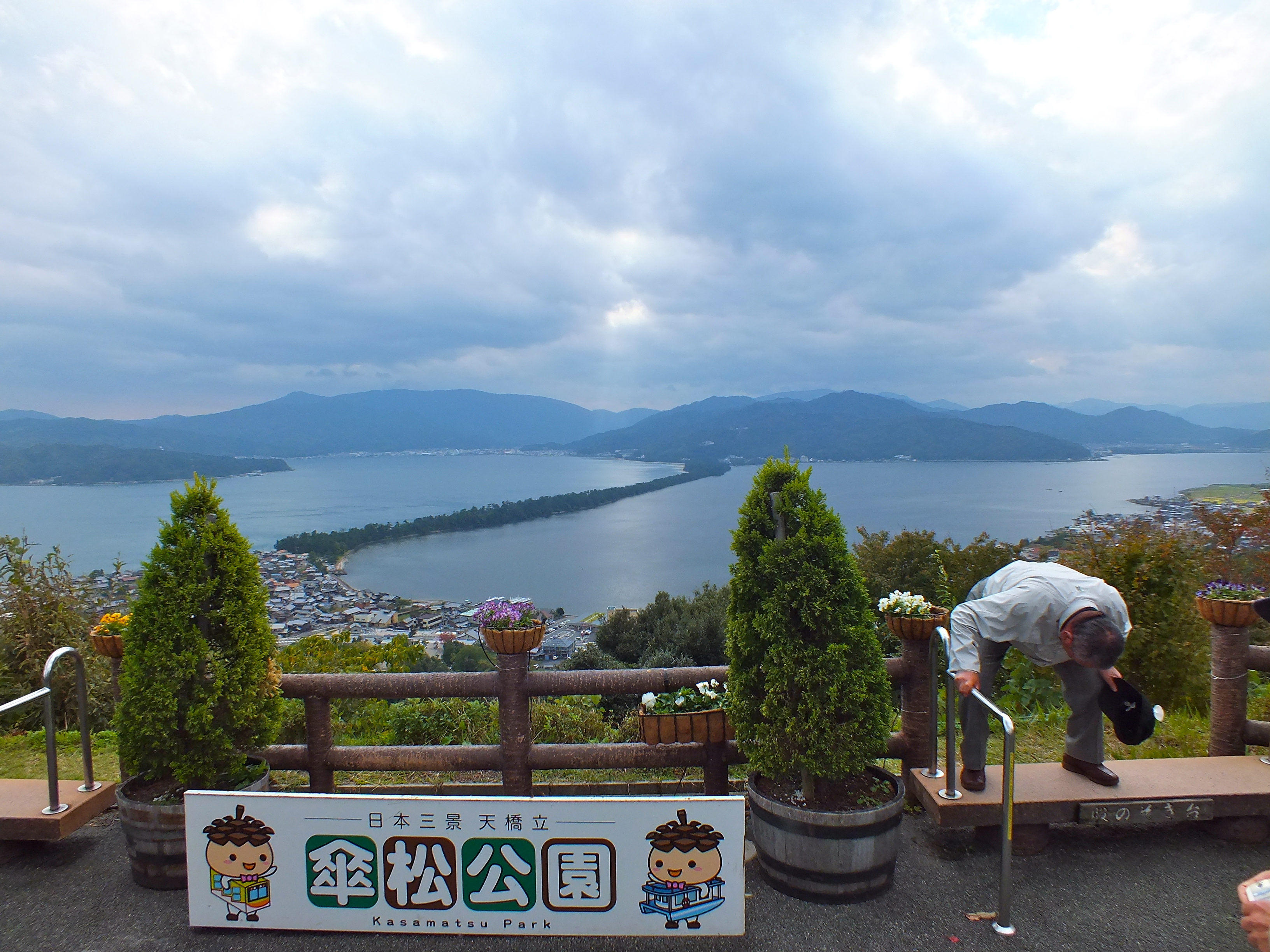 Amanohashidate est situé à une centaine de kilomètres au nord de Kyôto. Il s’agit d’une bande de terre reliant le nord et le sud de la baie de Miyazu, qui s’ouvre sur la mer du Japon. Réputé ici, car il s’agit de l’une des 3 vues les plus cléèbres du Japon. C’est donc le lieu qui me manquait après l’île de Miyajima l’année dernière et la baie de Matsushima la semaine dernière.