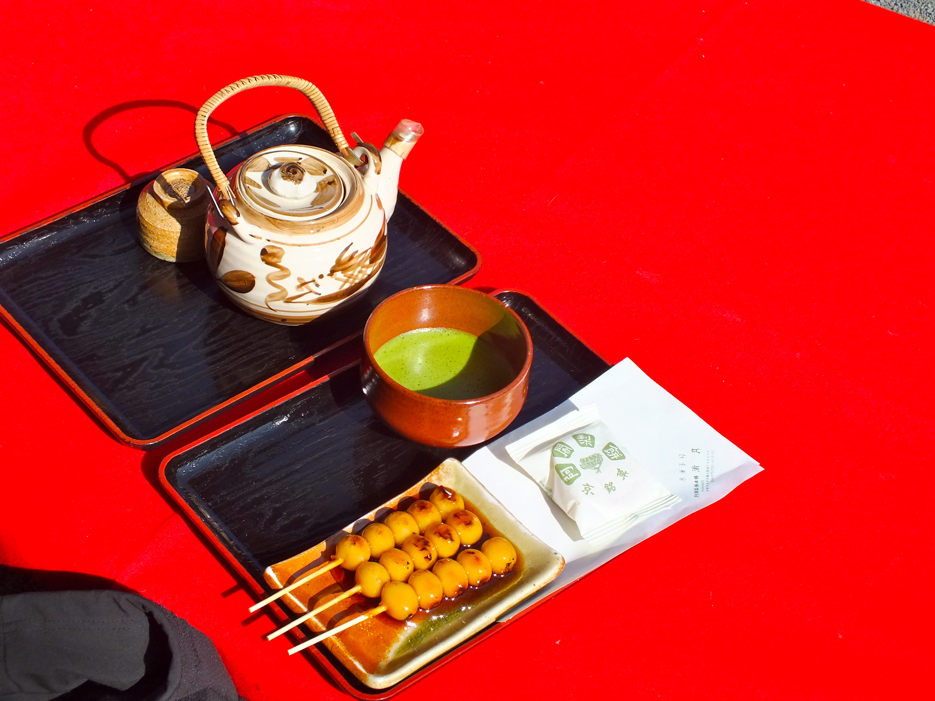 Un moment planant vers midi fut de s’assoir en plein air au milieu des érables sur de petits bancs rouges, de tomber la veste et de profiter du cadre en buvant tranquilement un maccha et en mangeant des dango.