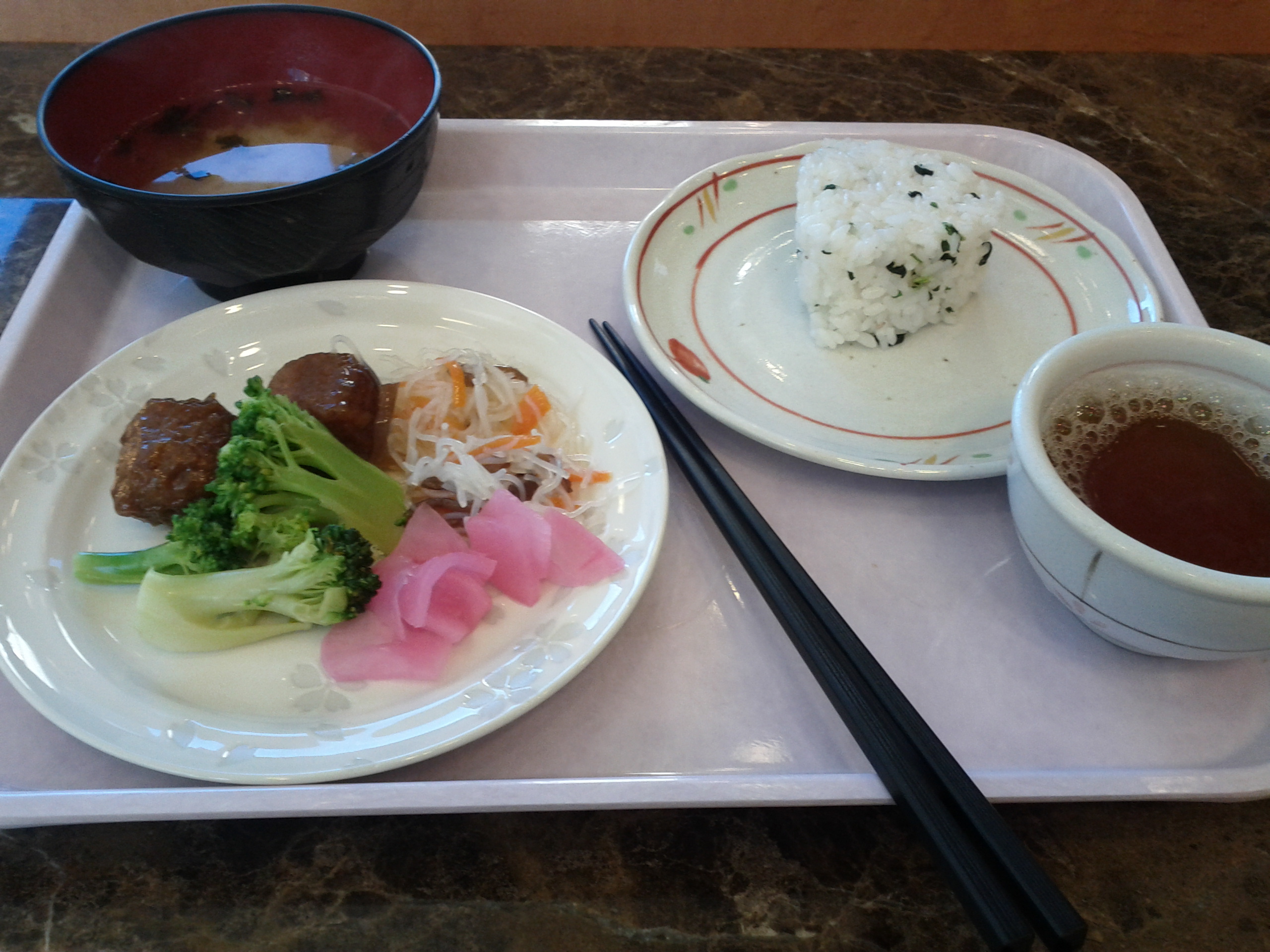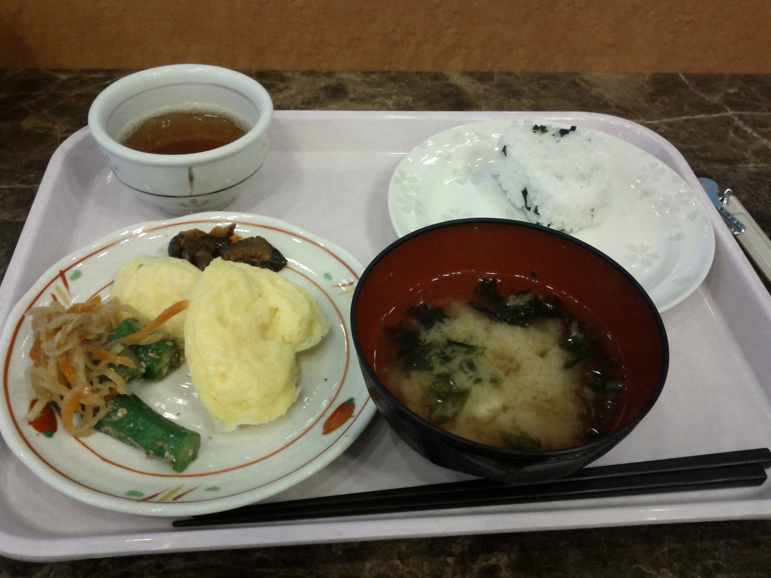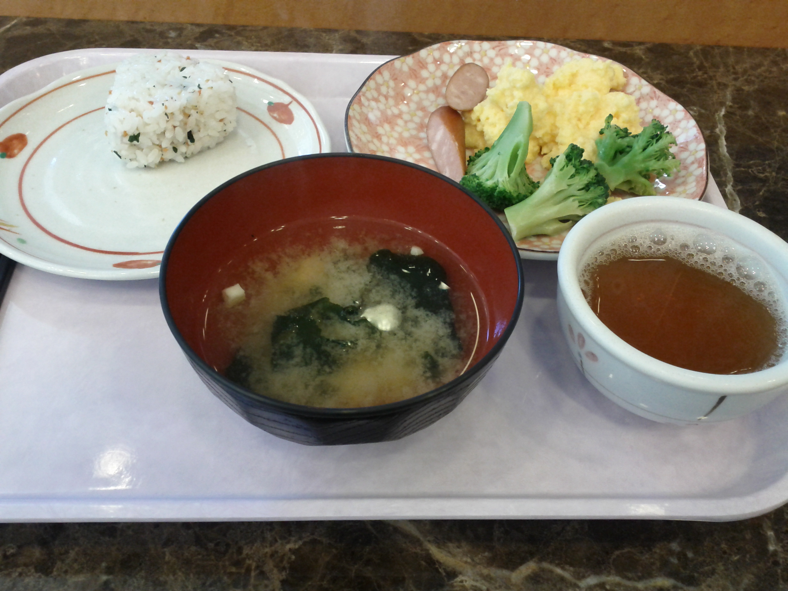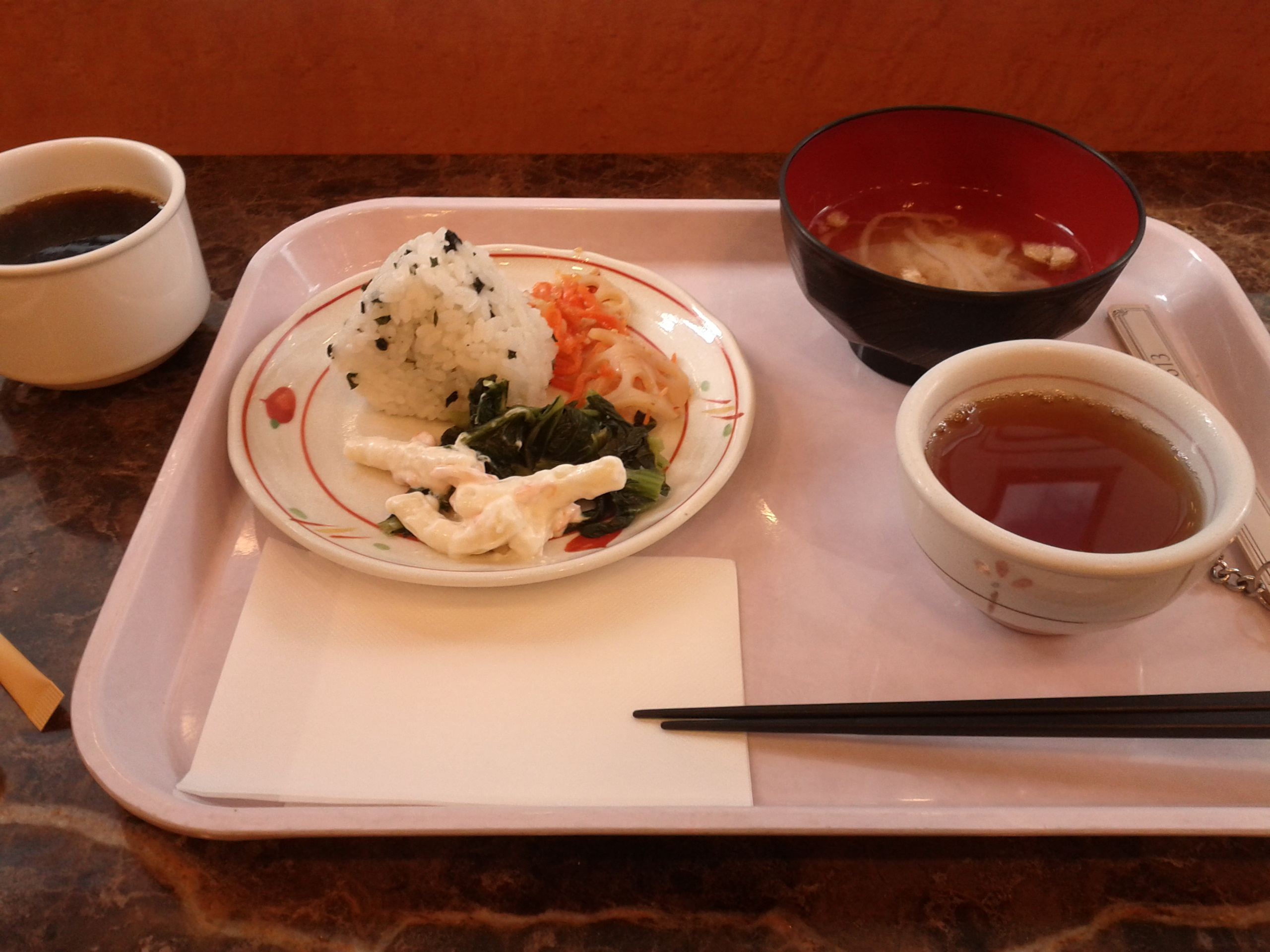 À Aomori, dans un Toyoko Inn, self minimaliste: oeufs brouillés, Onigiri, légumes, soupe et thé: