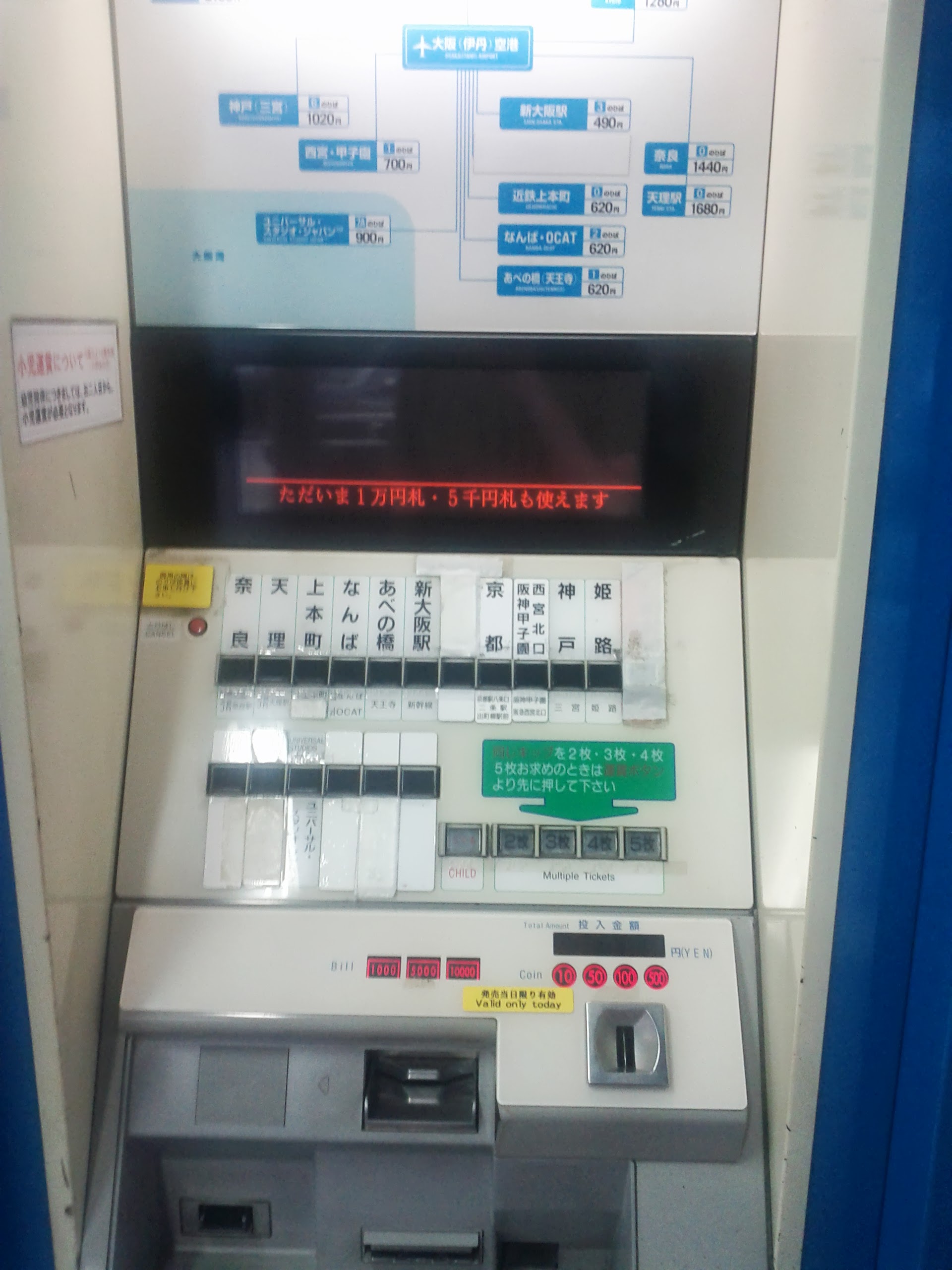 Une bonne vieille ligne de car fit parfaitement l’affaire, une des destinations possibles passant par la gare de Namba, le quartier où je m’installe. Le distributeur était dans la langue de Toshiro Mifune, mais il y avait peu de boutons donc pas trop de risque de se planter.