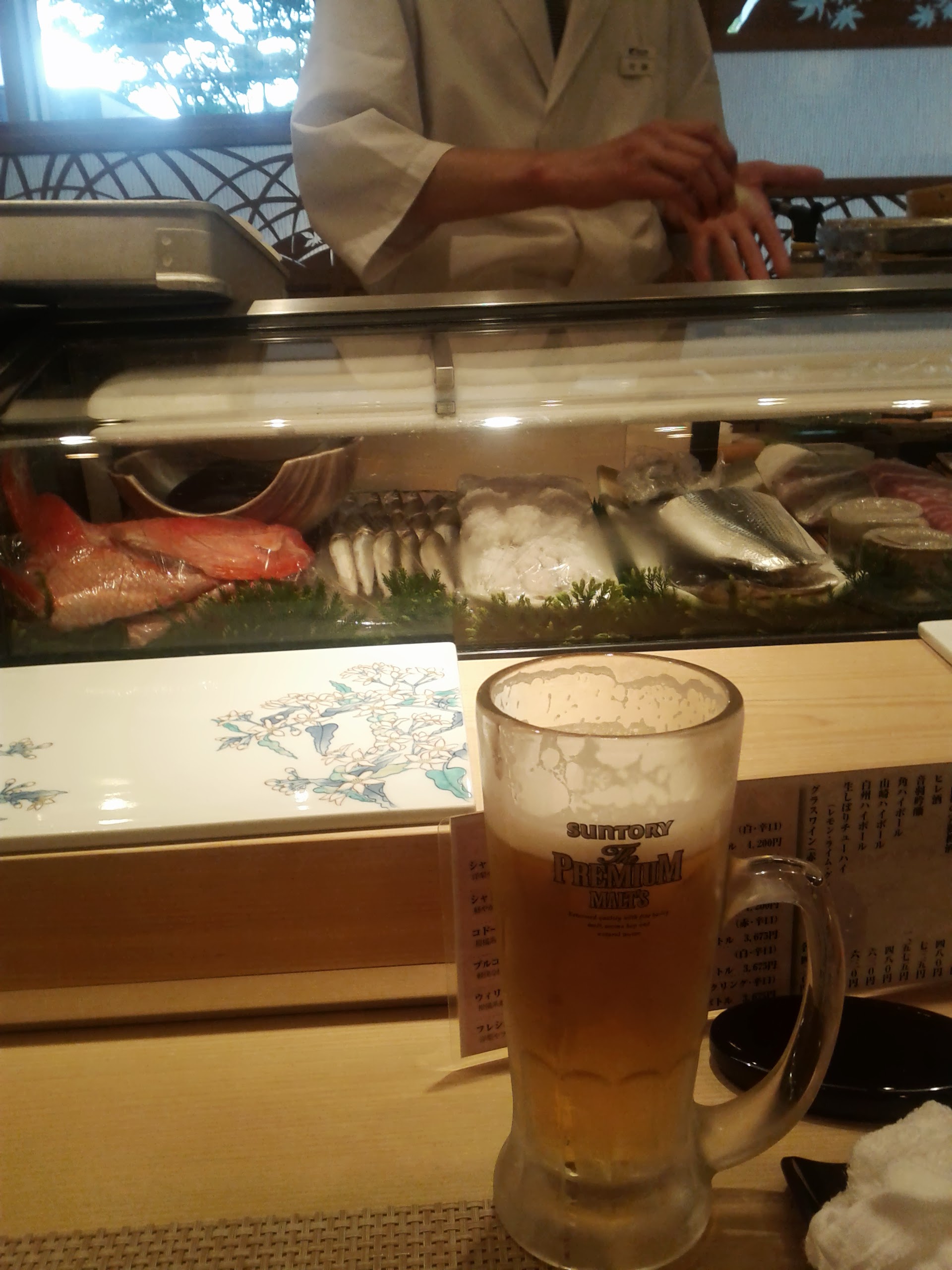 Sushi pour le repas du soir, au comptoir d’un restaurant avec un chef attitré par groupe de 4 ou 5 clients. Je choisis un “Momiji Set” sur la foi cumulée du prix et de la belle photo de la carte. Le chef pose devant moi les sushis au fur et à mesure qu’il les prépare. Pour le premier il indique bien “no sauce”. Je n’en fais qu’une bouchée.
