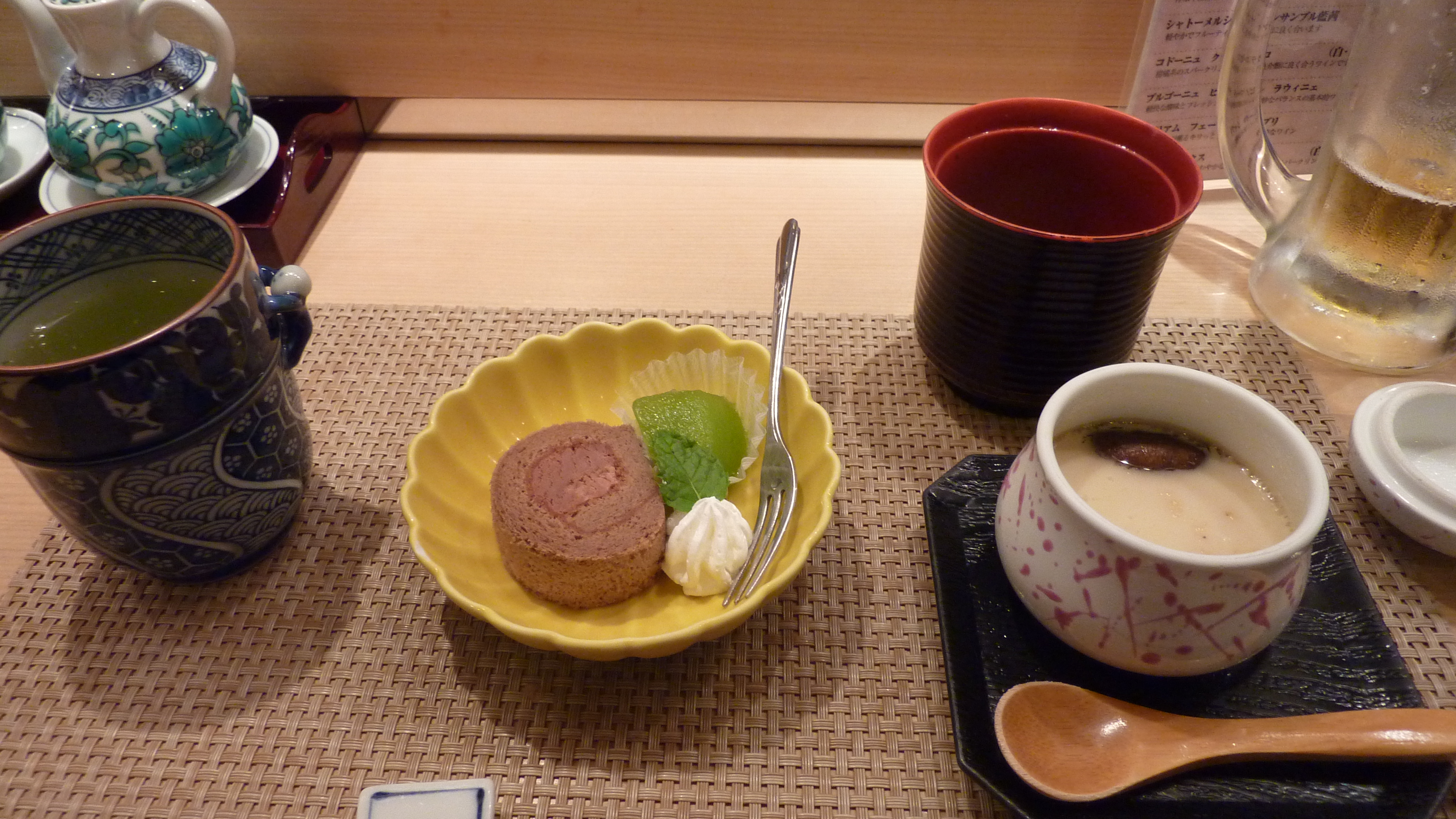 Mais je n’ai pas encore fini la soupe, quand on m’amène le dessert. Et un thé vert. Michiko s’enquiert de savoir s’il faut débarrasser le reste? Pas question, je veux goûter ce qu’il y a dans le pôt. Je finis par manger le “himegu”. Ca ressemble à une sorte de flan aux oeufs avec des champignons donc. Moui.