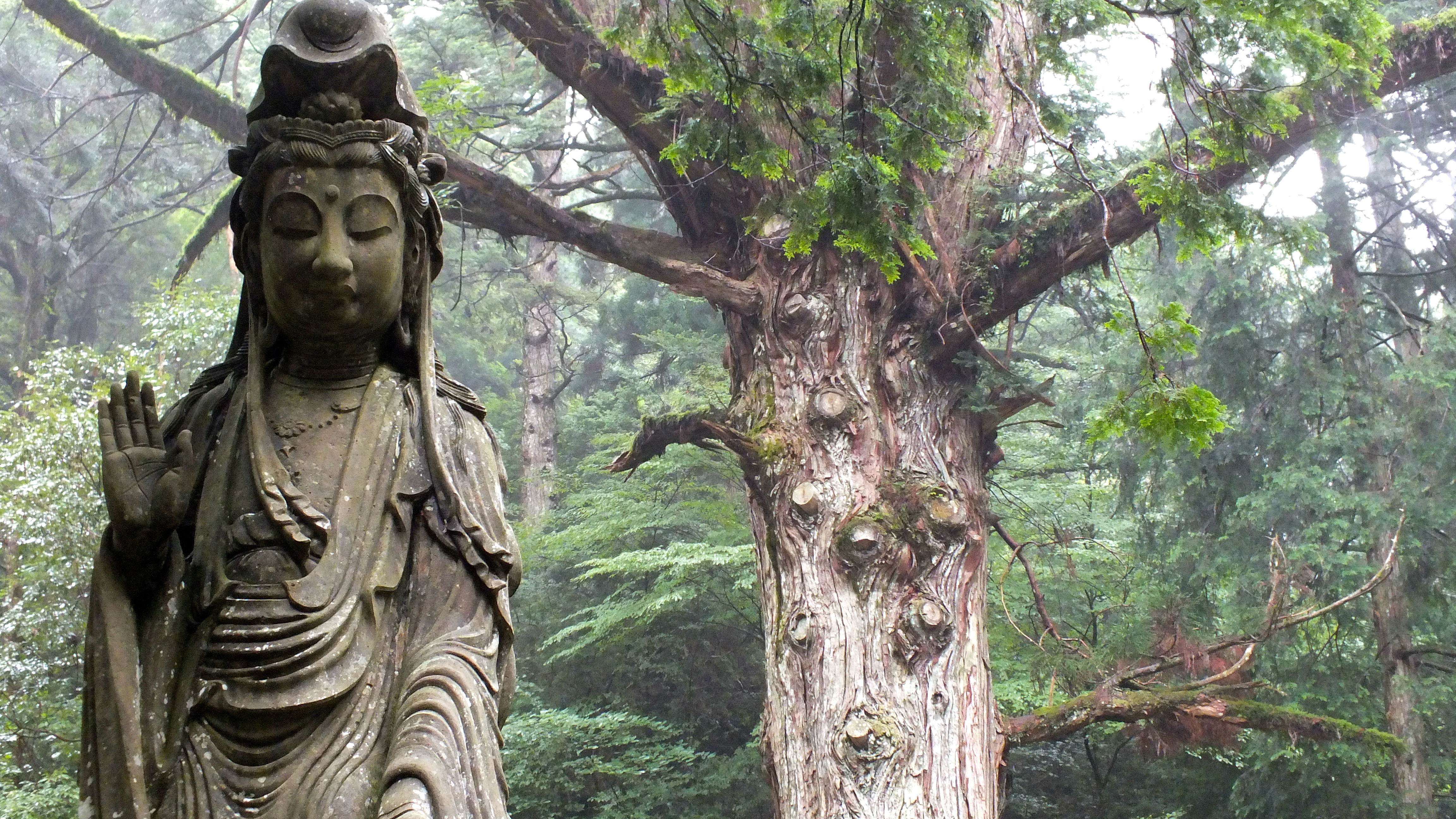 Arrivée à Gokurakubashi (“pont du paradis“), je m’informe du chemin pour me rendre à pied à Kôya. Il y a en effet 2 moyens de s’y rendre: par un sentier, ou via un funiculaire puis un bus. Les autres occupant du train prennent le funiculaire, et je me retrouve tout seul sur un chemin bien tracé, mais sous la pluie. En effet, ce matin ici c’est le règne du brouillard, parfait: C’est très beau et la température est idéale.