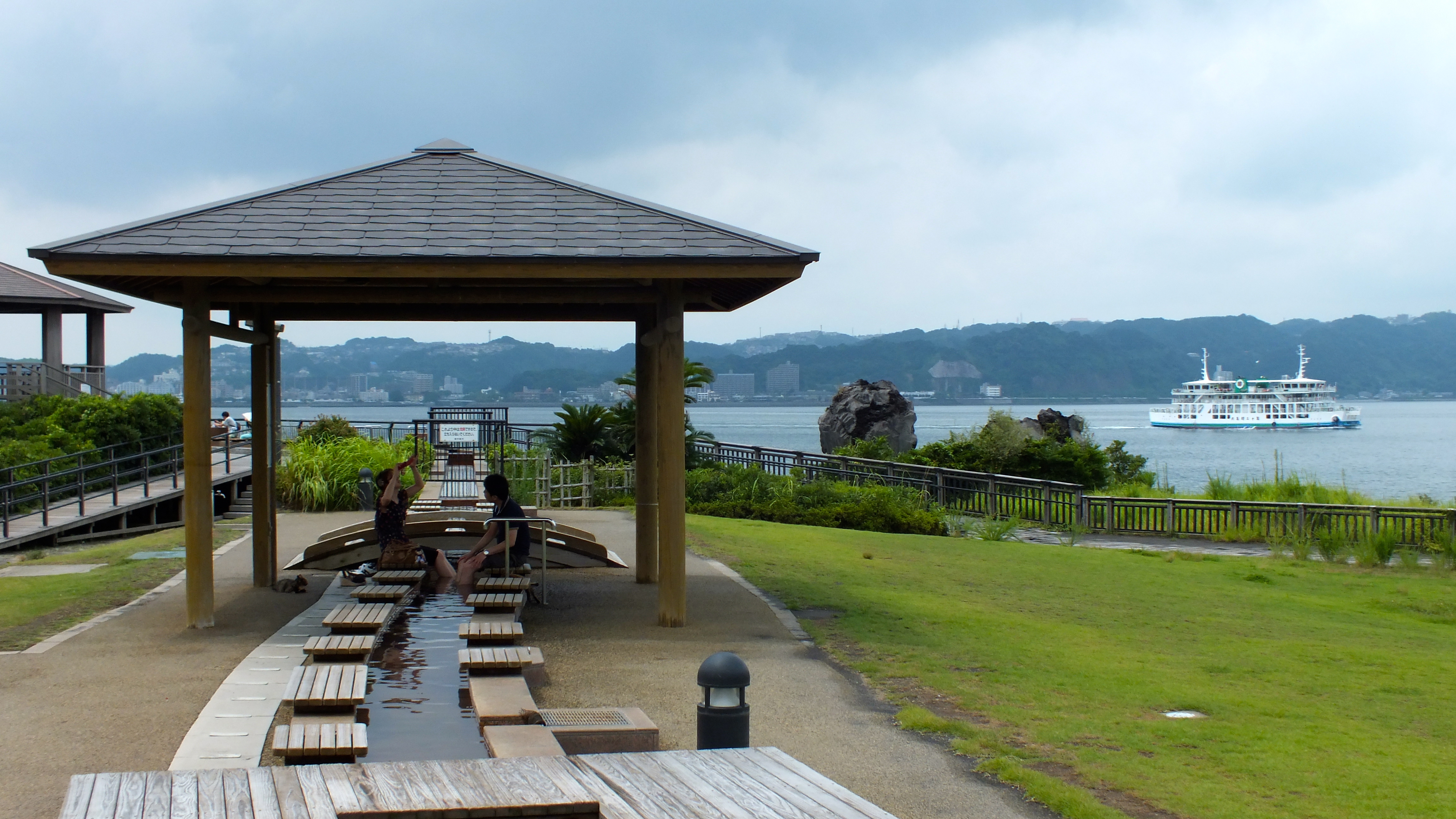 En repartant vers Kagoshima je consulte mes notes: Il y a un parc et un jardin sympa à l’est. J’ai le temps, mon train de retour est dans 3h. Sauf que… Au moment où on débarque, débarque aussi un des plus fameux orages que j’ai jamais vu. Des trombes de flottes et des éclairs de partout, et surtout d’en haut. Les gens qui s’apprêtaient à partir vers l’île, que l’on croise dans le terminal du ferry, ont la mine piteuse. Oui, c’est une contrepèterie.