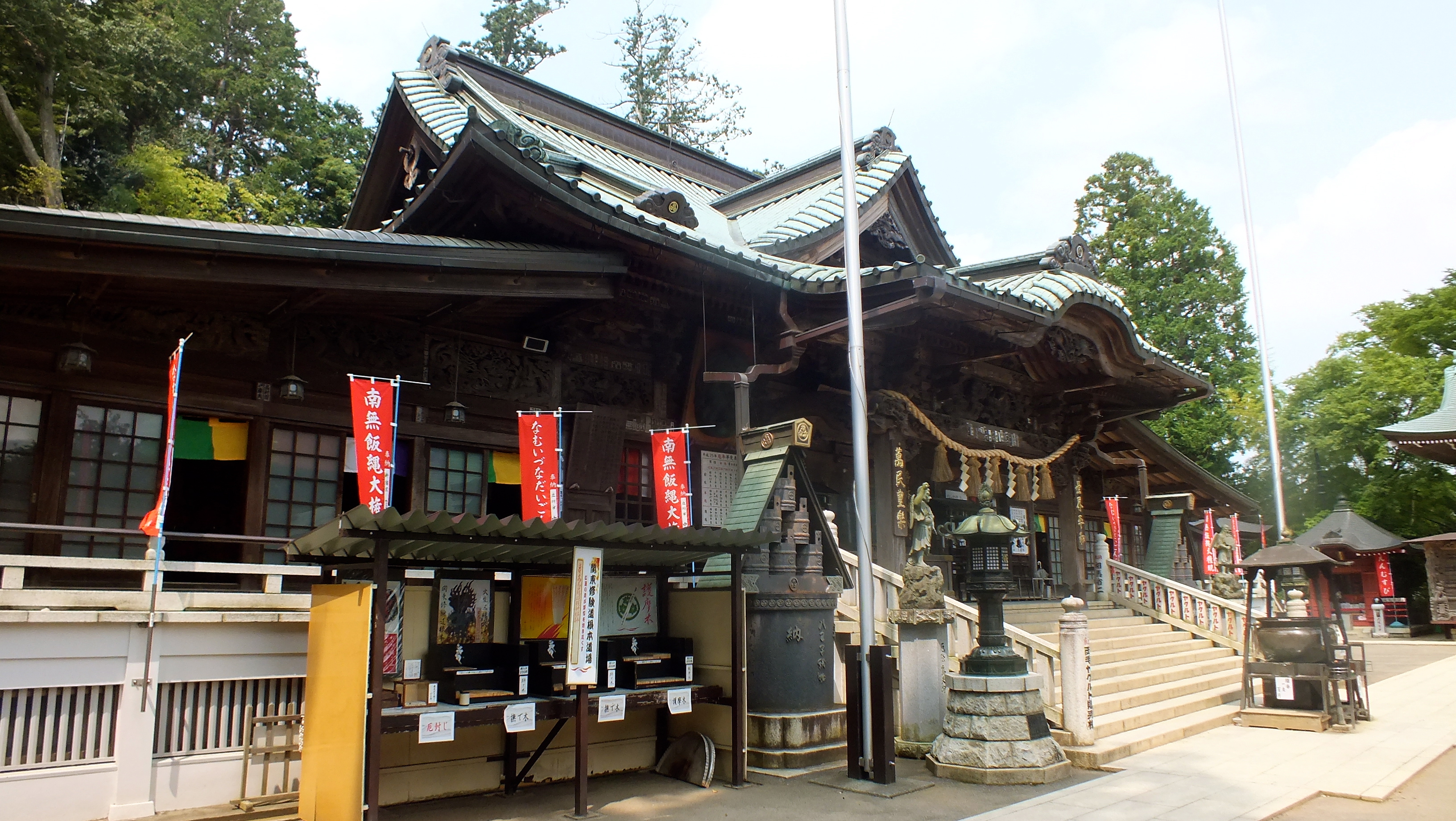 Je parviens au sommet en environ une heure, en marchant bien vite quand même. La vue est bouchée, comme souvent en été. Je redescends par le chemin “classique” au temple bouddho-shintoiste (et oui!) Yakuoin. Le chemin là est large et bétonné. Trop facile.