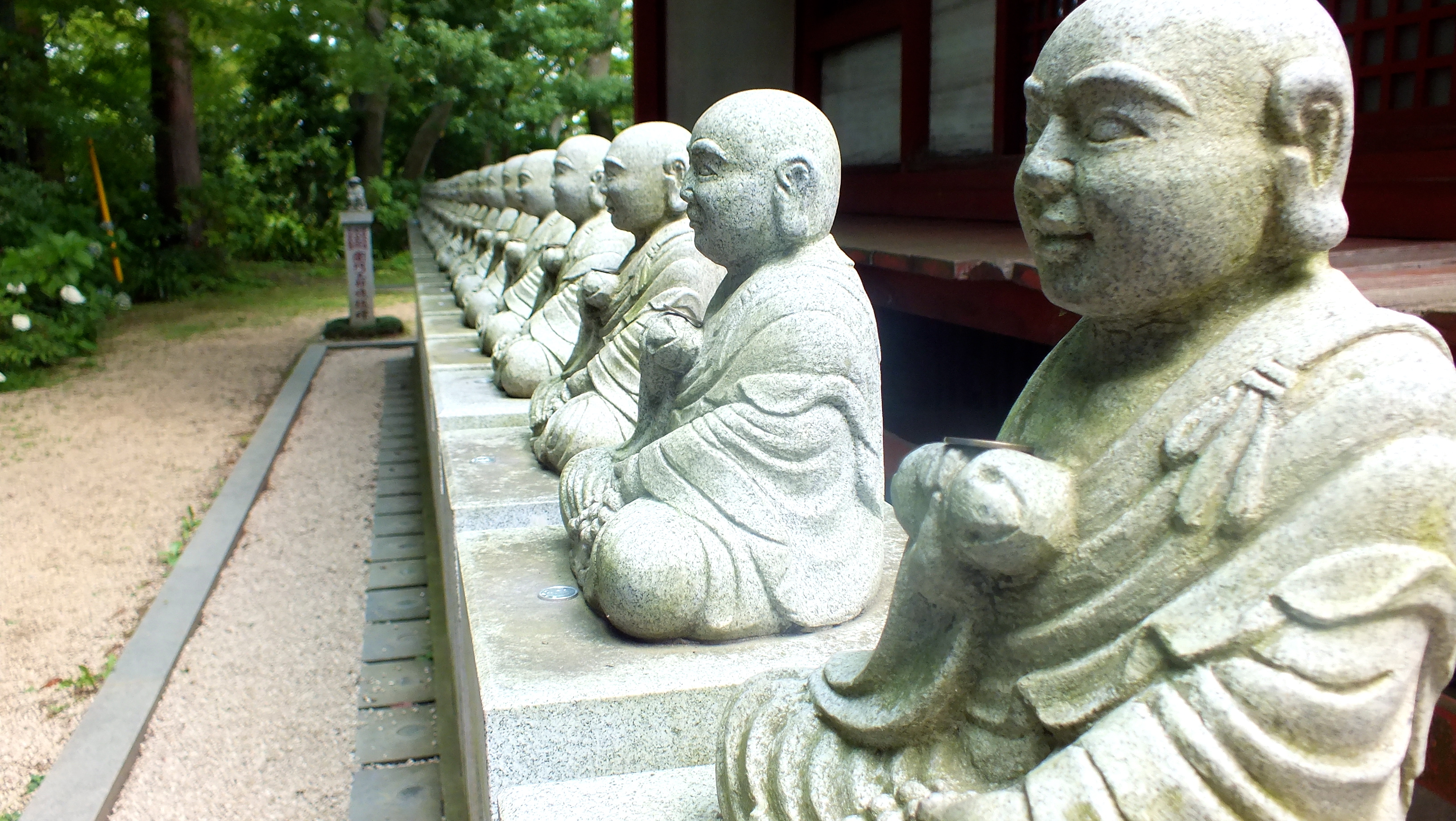 Et puis il y a une grand nombre de statues. Bouddha bien sûr, mais aussi des tengu le long du chemin. En redescendant, une fille était loin devant moi qui s’arrêtait devant chacun d’eux pour s’incliner. Quand je l’eût rattrapée, si j’avais su comment, je lui aurais bien dit: “Eh! Mam’zelle, t’en as oublié une 500m plus haut”.