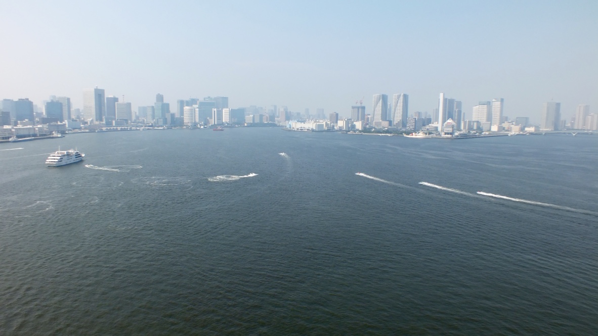 Vers midi, nous prenons le monorail qui va sur la gigantesque île artificielle d’Odaiba et descendons juste avant le Rainbow Bridge. Le but est de le franchir à pied, un rituel perso à chaque voyage au Japon. Le lieu est toujours aussi peu fréquenté, ce qui est incompréhensible tant la vue qu’il offre sur Tôkyô est dégagée. Quelques scooters de mer sont de sortie.