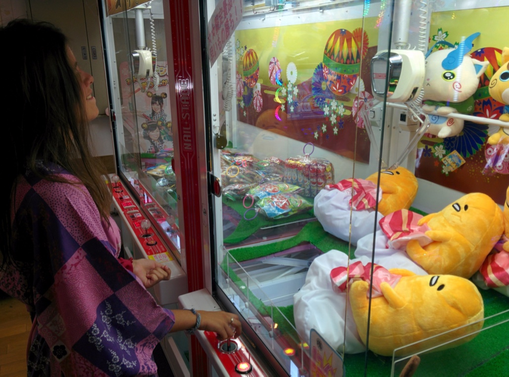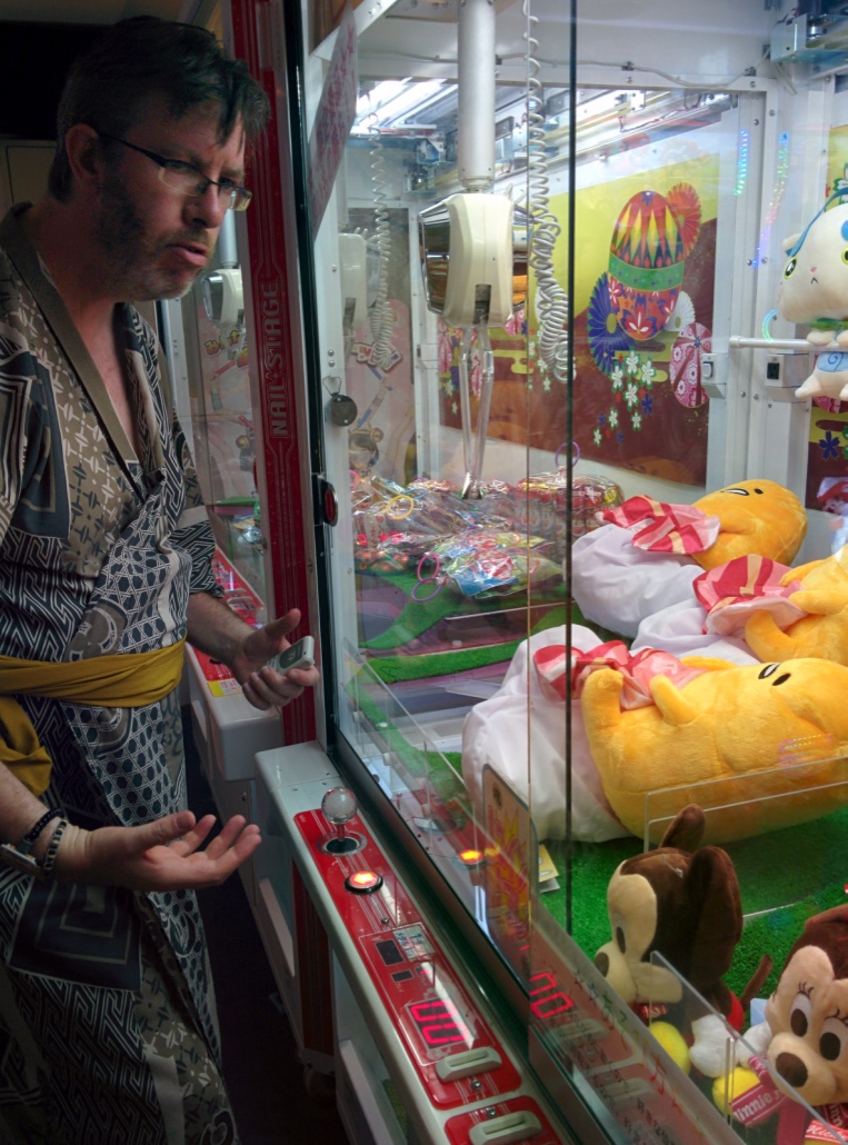 L’établissement est une sorte de parc d’attraction, et delà de l’Onsen, des bains de pieds, sauna et massages on peut manger et se divertir. Ainsi, après le bain, un petit plateau de sushis s’offre à nous, suivi d’une coupe de fuits et d’Anko. Nous dépensons quelques yens au jeu de la taupe ou dans les machines à pince (une institution ici) mais rentrons bredouille.