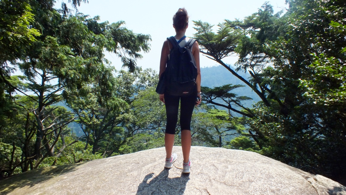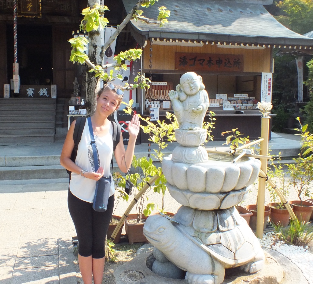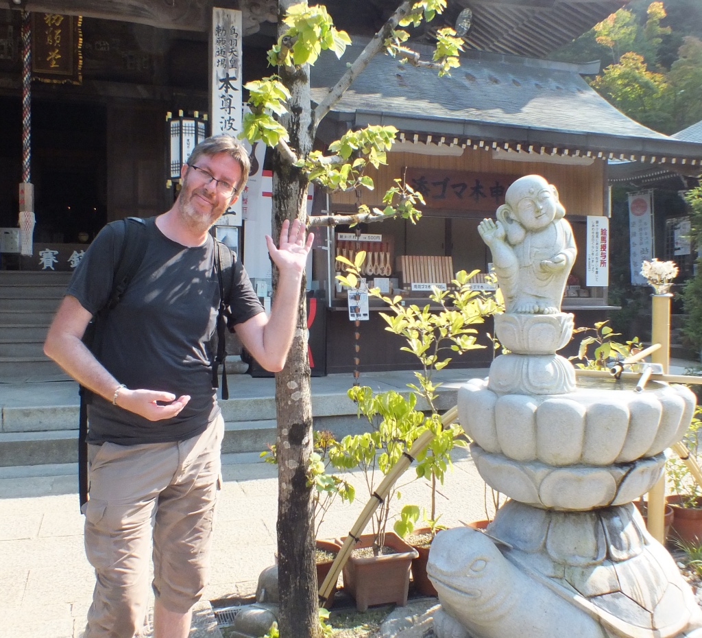Arrivés au sommet, nous prenons quelques minutes pour récupérer et nous émerveiller du décor autour. Ainsi que manger une barre énergétique car notre indicateur de charge interne clignotait. Comme chemin retour, je propose à Valentine celui qui passe par le temple bouddhiste Daishô-in: Motivée.