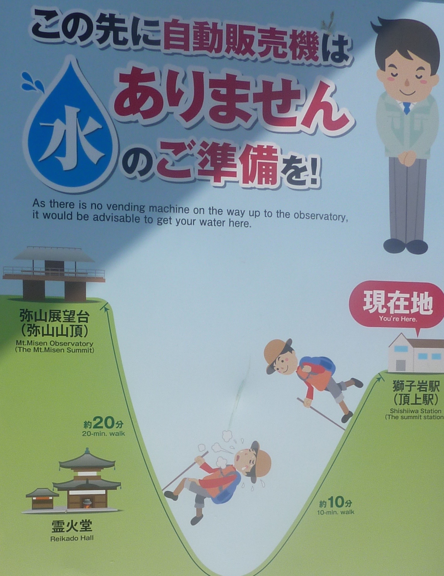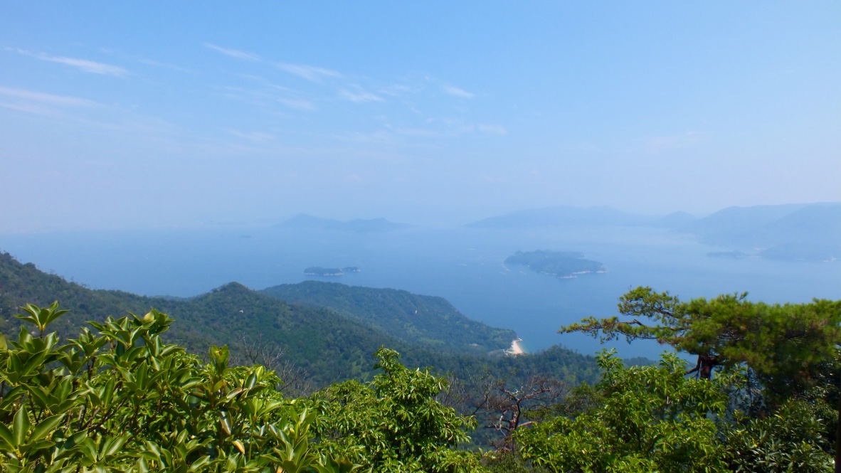 Immédiatement après avoir acheté beaucoup beaucoup d’eau nous entamons la montée vers le point culminant de l’île, qui offre une magnifique vue sur la baie de Hiroshima. Après un peu de grimpette tranquilou, une remontée mécanique nous rapproche du sommet. Plus nous prenons de l’altitude, plus nous distinguons la baie et ses nombreuses îles.