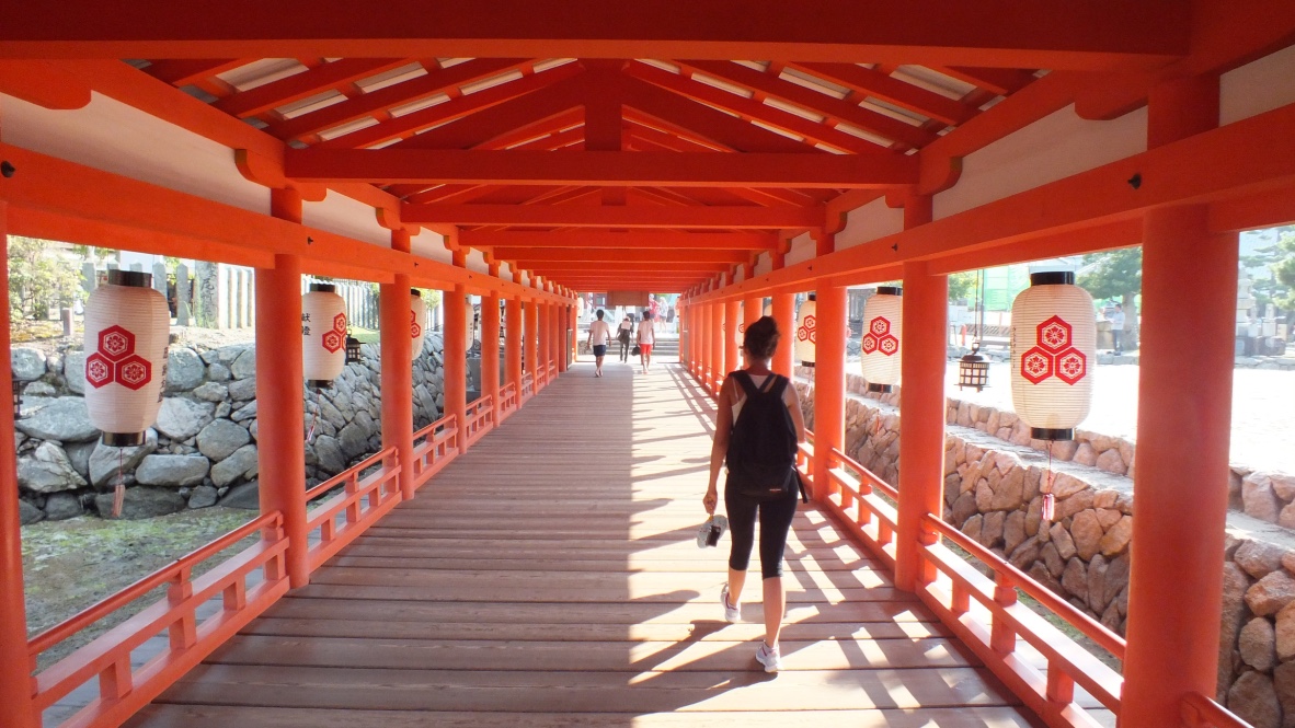 L’heure tourne, il est plus 16h quand nous redescendons vers le temple Shintô qui fait face au torii dans la mer, le sanctuaire d’Itsukushima. Les bâtiments sont tous sur pilotis, mais à marée basse, ce n’est pas la même ambiance vénitienne.