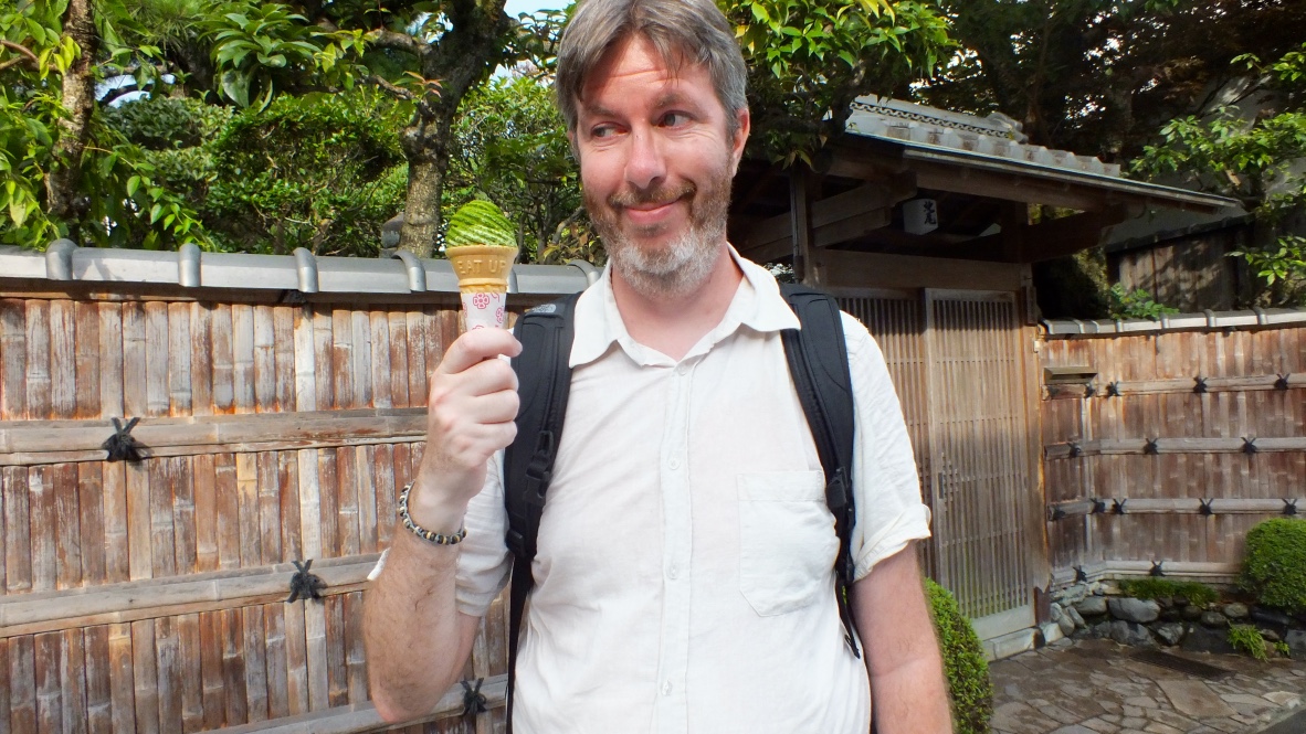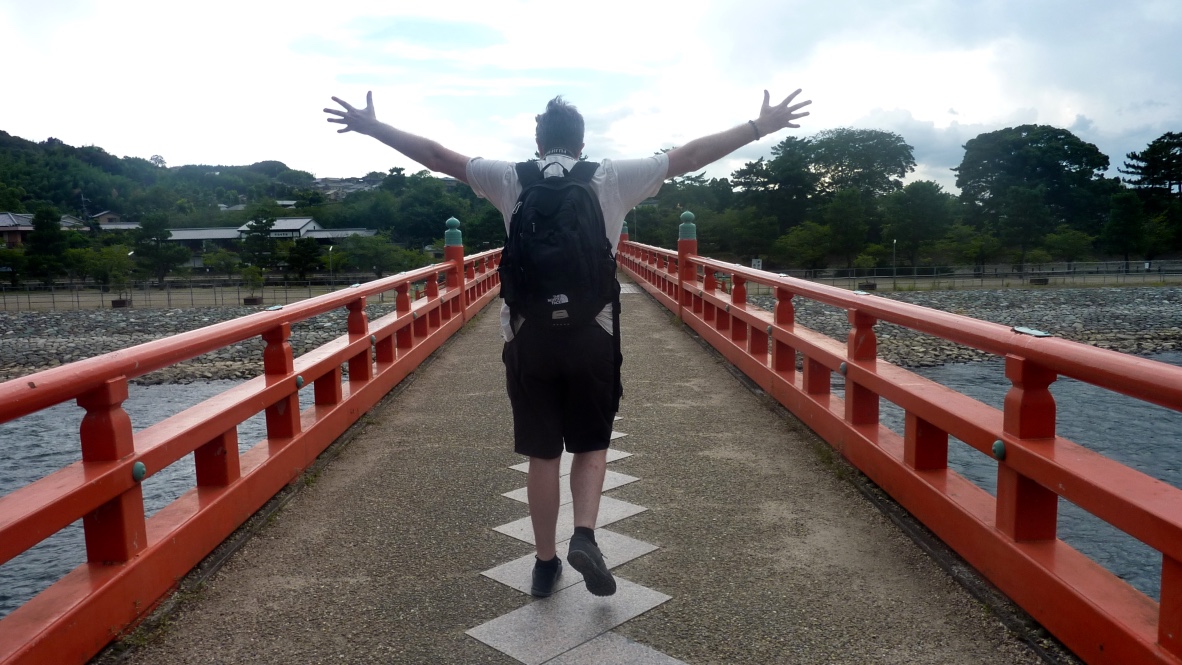 En sortant, nous allons un peu plus au nord voir un temple shintô, l’Uji-jinja, en franchissant la rivière qui donne son nom à la ville. Le pont qui enjambe la rivière est peint dans la couleur caractéristique du Shintô. La plupart des commerces dans les rues que nous prenons ont un rapport avec le thé. Ce ne serait pas sérieux de prendre une glace au sencha mais nous sommes faibles.
