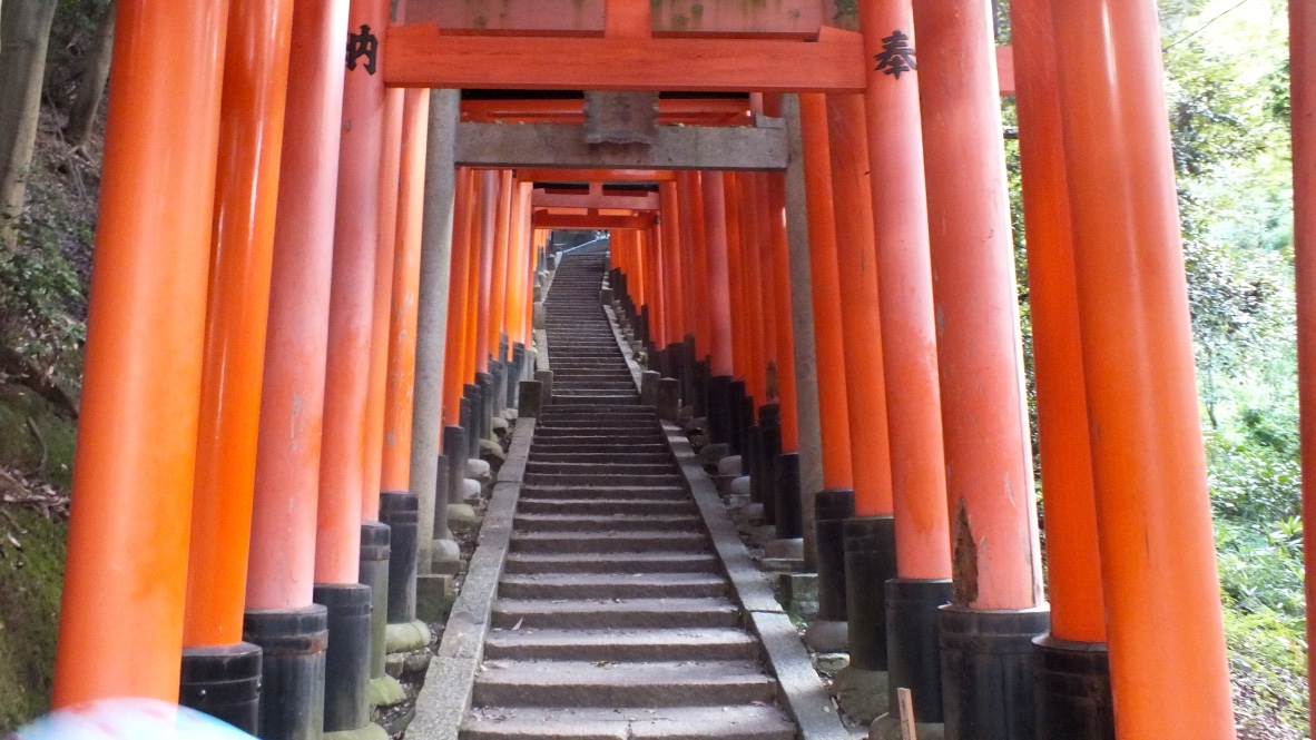 En revenant vers Kyôto, nous descendons à la gare d’Inari pour visiter le Fushimi Inari Taisha. Je m’y étais déja rendu un matin de 2011. Là l’ambiance est différente car le soleil est sur le point d’aller piquer son roupillon quotidien au dessus de nos têtes, pour aller bronzer d’autres keums plus à l’ouest.