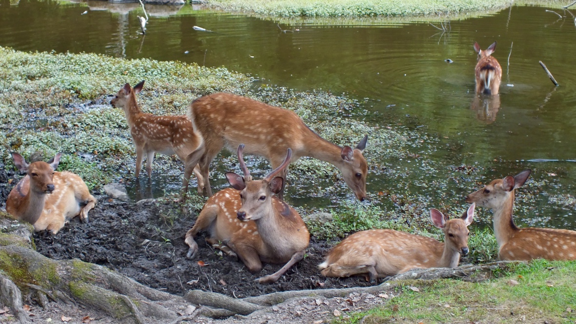 La destination du jour, c’est Nara, capitale du Japon au 8ème siècle. La ville n’est qu’à une heure de train de Kyôto, et possède une ligne de bus qui fait une boucle en passant proche de pas mal de sites intéressants. Les daims sont très nombreux dans les parc et proches des temples. S’ils sont bien éduqués sur le code de la route (ils traversent sur les passages cloutés), ils font popo partout.