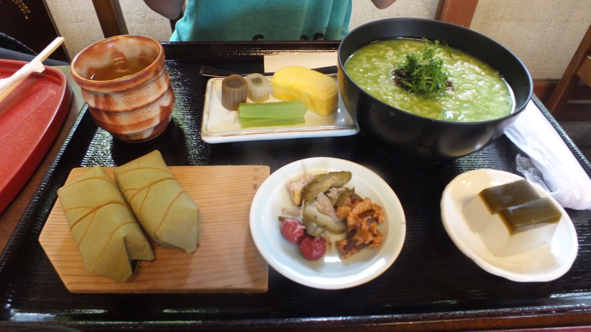Le cumul des marches gravies et descendues hier, et de notre sortie à Miyaji a laissé des séquelles. Valentine souffre des mollets, nous marchons lentement pour moins tirer sur les muscles. Comme repas du midi, nous mangeons local: Porridge de riz et herbes de saison, Sômen, etc.