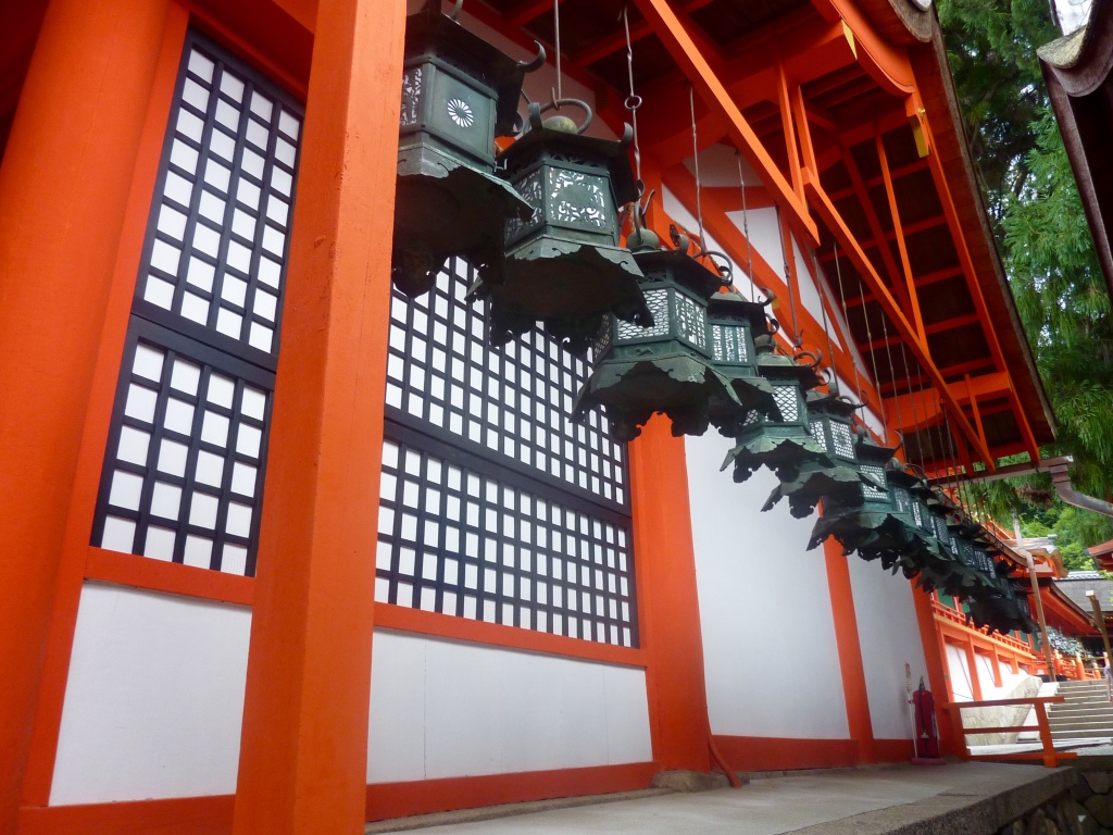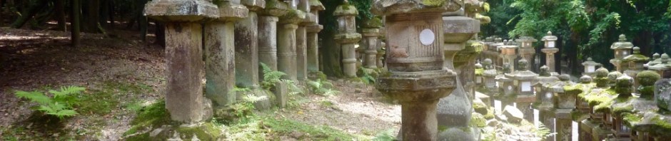 Les chemins alentours et les intérieurs du Kasuga Taisha sont parsemés d’alignements de lanternes, tels des menhir à Carnac (petite pensée du côté de Marina). Nous apercevons des Mikos qui passent ou officient dans les boutiques du temple.