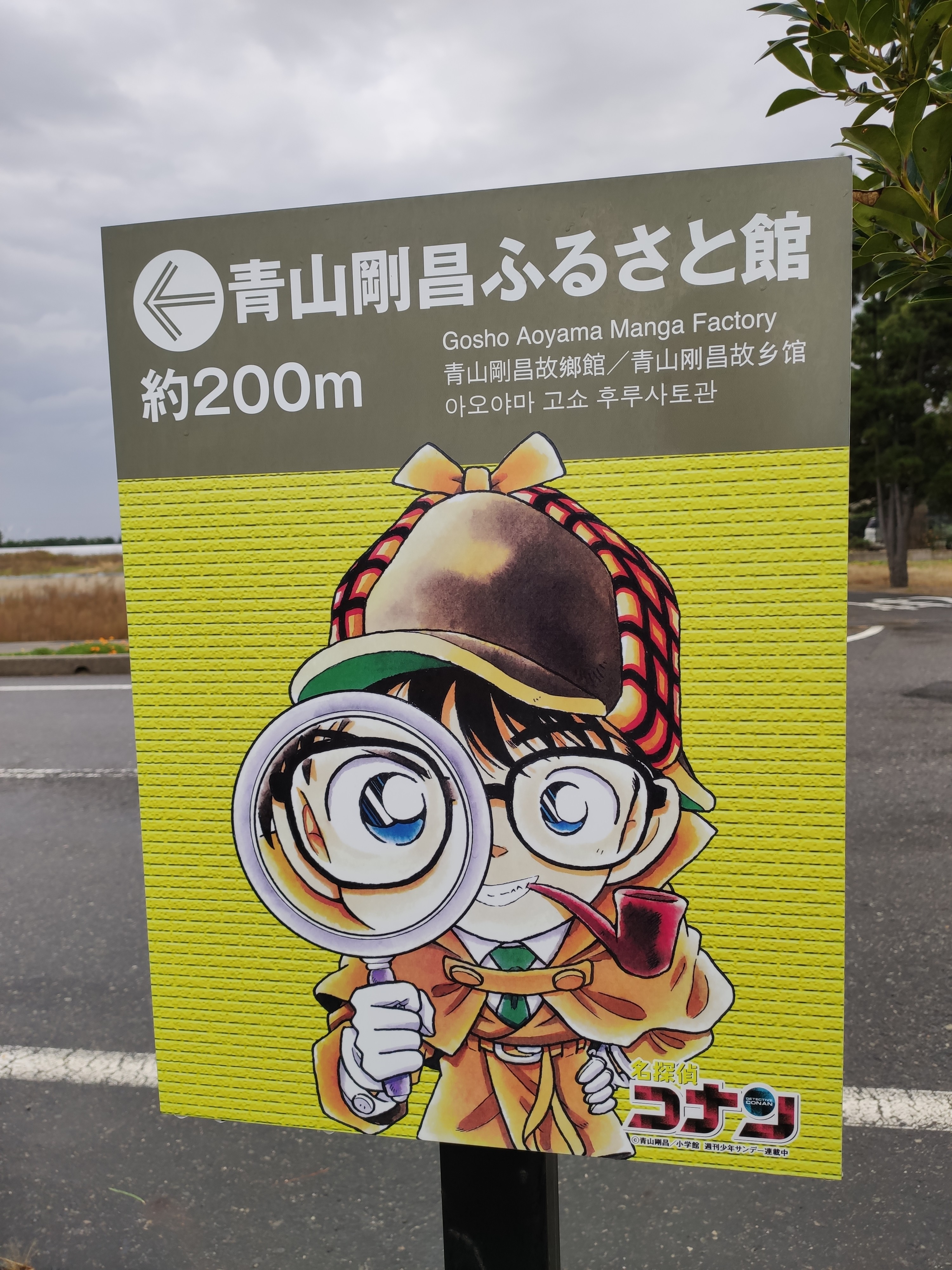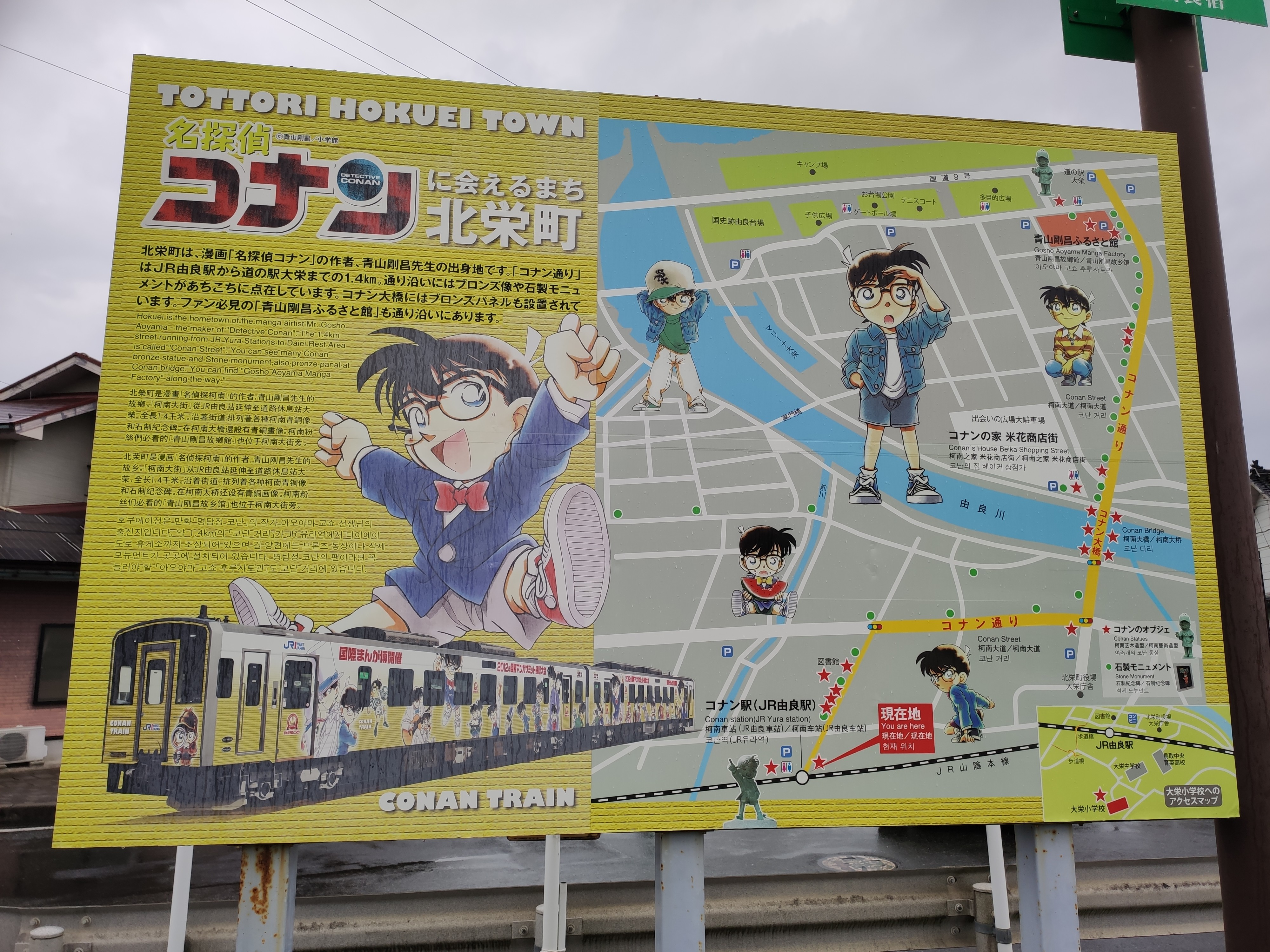 La ville de Hokuei, dans la préfecture de Tottori, est la ville natale du mangaka Gôshô Aoyama, créateur de la série Meitantei Conan, traduite littéralement en Détective Conan en Europe. Le succès du manga s’exprime par sa longévité: 25 ans et pas loin de 100 volumes. La série tv adaptée a dépassé les 900 épisodes, et des films sortent régulièrement au cinéma. Avec One Piece, Naruto et quelques autres c’est une des très grande locomotives du l’industrie du manga dans le monde. Qui tractent du pèze.