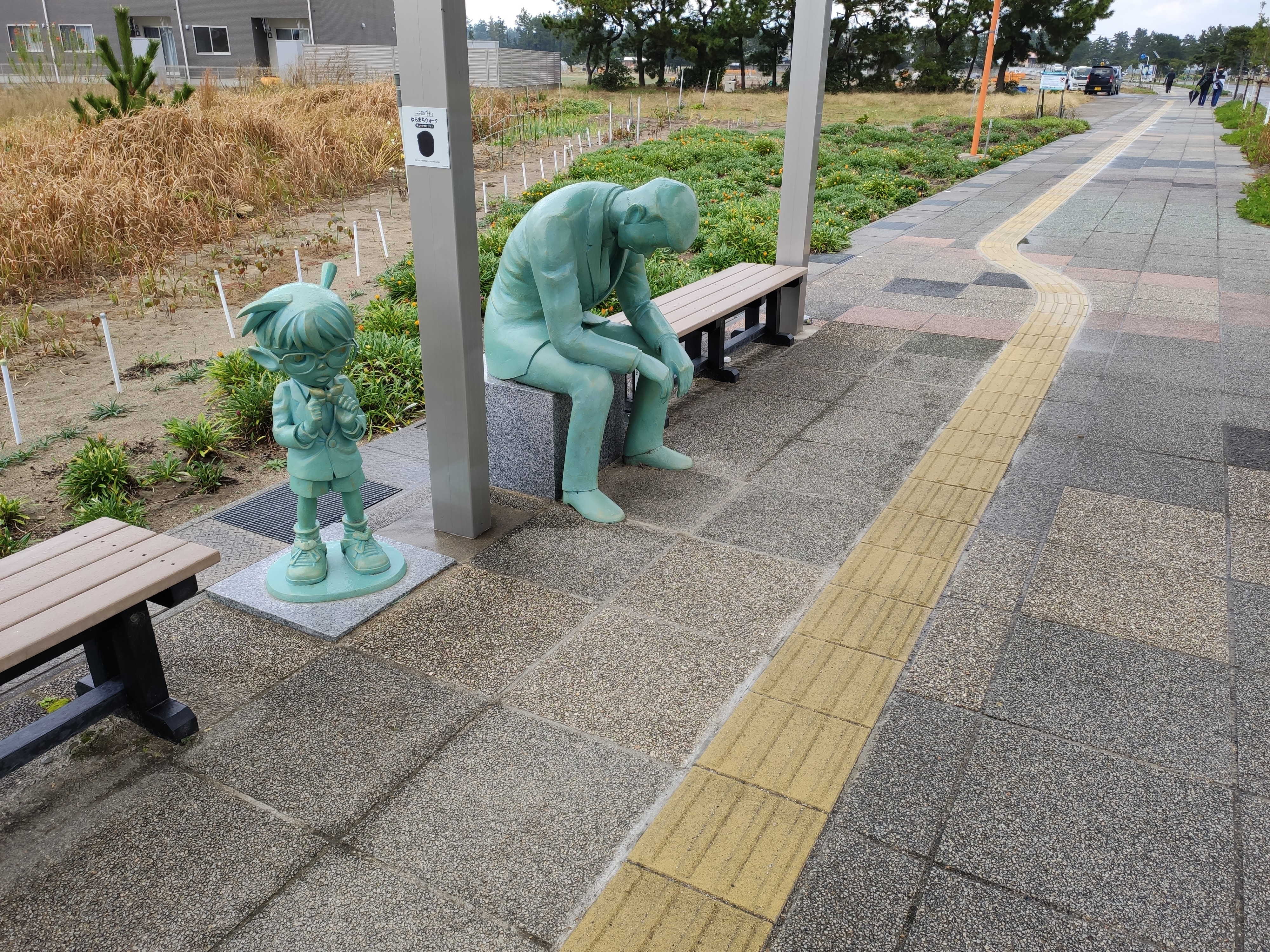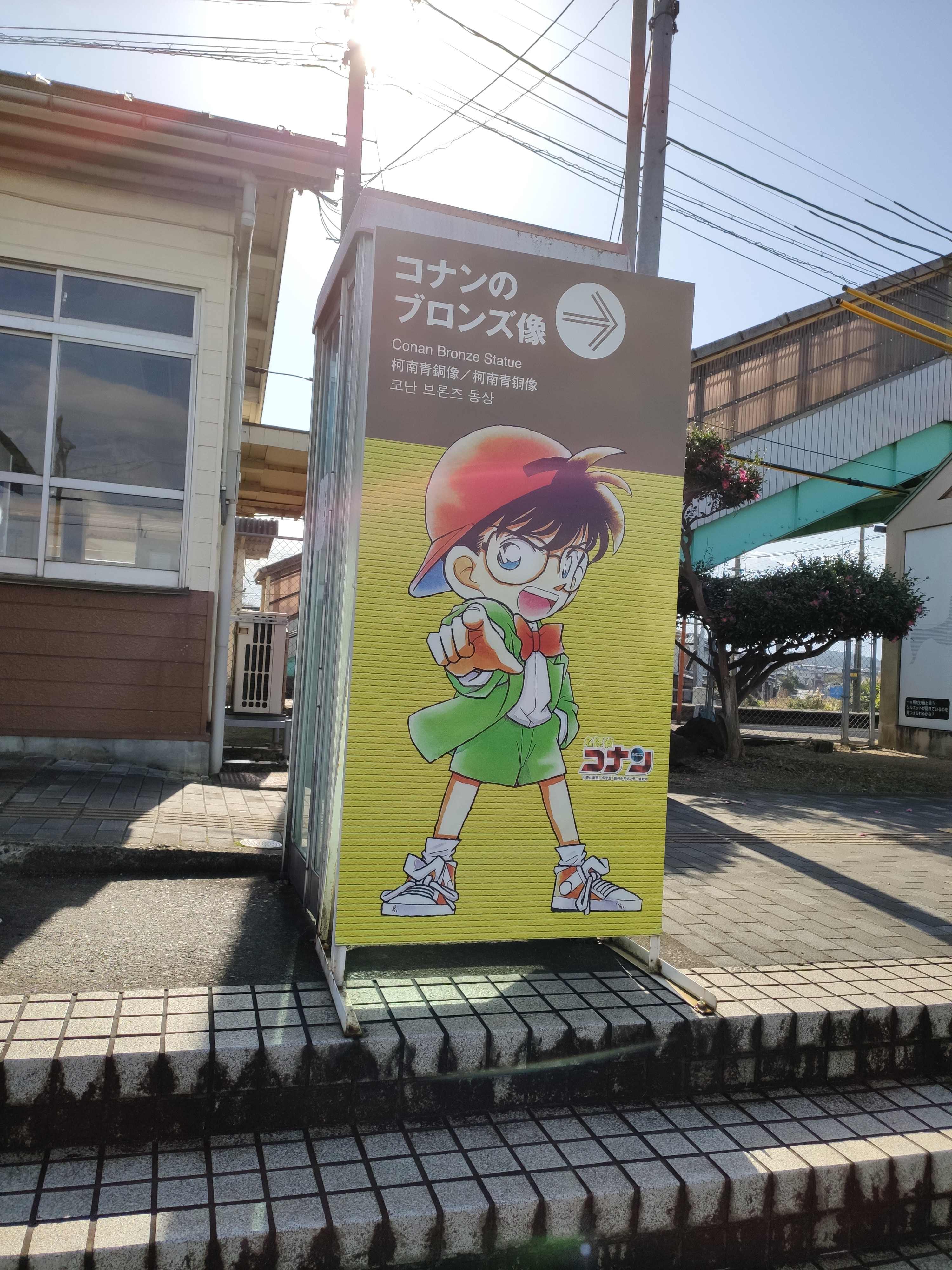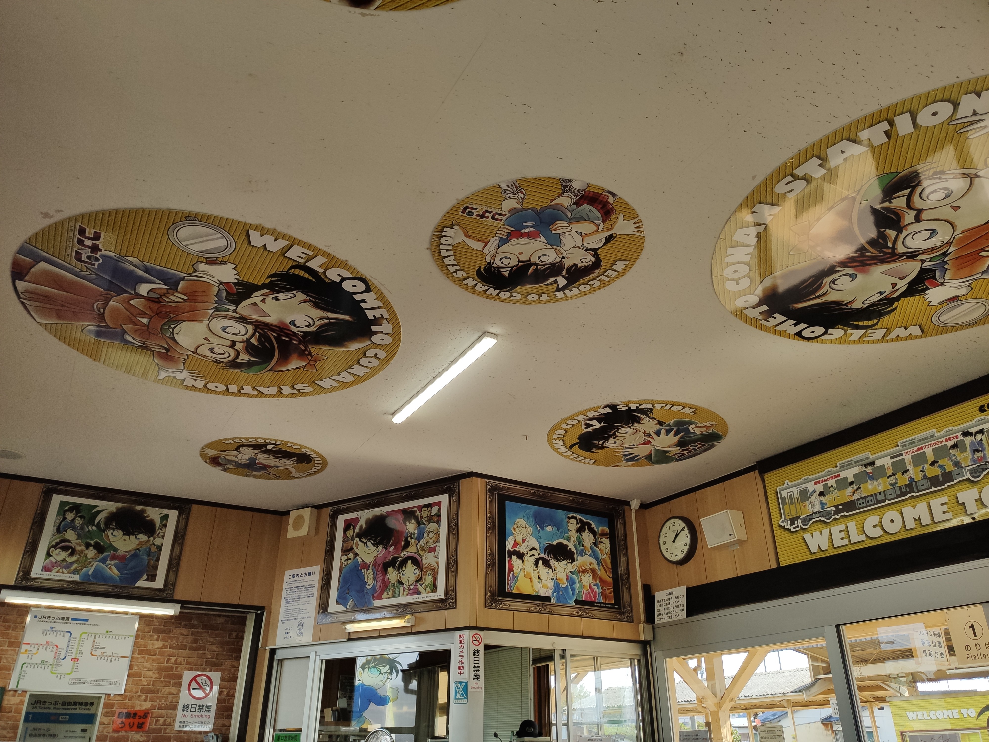 La petite gare de Yura est le point d’entrée principal pour qui veut découvrir la ville où est né le mangaka. Sur les quais, les premiers indices montrent que nous avons bien mis le pied à Conan-Land. Déjà à l’intérieur de la petite gare, Conan est partout, des murs aux plafonds. La gentille cheffe de gare assiste amusée à l’arrivée des visiteurs, systématiquement étonnés. Devant la gare, une première statue et des panneaux avec différents plans de la ville. Avec les différents personnages de Conan évidemment.