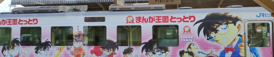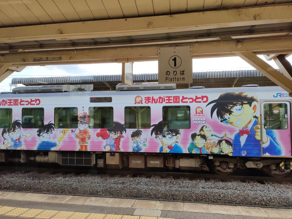 En attendant le train qui me ramènera à Tottori, à l’intérieur de la gare, surprise: le thème de la série TV se met à retentir… Annonçant pendant une minute qu’un train décoré Conan arrive sur le quai. Le Japon.