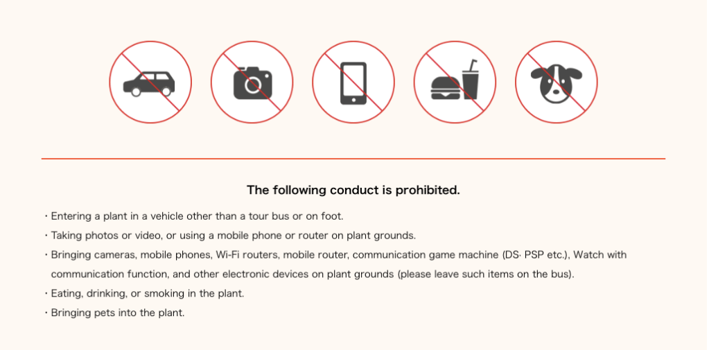 Des consignes étaient données dès l’inscription, pas de vidéo ou photo dans l’enceinte de l’usine, ni même une PSP ou un routeur wifi. L’essentiel de la visite se passe sur une coursive tout en haut du plan où travaillent les travailleurs et les robots. En sus de limiter l’espionnage industriel, empêcher les touristes 5 mètres au dessus de ta tronche de te prendre en photo deux heures par jours, c’est un mieux pour l’ordre social.