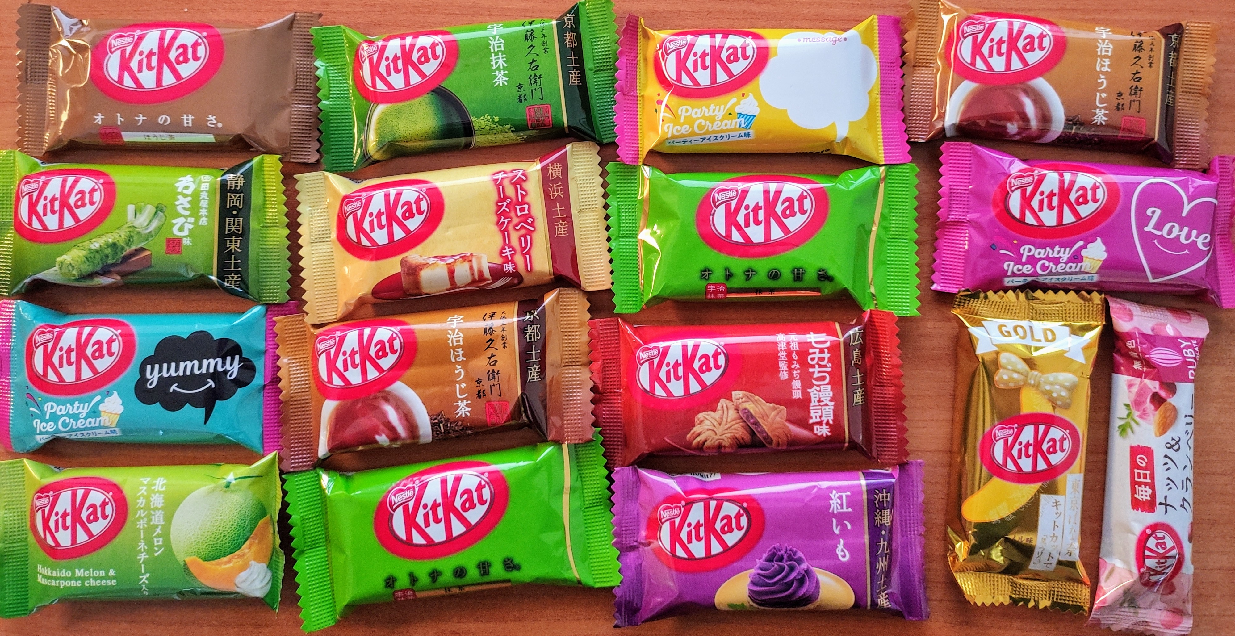 Les différentes variétés de Kit-Kat ramenées de ce voyage: Patade douce, Melon-mascarpone, Cheesecake fraise, wasabi, thé, Tôkyô Banana (beurk)