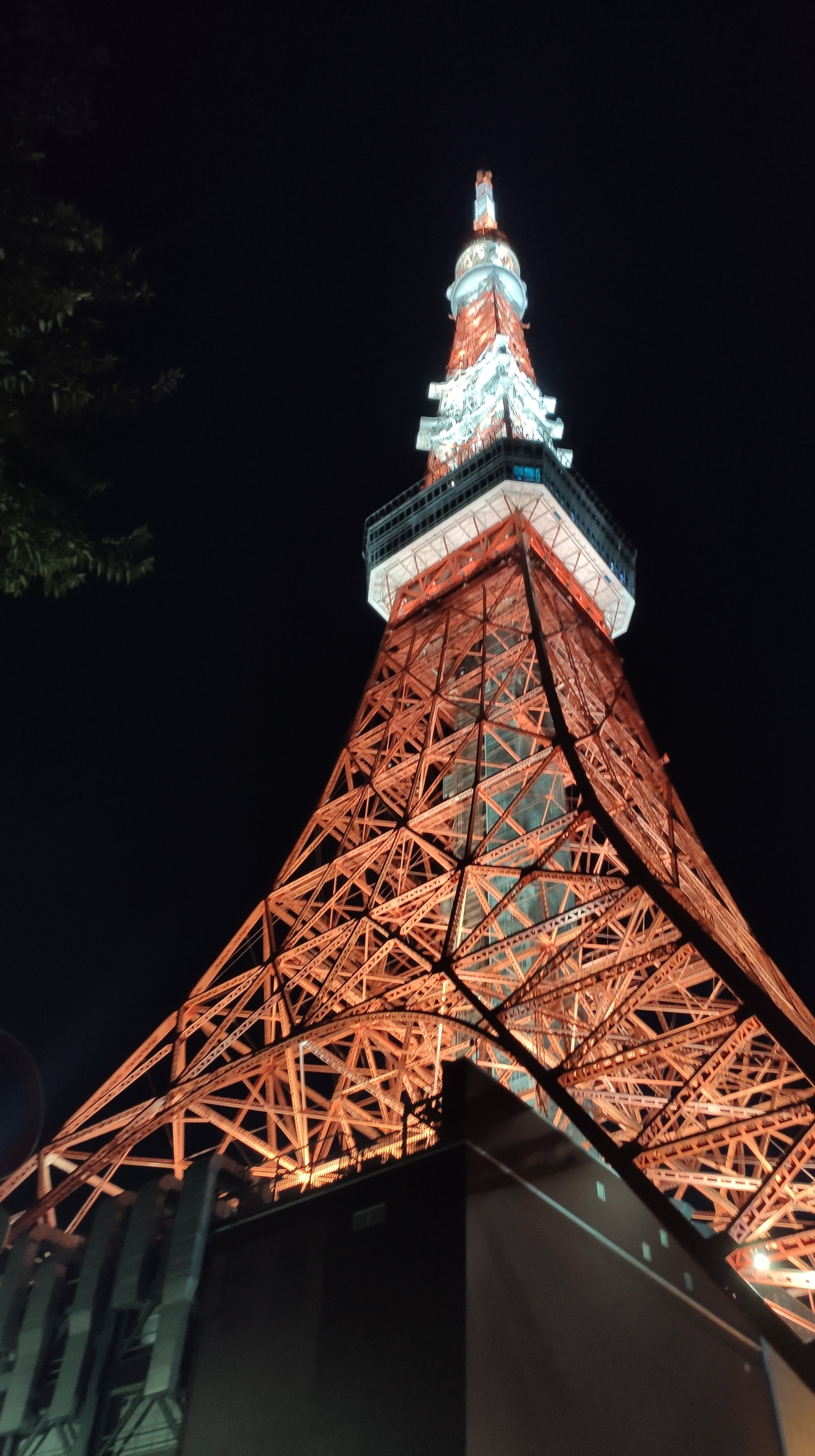 Il est plus de 22:00 quand nous sortons un moment pour nous imprégner de l’ambiance tokyoïte. La tour de Tôkyô est toute proche, nous allons à ses pieds l’admirer, uniquement d’en bas car il est trop tard pour y monter.
