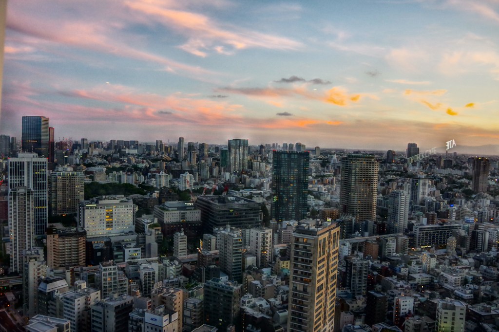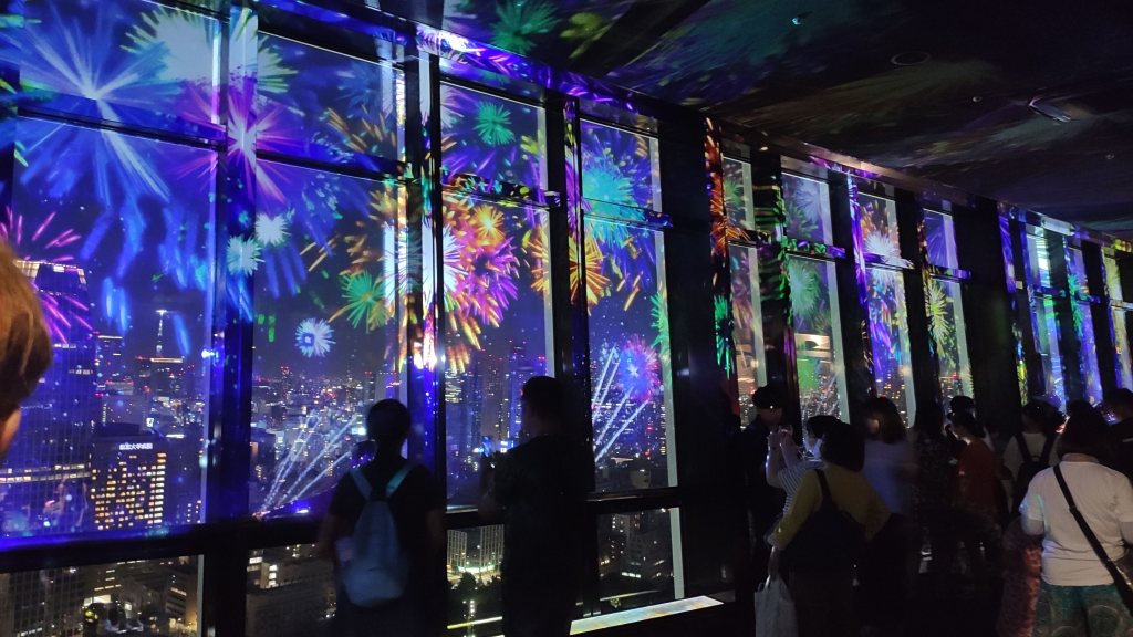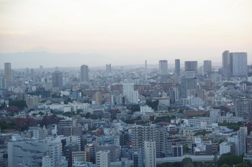 Nous repassons par l’hôtel pour un rapide décrassage (je ne sais pas vraiment ce que ça veut dire mais ça a l’air dans le monde du sport d’évoquer la récupération après l’effort) avant d’aller à la tour de Tôkyô cette fois à la nuit qui tombe. boum. Pour la première fois, je vois un peu le mont Fuji depuis la capitale. Quand la nuit est tombée, il y a des projections sur les vitres intérieurs de la plateforme d’observation, qui simulent des feus d’artifices et diverses ambiances. Subtil!