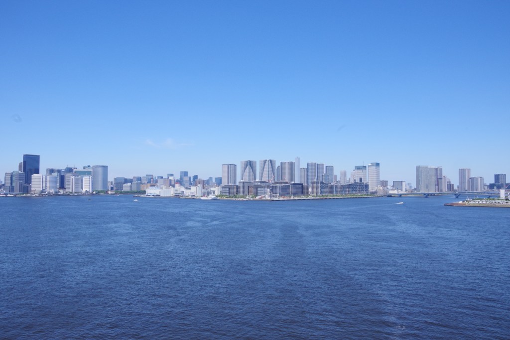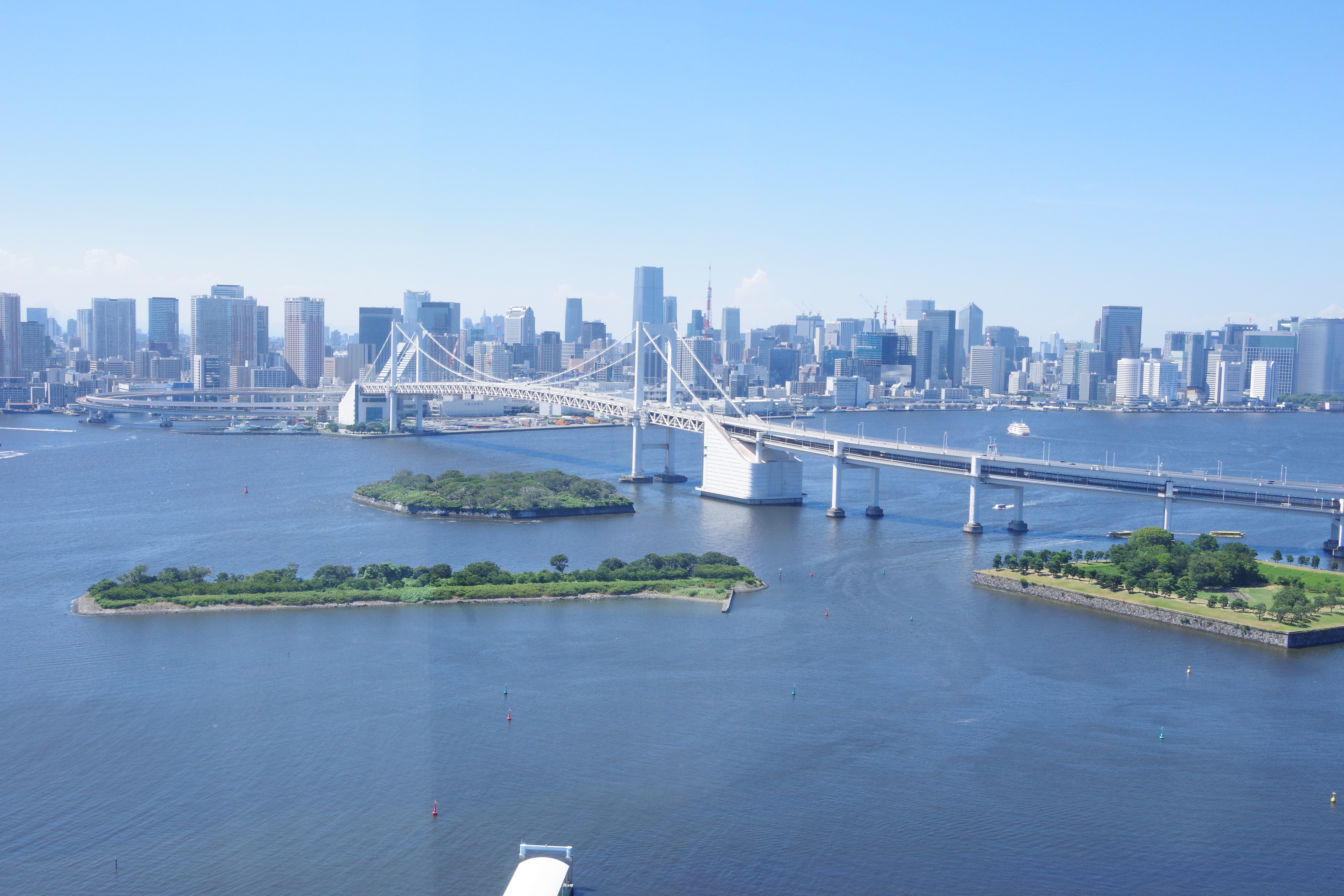 Avec le passe en poche, et la réservation de 4 trajets prévus dans les 8 prochains jours, nous allons à Odaiba. Passage obligé: on franchit le Rainbow Bridge en marchant. Petite alerte: je souffre grave pour monter les escaliers qui amènent au tablier du pont. En vrai ça doit être super en entrainement cardio pour les sportifs et les masochistes, mais je réalise tristement mes limites. Je suis plus masochistes que sportif (car il y avait un ascenseur).