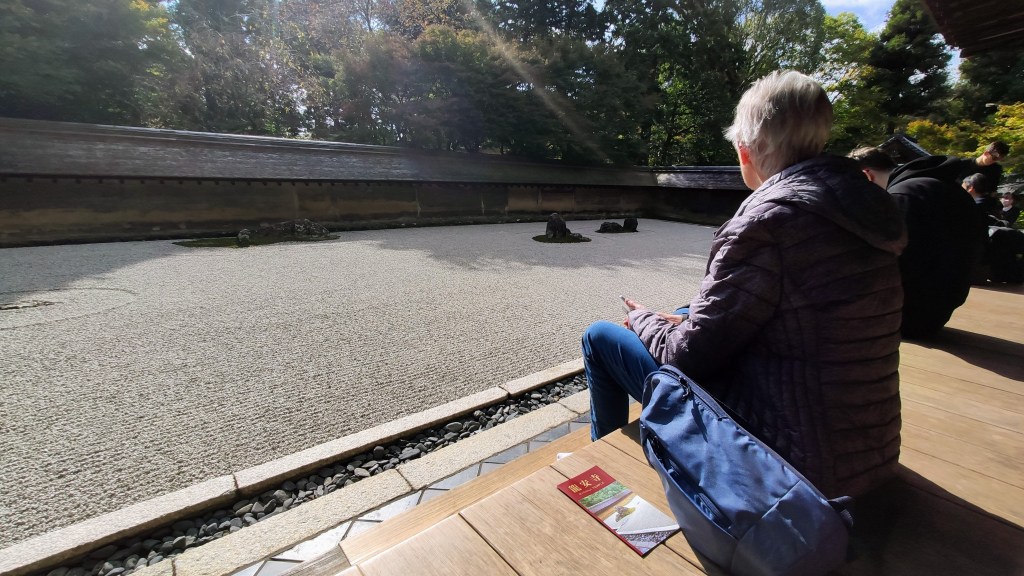 A la suite de cette visite, nous continuons un peu plus à l’ouest vers un autre temple également très connu, mais dans un genre différent. Opposé même. Il s’agit du Ryôan-ji, qui possède un beau jardin, classique, moins apprêté que celui du pavillon d’or, ainsi qu’un Karesansui, “jardin sec” composé de pierres, de gravier et de sable, sans verdure autre que de la mousse. C’est un autre genre de beauté, pas du tout clinquante mais spirituelle. Si le pavillon d’or était un homme politique, ce serait Balkany ou Sarkozy. Bling-bling. Le Ryôan-ji à côté c’est Michel Rocard.