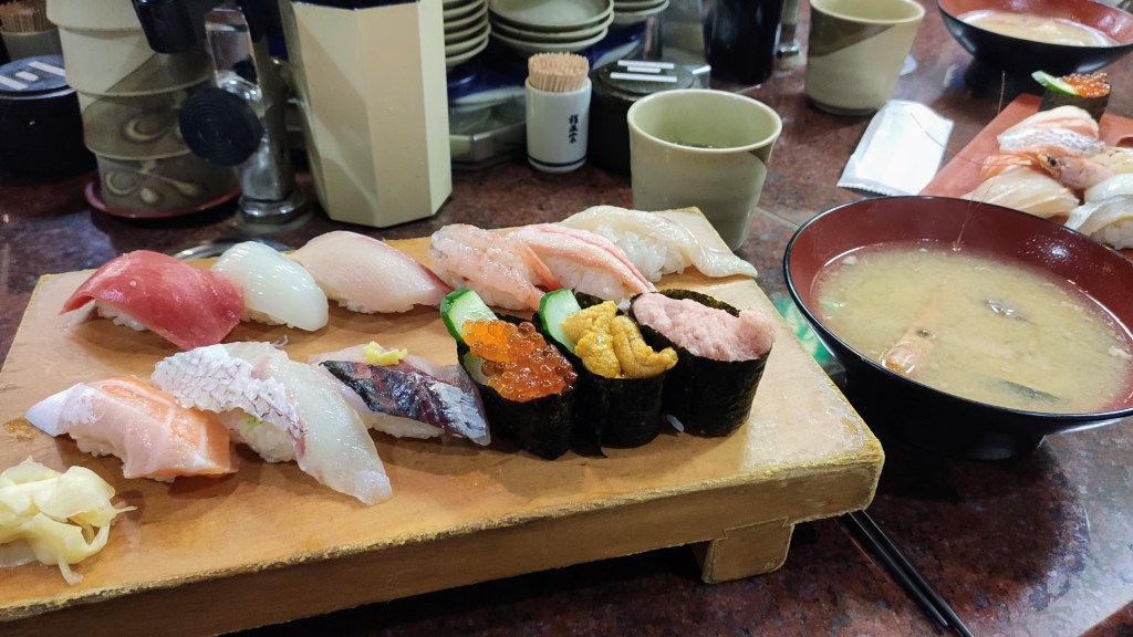 Nous commençons par aller faire un tour au marché d’Omicho, un grand marché couvert, ou l’on trouve principalement des primeurs et des produits de la mer. Et aussi de tout petits restaurants, comme celui où nous mangerons nos premiers “vrais” sushis de ce voyage. Un vrai bonheur, accompagné de sa soupe miso au poisson. Alors que nous déambulons, un homme de type ancien m’aborde et commence à m’inonder de questions: vous êtes d’où? vous êtes là depuis longtemps? vous restez encore longtemps? c’est votre première fois au Japon? vous travaillez dans quoi? T’ES DES R.G. OU BIEN???