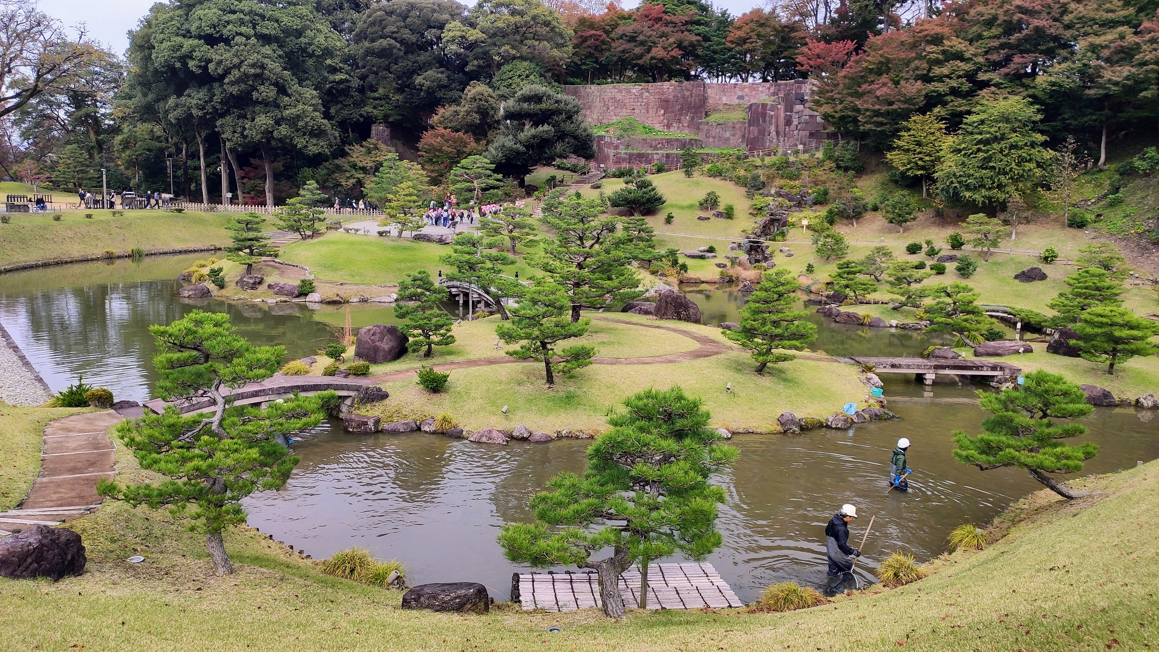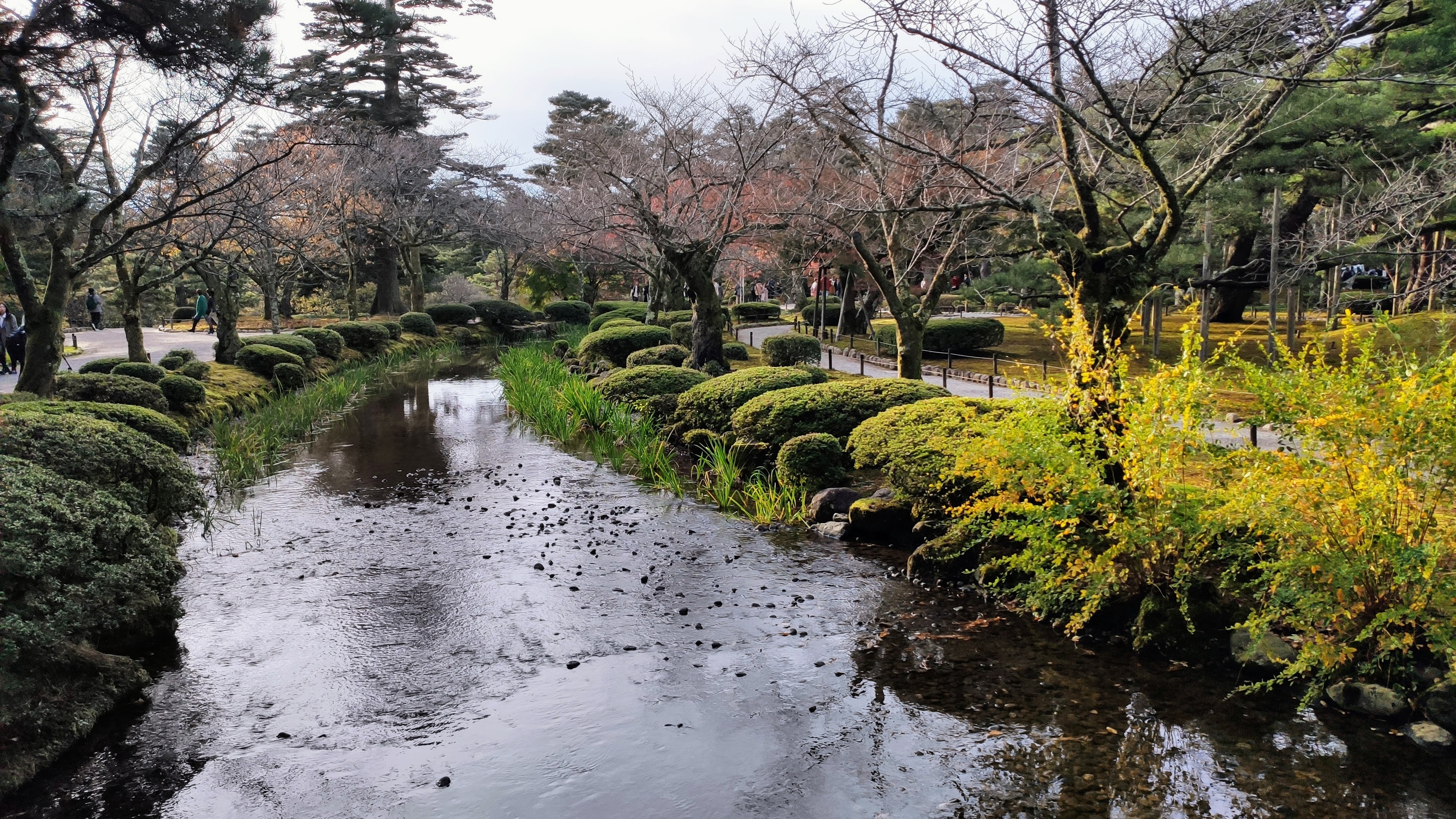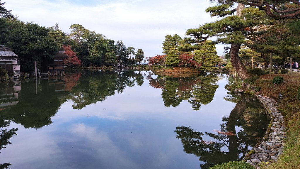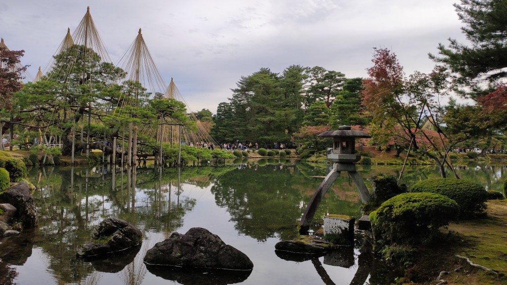Place ensuite au plat de résistance de la journée: le Kenrokuen, généralement considéré comme le plus beau jardin japonais, à tout le moins dans le top 3. Je l’avais déjà vu il y a des années en été, il n’est malheureusement pas très différent en cette période de l’année (ce ne sera pas le cas dans 2-3 semaines!). Mais ça n’enlève rien à sa beauté.