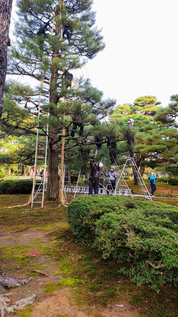 Depuis le début du mois, les jardiniers s’affairent à consolider les branches des arbres en prévision de l’hiver et de la lourde neige qu’ils auront peut-être à supporter. Pour cela ils installent des structures appelées yukitsuri. Nous avons la chance de pouvoir admirer une telle installation se faire en live.