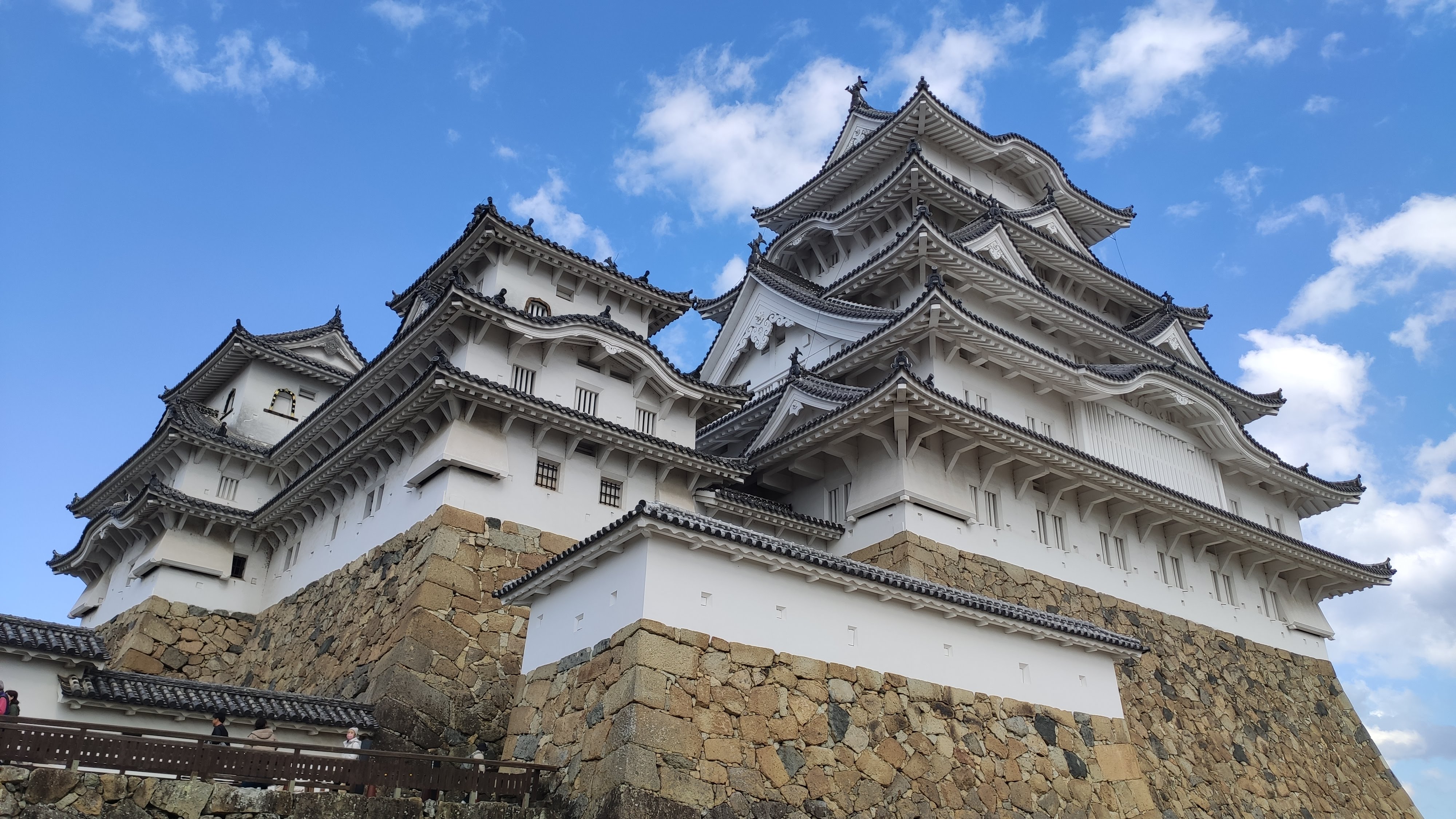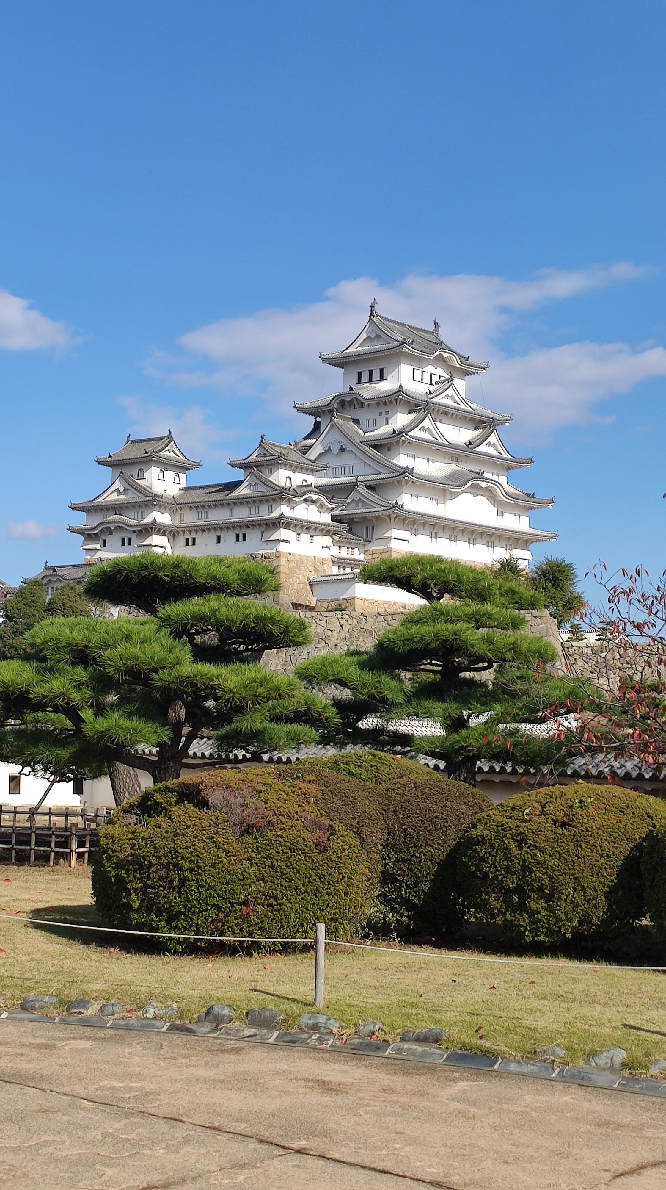 Pluie sur Kyôto ce vendredi, nous décidons pendant le petit-déjeuner de partir 100km plus à l’ouest, dans la ville d’Himeji. Pas de problème pour réserver nos billets de train au dernier moment, et 45 minutes plus tard nous sortons de la gare. Au bout du long boulevard qui commence à la gare nous découvrons, au loin, le majestueux château de la ville d’Himeji.
