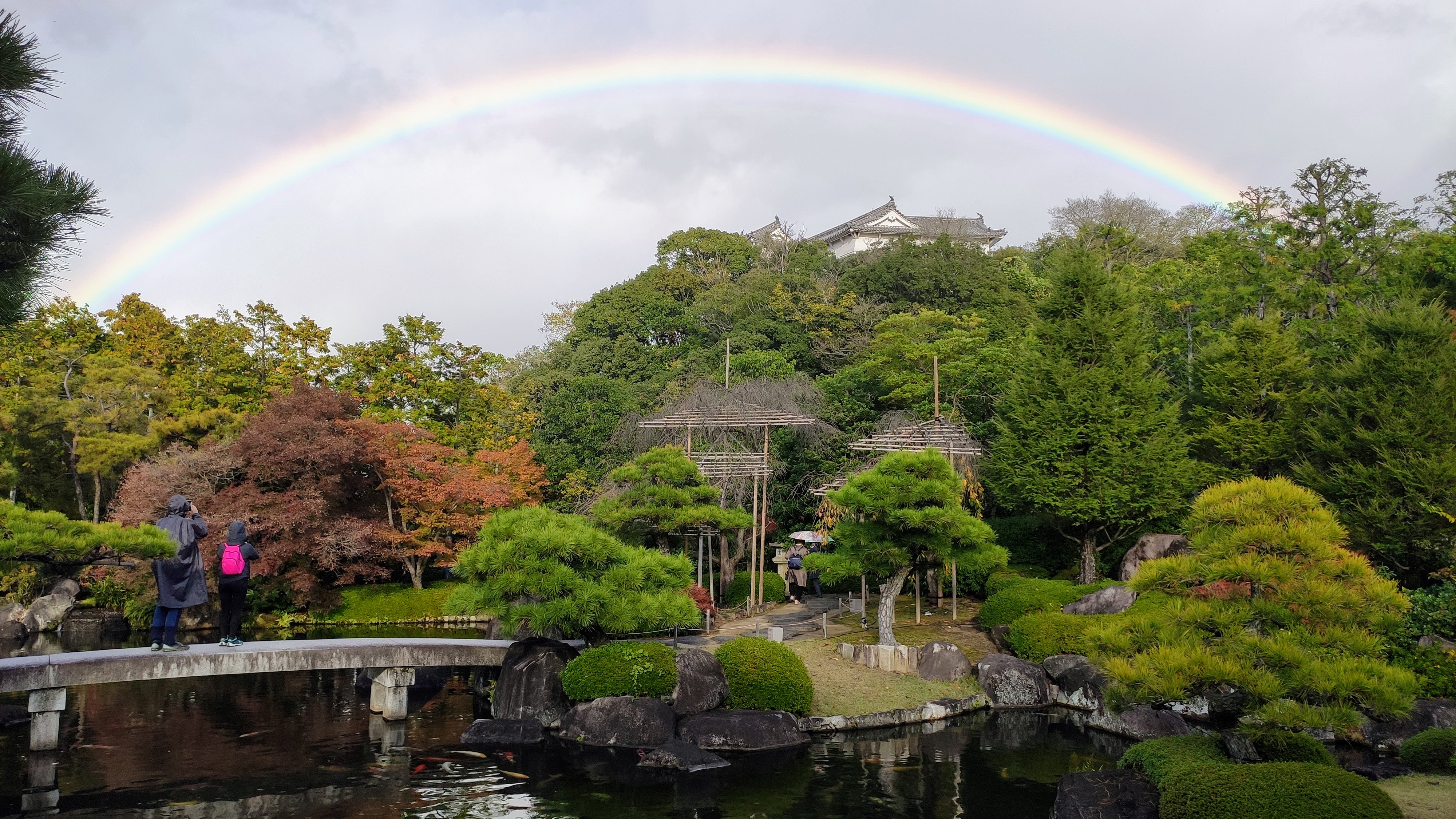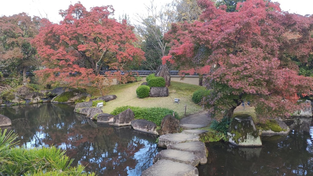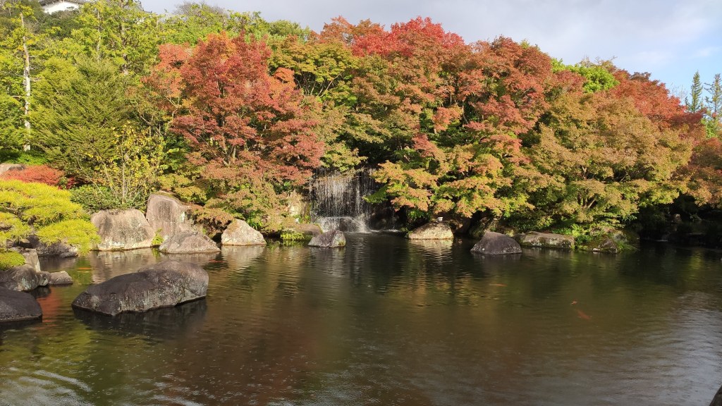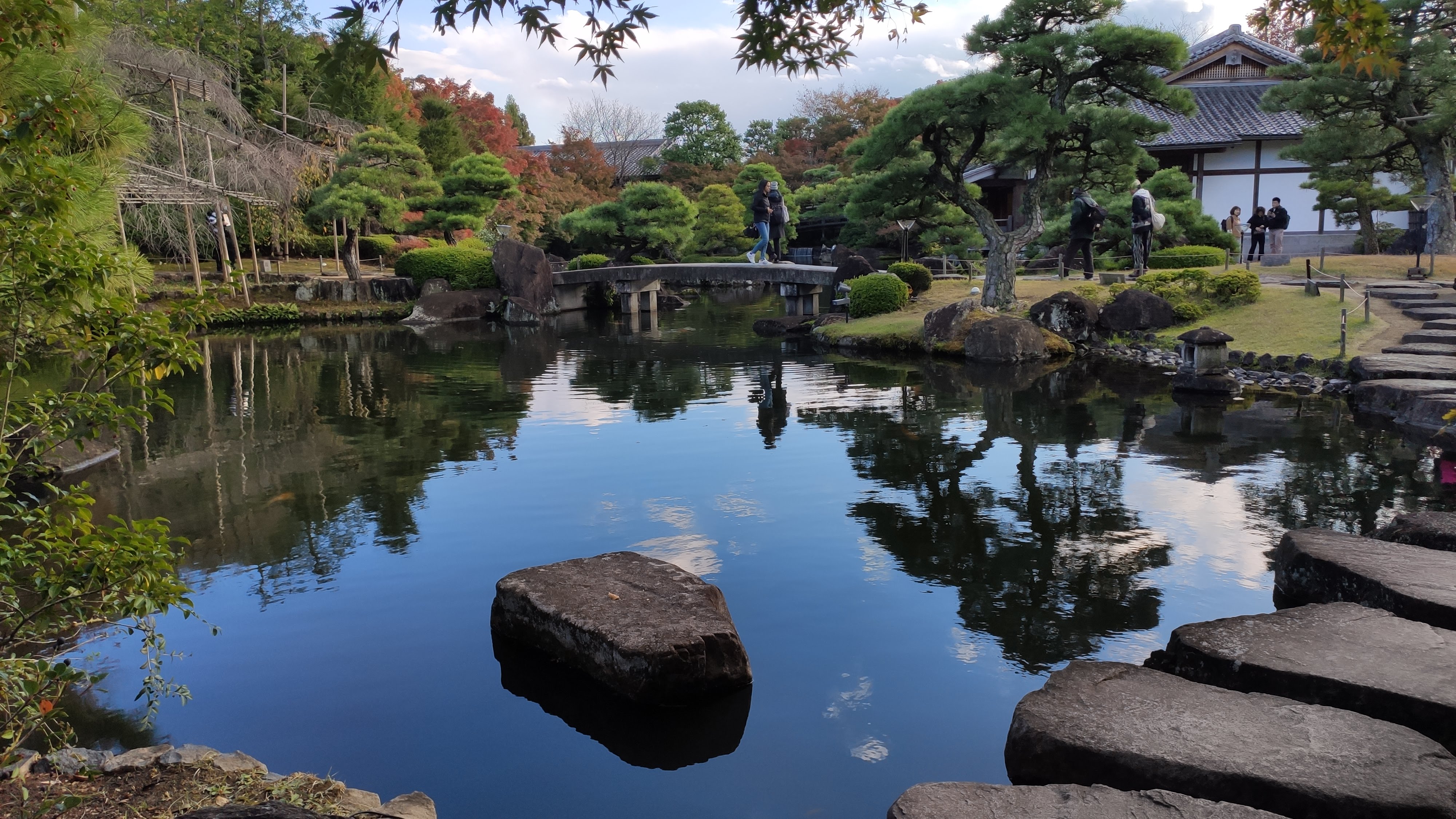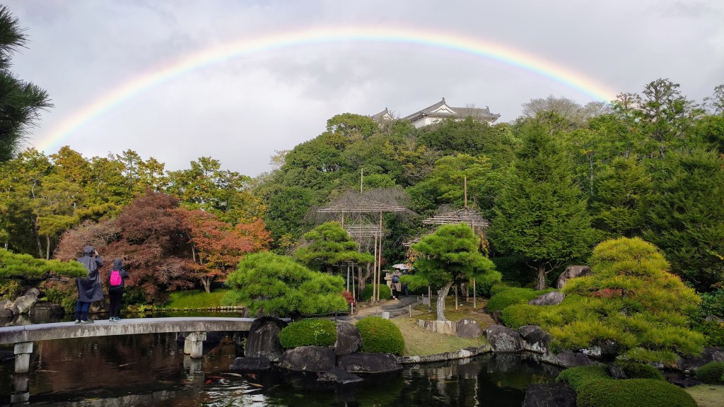 Nous allons ensuite voir notre deuxième jardin japonais en deux jours. Dans un genre bien plus modeste que le grandiose Kenroken de Kanazawa, le Kôkoen est tout à fait charmant. Nous avons la chance de le découvrir sous une pluie légère alors que nous sommes à l’abri, puis au sec.