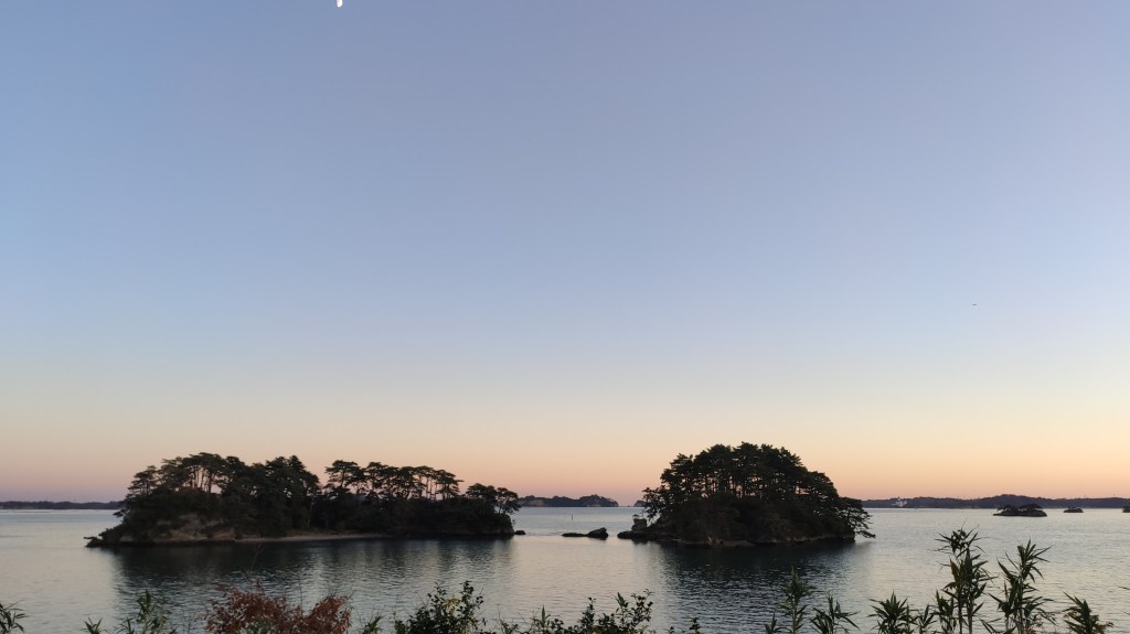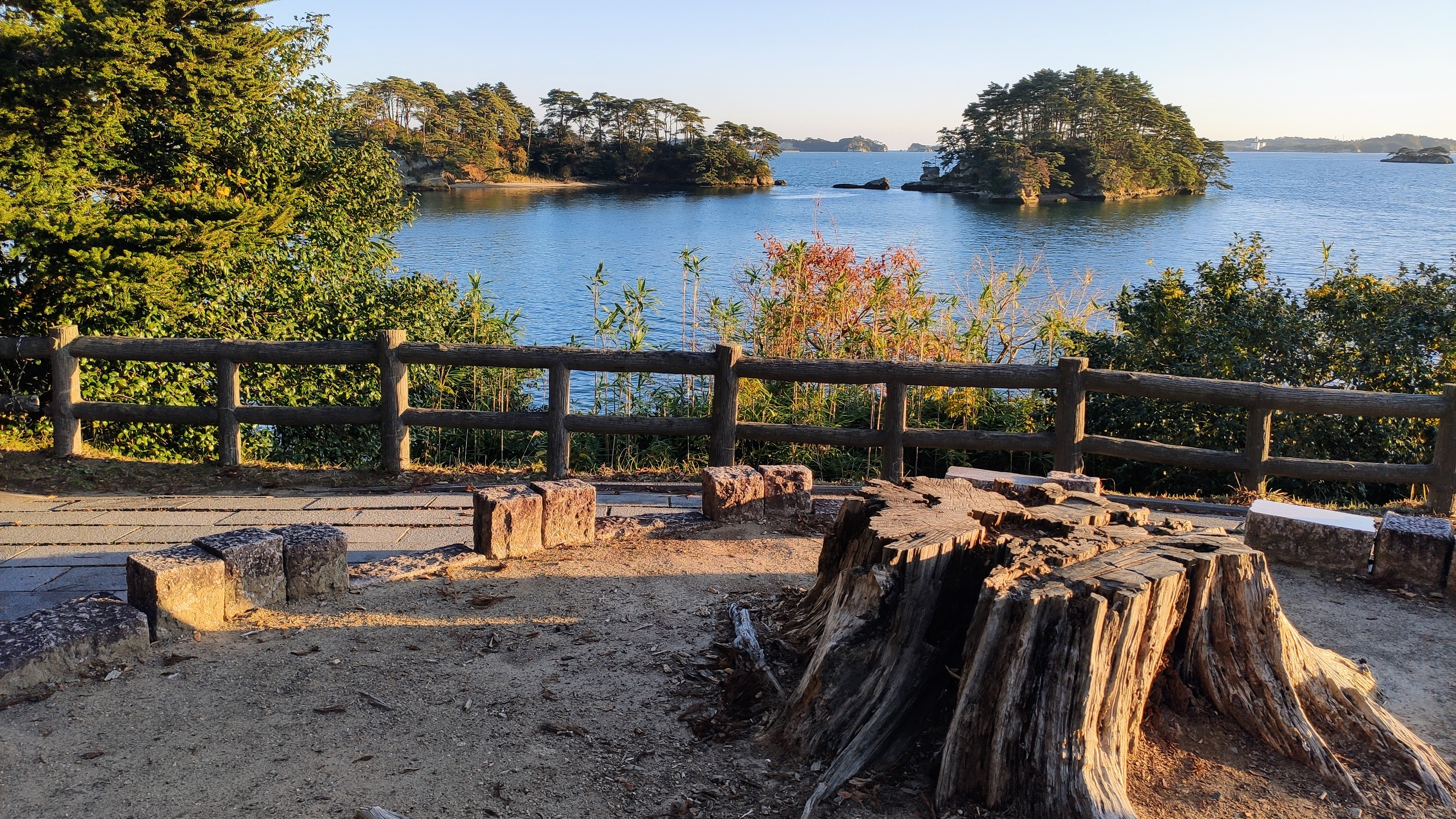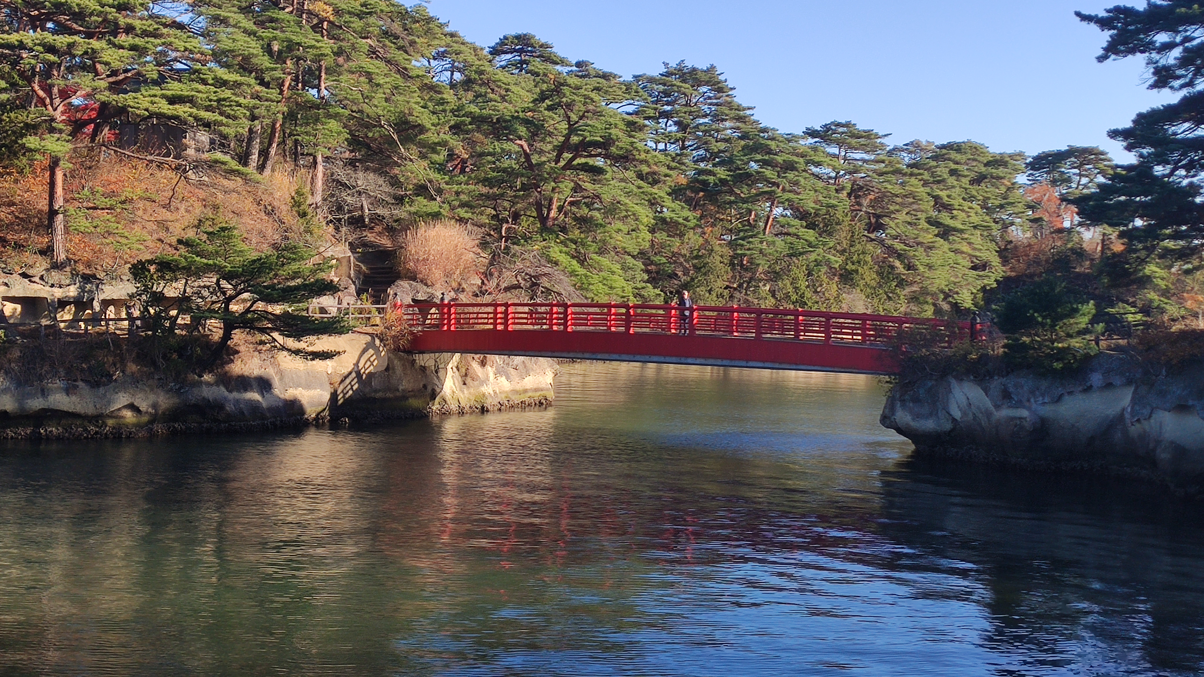 La destination pour cette journée du mardi est la ville de Matsushima, qui porte le même nom que l’archipel d’îles qui lui fait face. Je reconnais avec émotion la charmante petite gare d’arrivée, toute proche de la mer. La première chose qui me saute aux yeux, c’est le restaurant de ramen où ma nièce Valentine m’avait épaté en finissant son bol de nouilles avant moi, qui est devenu un snack lambda. La deuxième chose qui me saute au yeux, ce sont les couleurs: Les érables ont mis leur robe d’automne. Il n’y a pas de troisième chose qui me saute aux yeux.