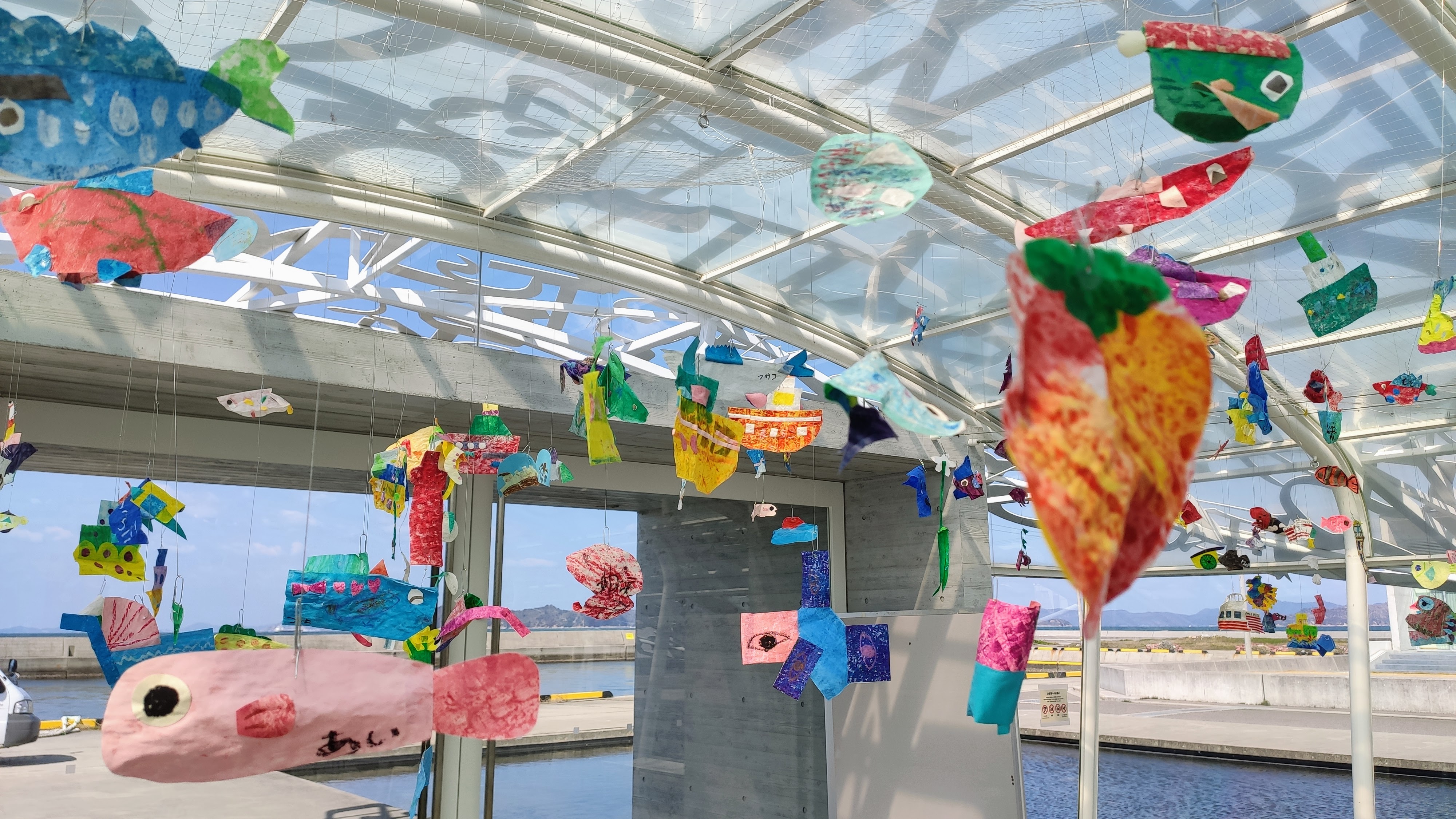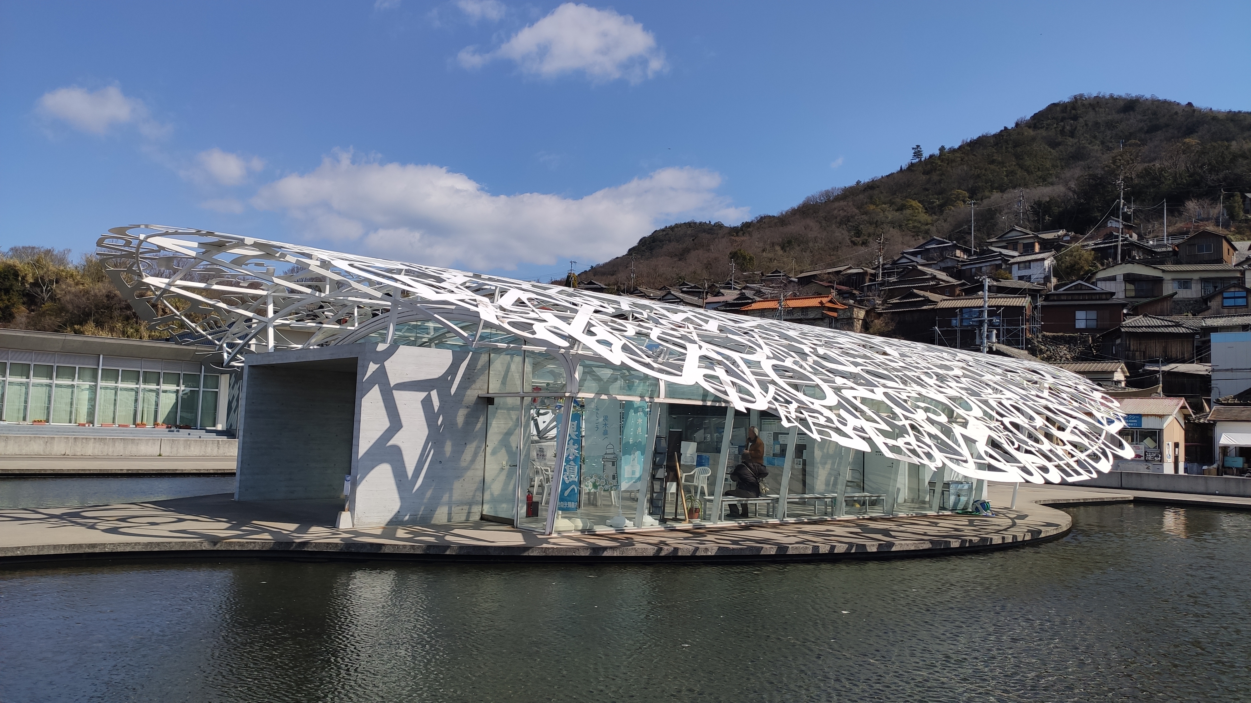 Un bâtiment moderne et très beau attire immédiatement l’œil quand on s’approche. Je suis épaté par la luminosité à l’intérieur. Les grandes baies vitrées trompent nos sens, enfin principalement celui de la vue, et nous font croire toujours en l’extérieur. Cette construction s’appelle “L’âme d’Ogijima“, et c’est l’oeuvre d’un artiste espagnol, construit à l’occasion d’une triennale (ça veut dire qui-a-lieu-tous-les-trois-ans) d’art contemporain qui se déroule sur une dizaine d’îles de la mer de Seto. Ce festival est un moyen de dynamiser des lieux isolés et sujets à la dépopulation. Je crois que la population de l’île n’est que de 150 à 200 habitants. Une autre création un peu plus loin, “Takotsuboru”, représente une pieuvre à partir d’éléments et de cordage. Beaucoup d’autres créations, pour la plupart en extérieur, et littéralement inscrites dans les lieux (certains mûrs joliment bariolés).