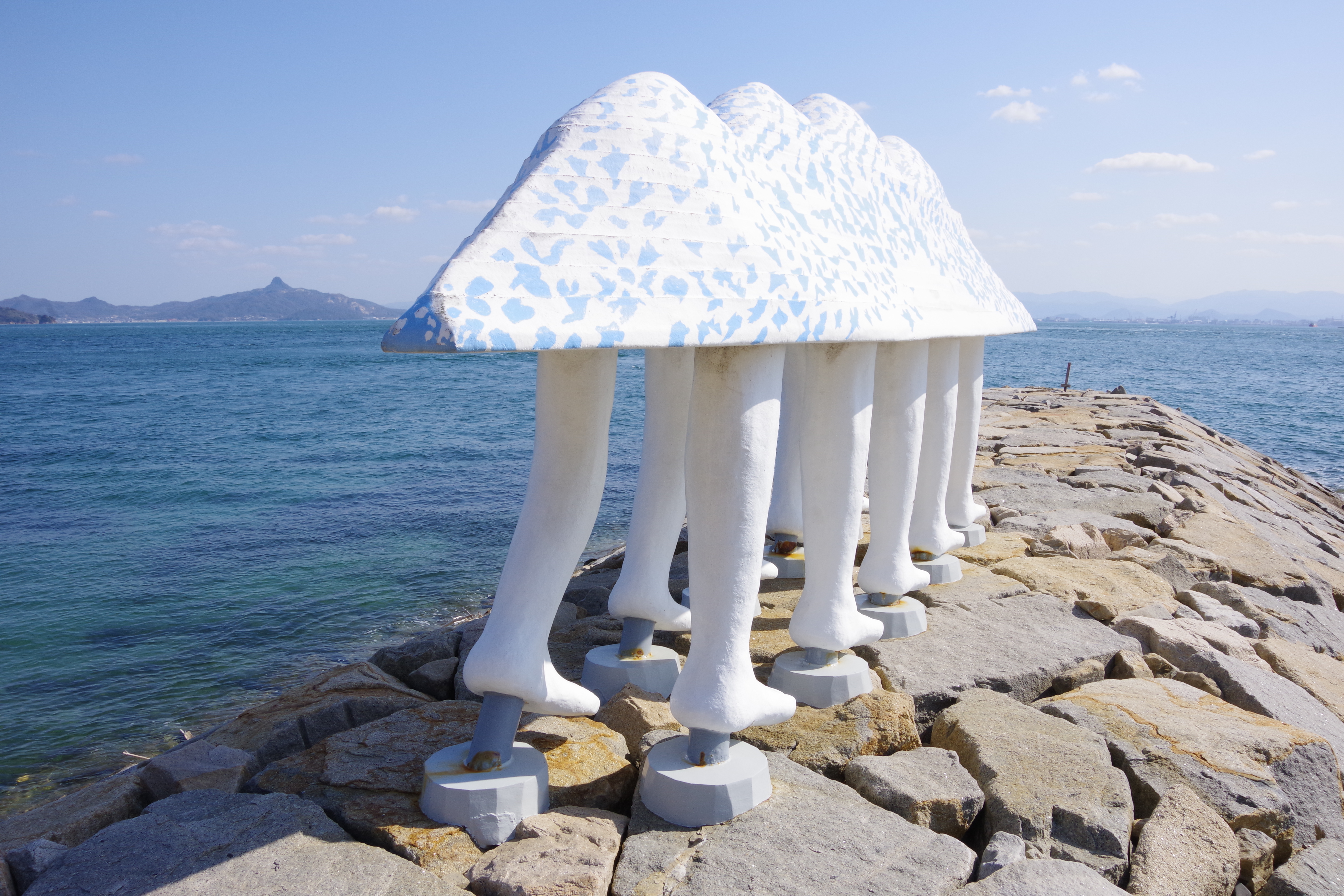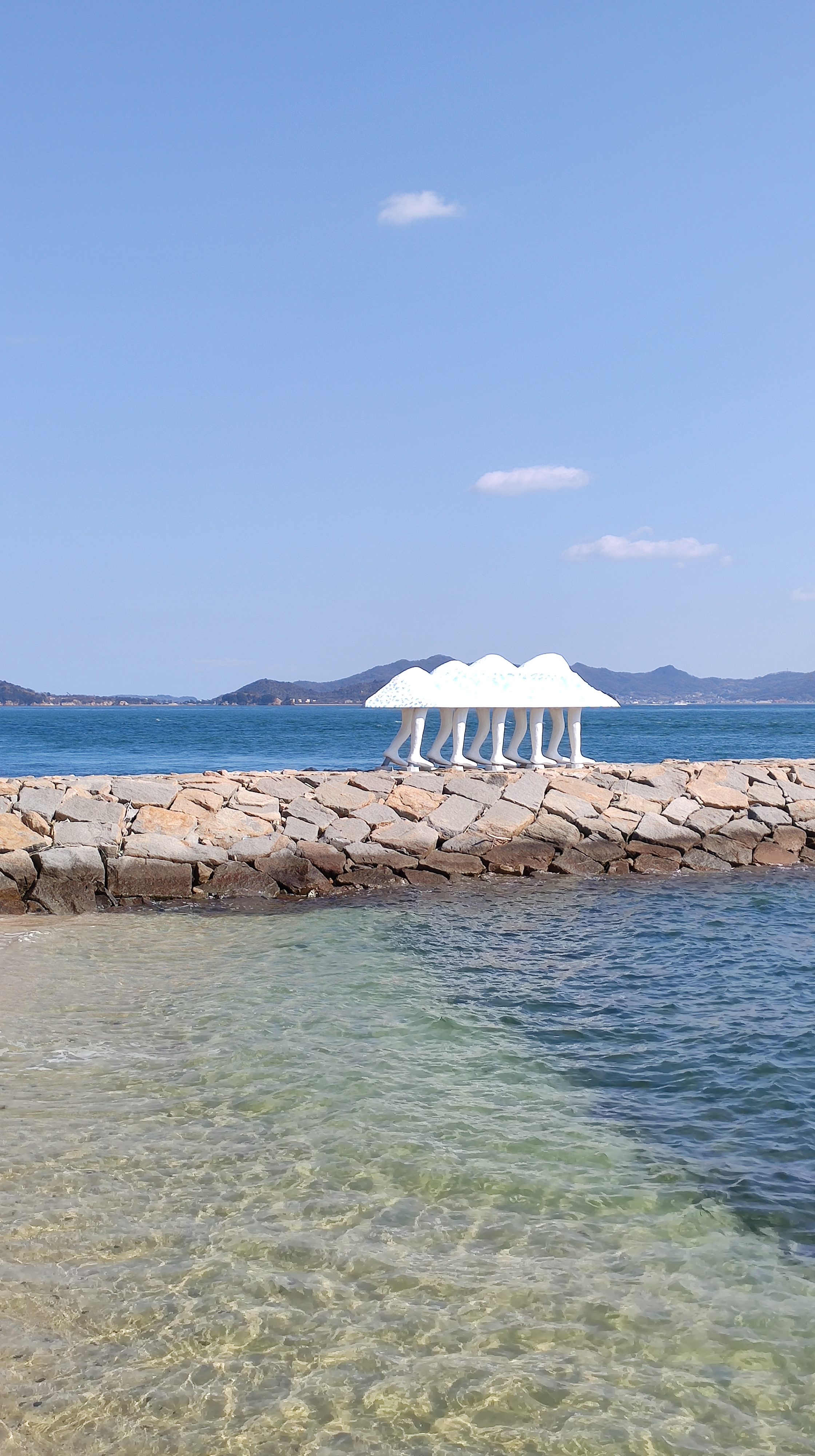 Le chemin côté est de l’île longe la mer et des plages. L’occasion de croiser une arche-qui-marche, création d’un artiste japonais.