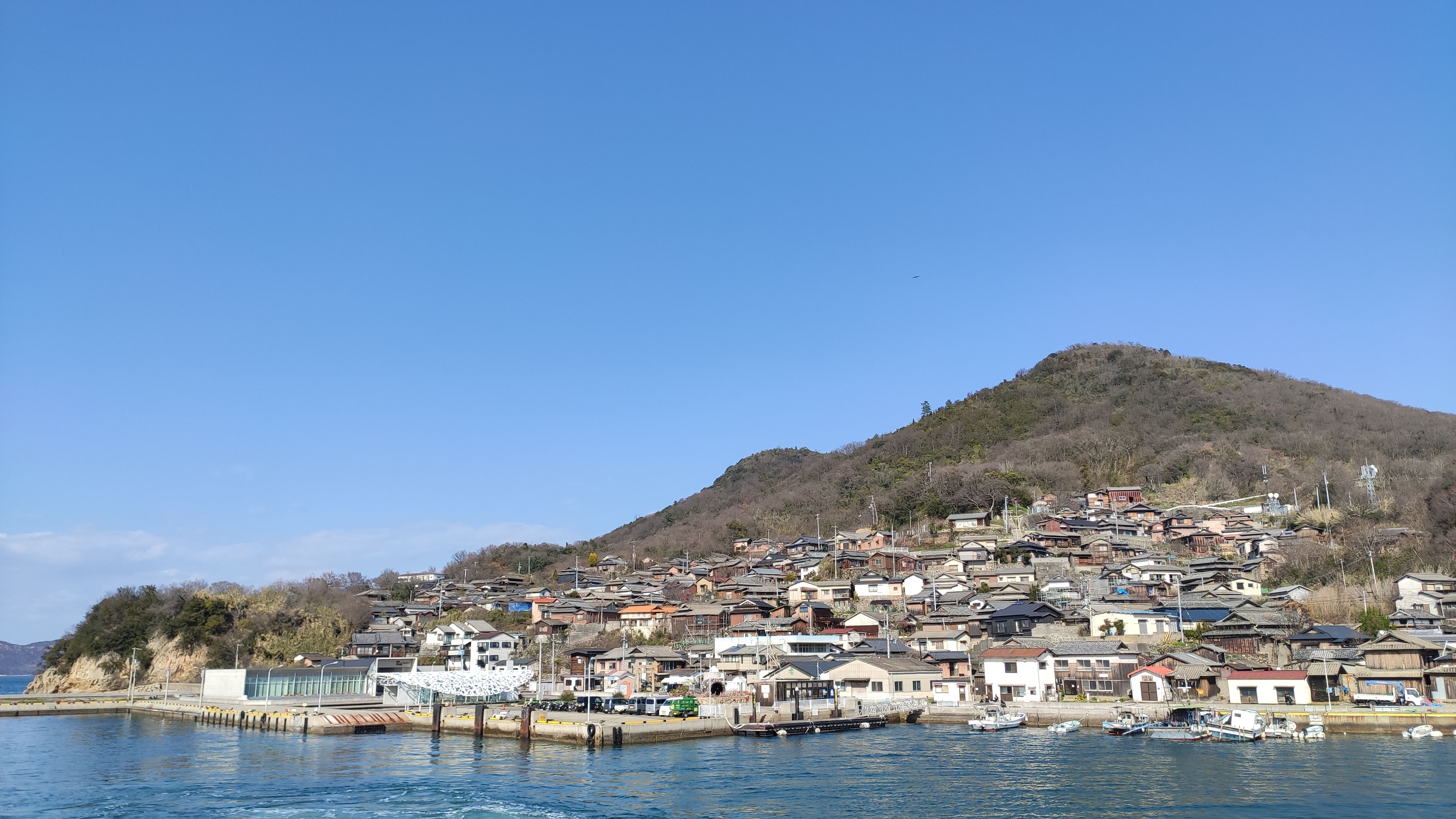 Il fait frisquet ce matin à l’extérieur du bateau, et je me réfugie à l’intérieur pour les 40 minutes de traversée. Après une halte à Megijima, nous atteignons le petit port qui concentre l’essentiel des habitations.