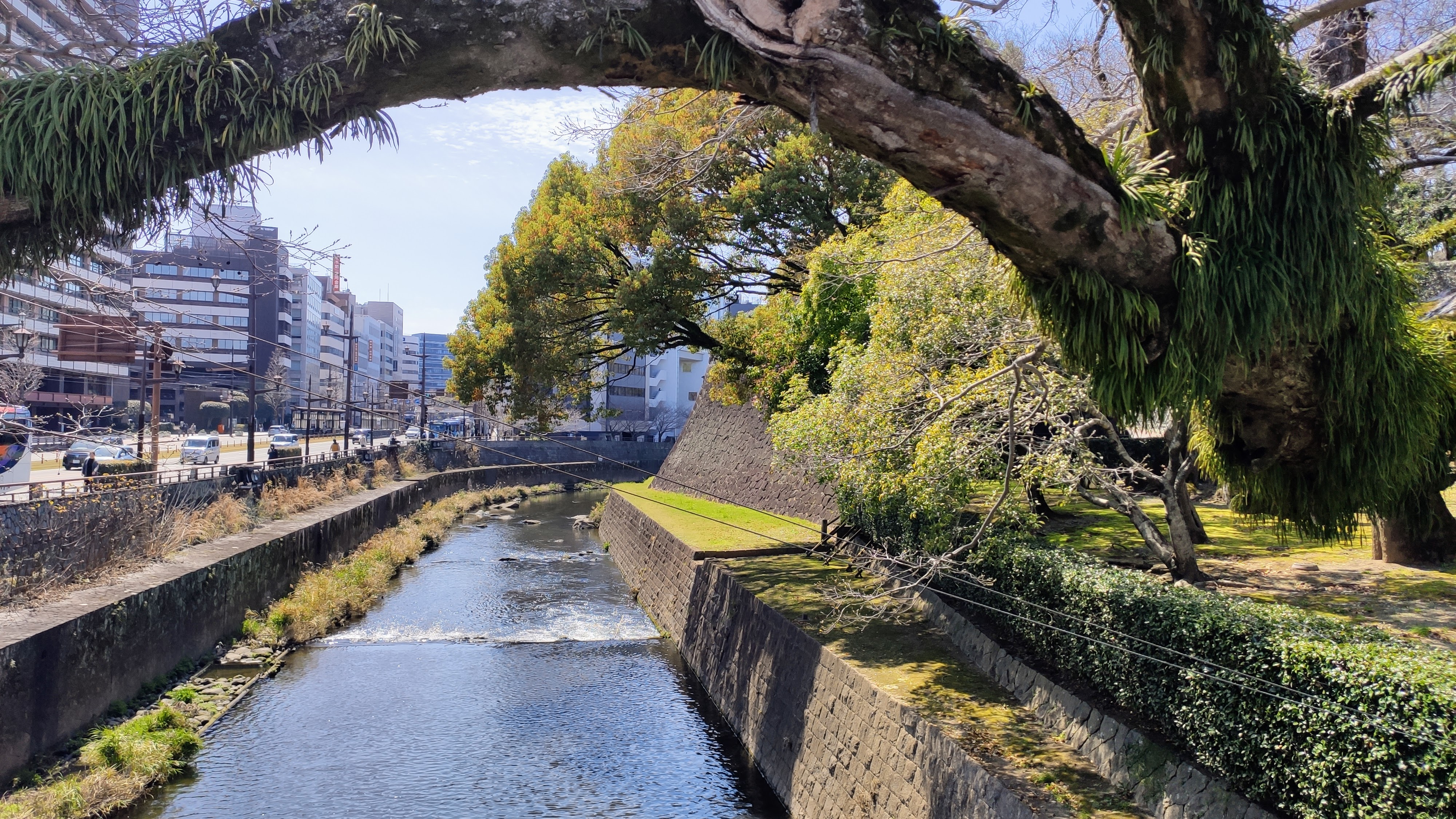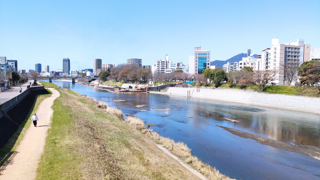 Après la journée tranquille d’hier, j’inaugure le premier shinkansen de ce voyage pour aller à Kumamoto à moins d’une heure de Fukuoka. Depuis la gare, je longe longuement les berges de la rivière Shirakawa en direction du château. J’apprécie les promenades le long des berges japonaises. Quand elles sont larges comme ici il y a souvent moyen de marcher au niveau de la route ou au niveau de l’eau. Ce qui fait gagner du temps en passant sous les ponts, fuck les passages piétons.