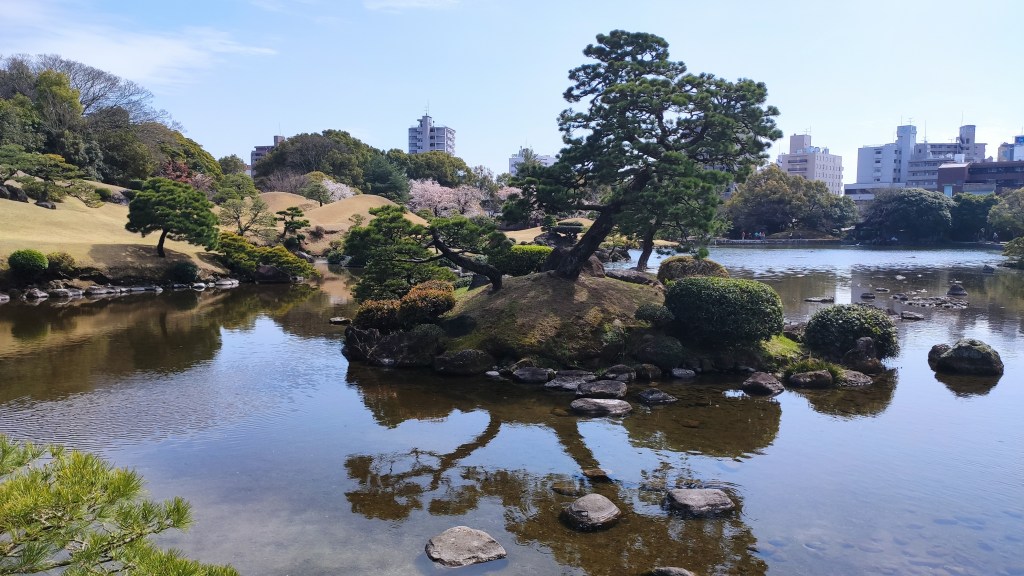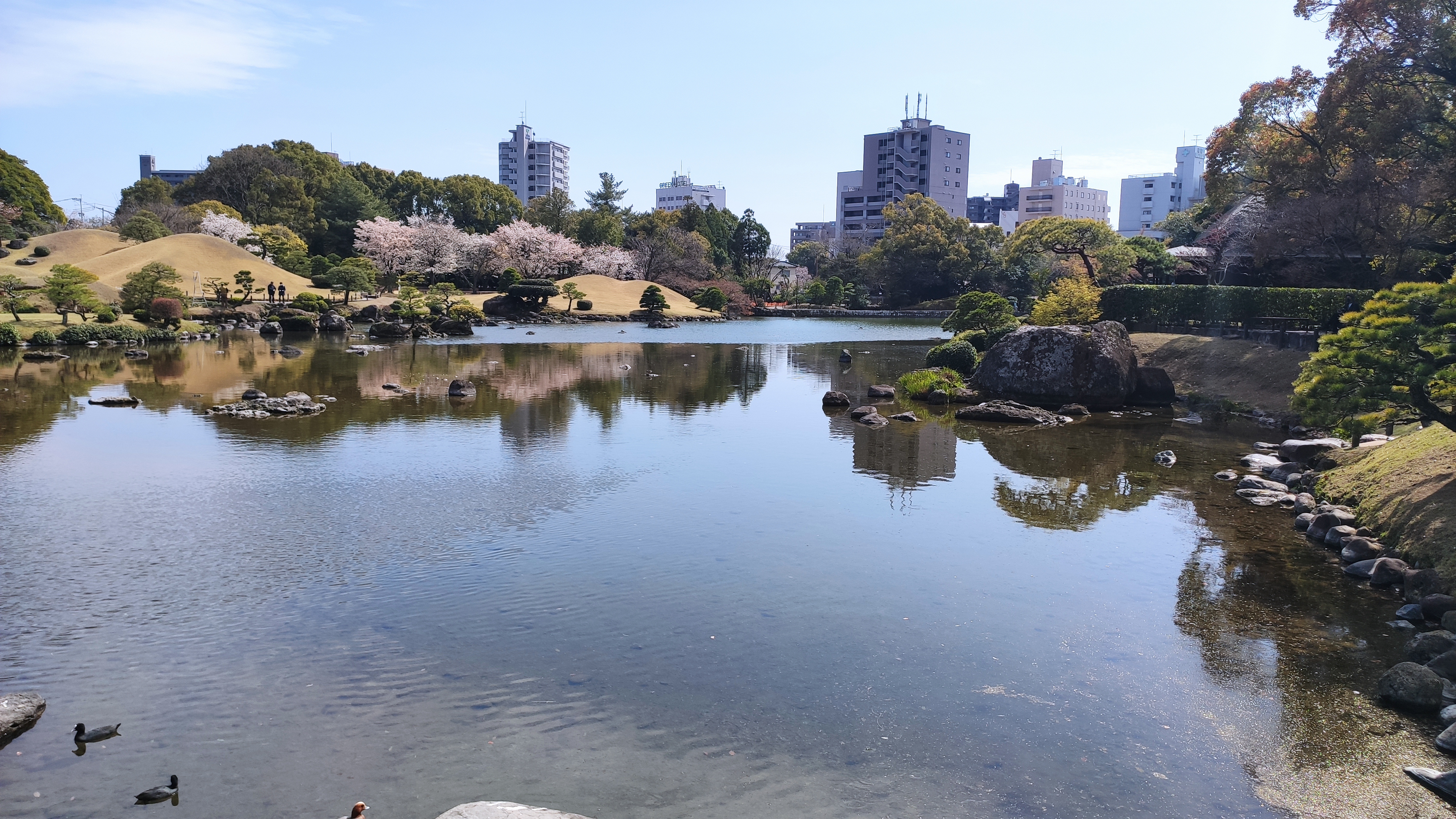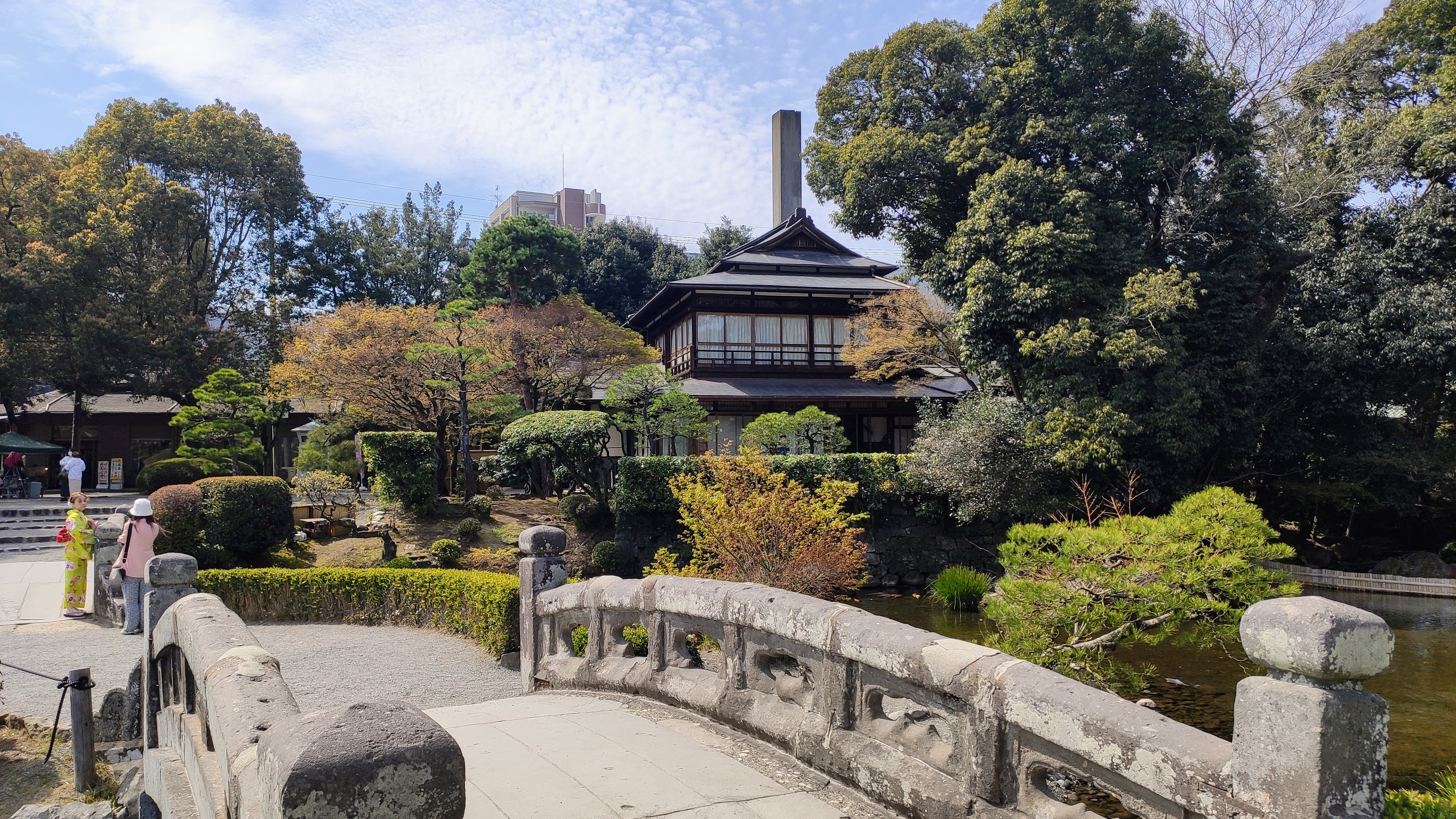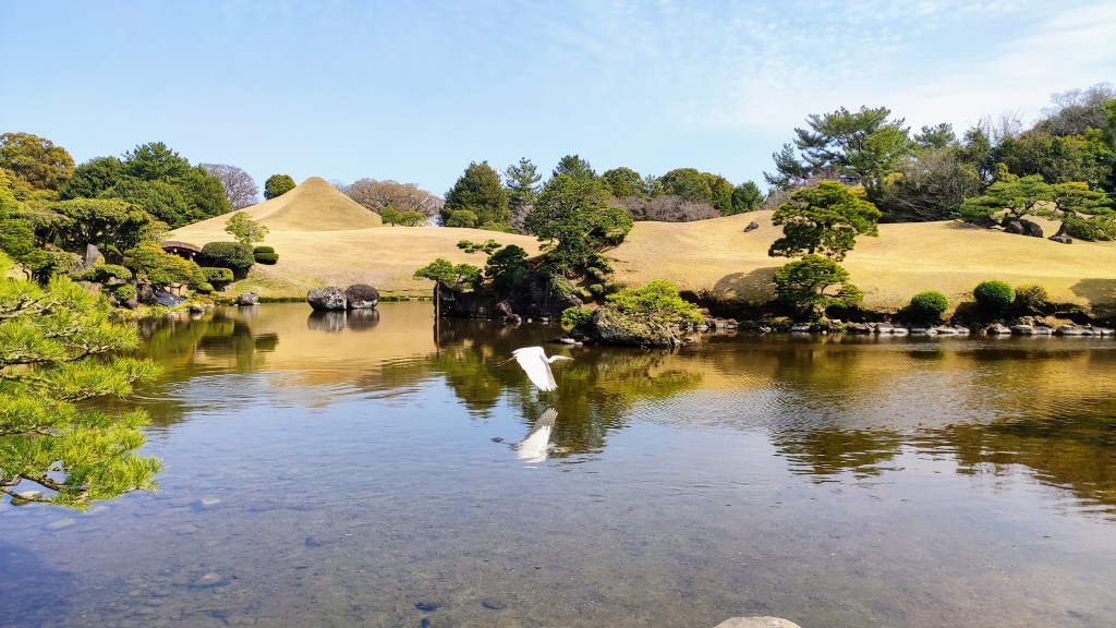Après une heure de marche, j’atteins le Suizenji. C’est un beau jardin, bien entretenu, construit autour d’un étang central et dessinant des collines recouvertes d’une fine pelouse. Il y a un sanctuaire shintô à l’intérieur de l’enclave.