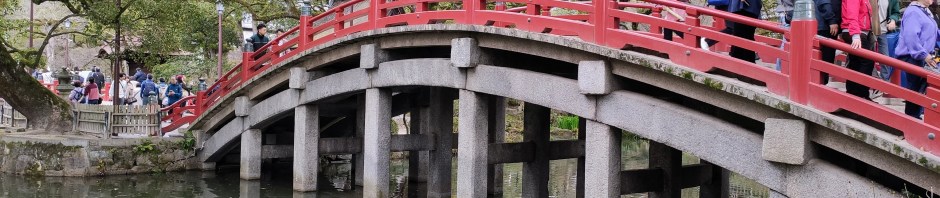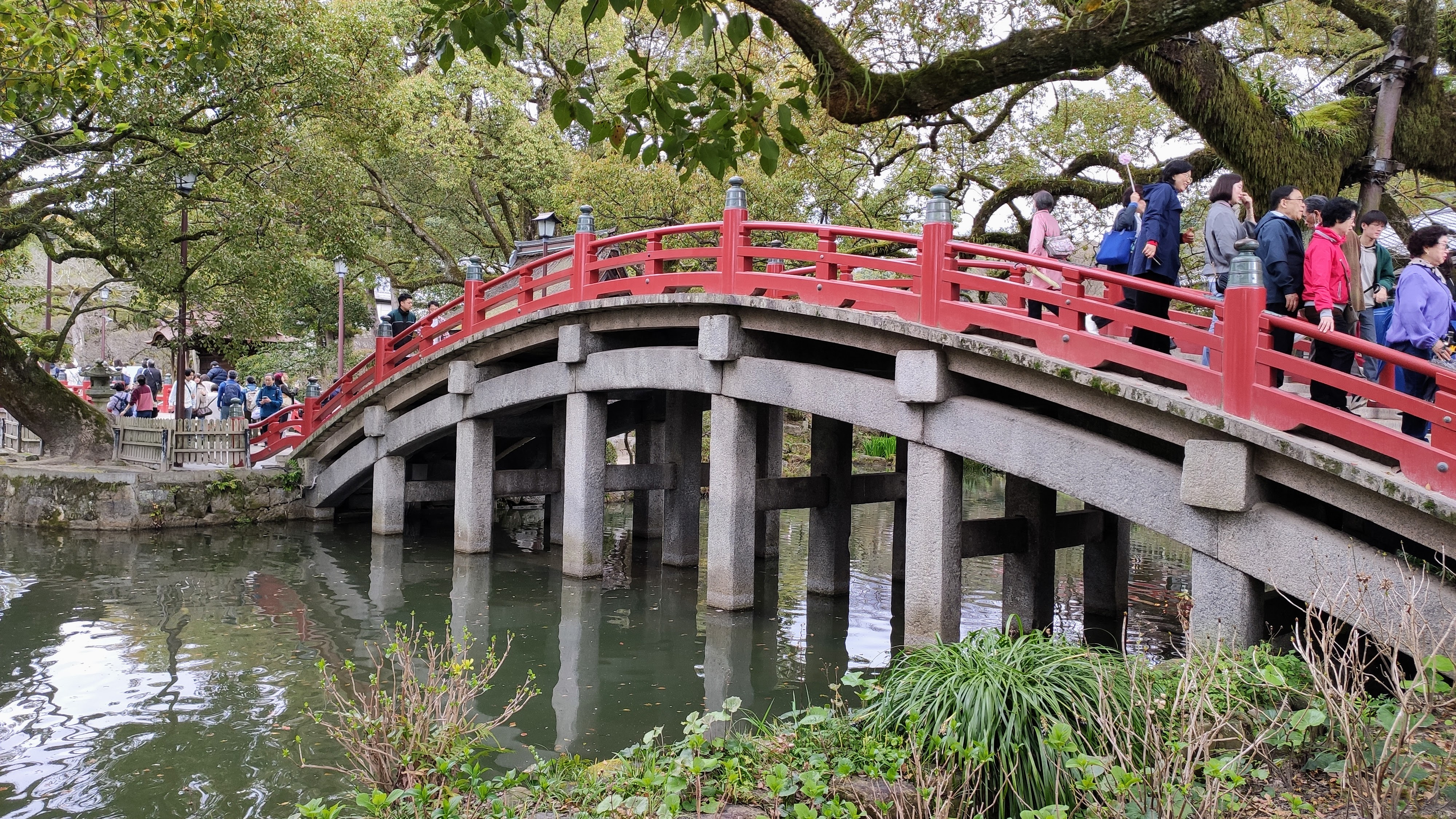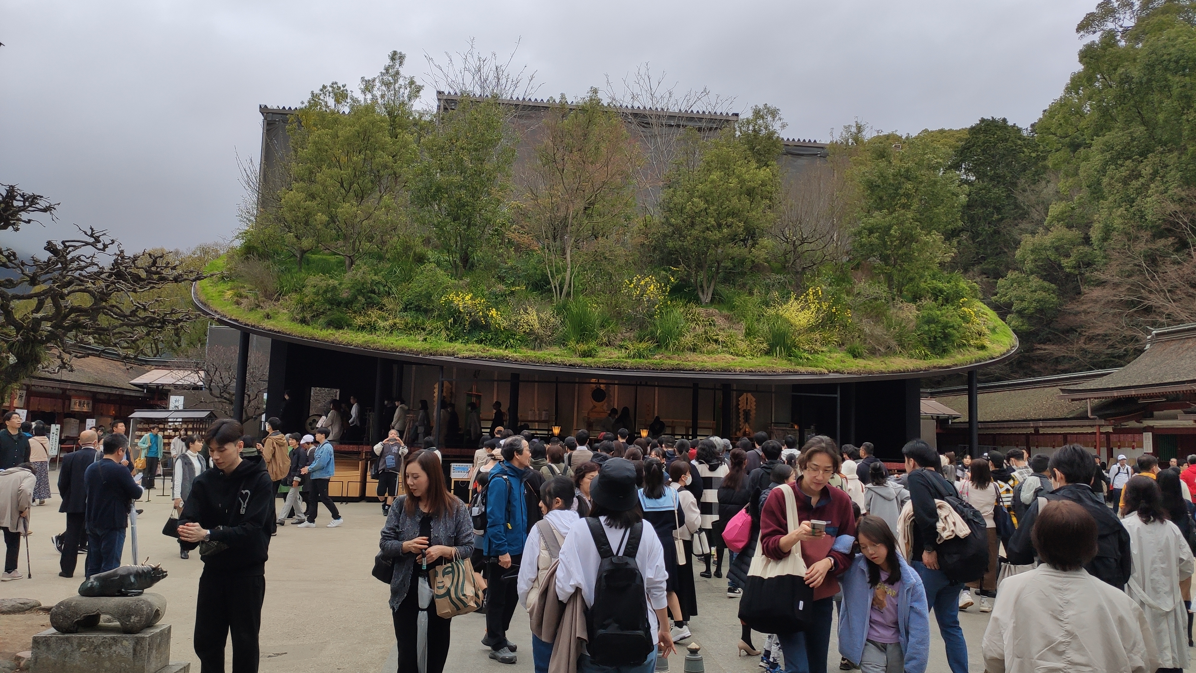 Au sortir du musée, la pluie s’est temporairement arrêté, et je fais un tour au Dazaifu Tenmangu, un sanctuaire dédié à l’éducation et aux arts. Le bâtiment principal est en cours de travaux, mais a été aménagée un espace pour accueillir les événements, avec un toit végétal du plus bel effet. Il y a d’ailleurs une cérémonie cette après-midi. Et énormément de visiteurs.