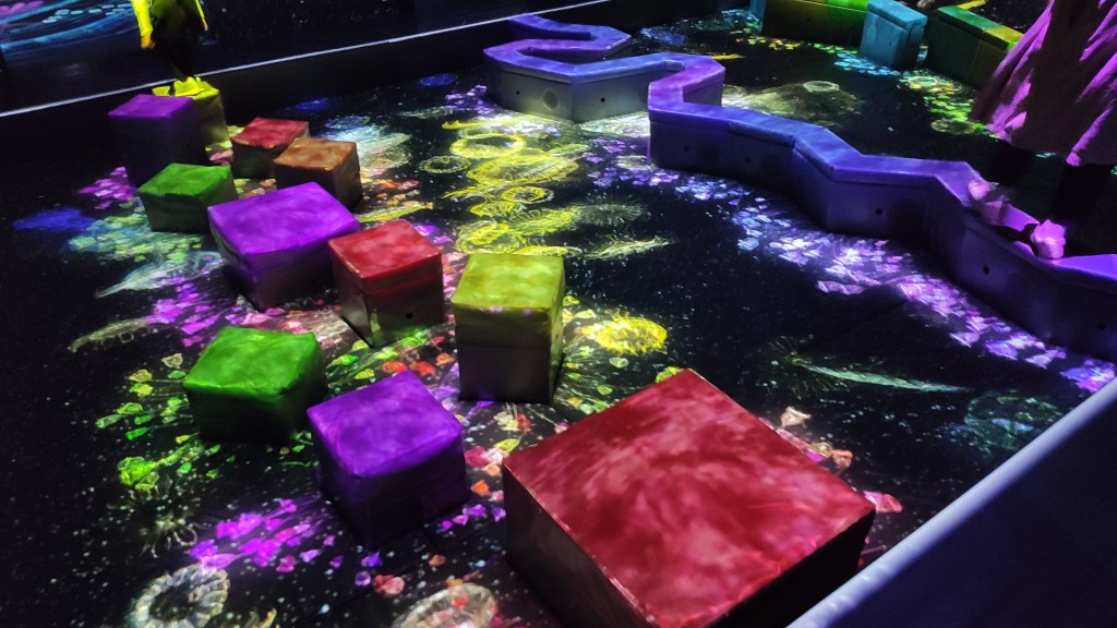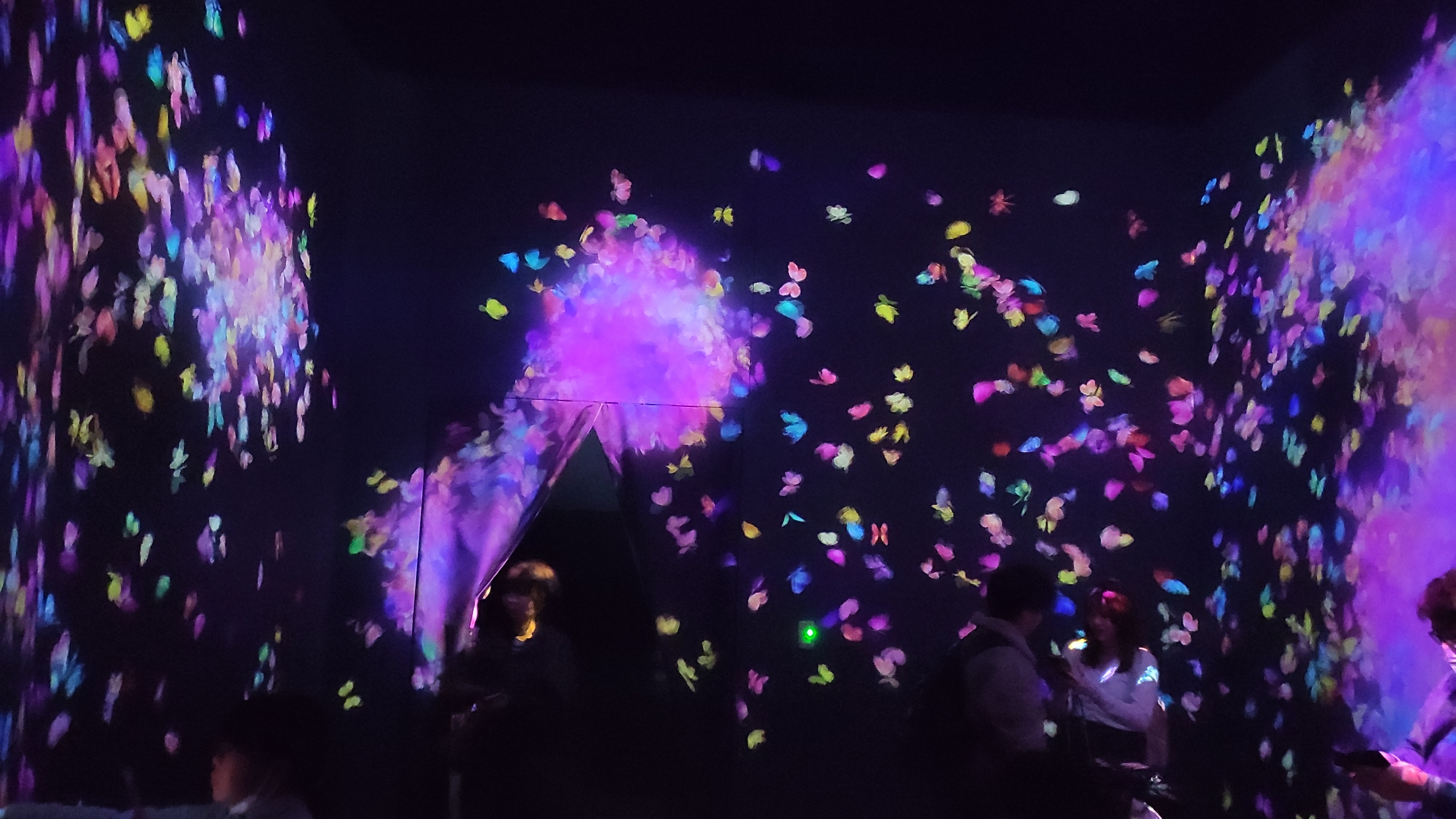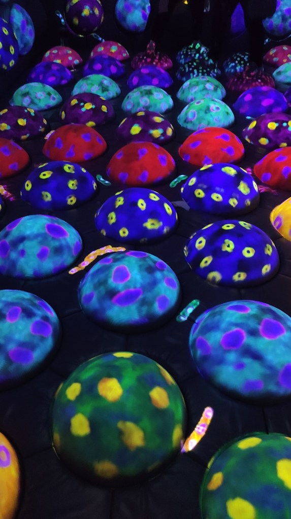 La seconde partie de l’exposition est une succession d’expériencez dans des pièces aux sols et aux murs interactifs. Dans l’une d’elle, en frottant les murs, on peut faire apparaître des nuées de papillons. Dans une autre, une partie du sol est mouvant (surface type trampoline) et l’affichage de la flore tiens compte du relief sur notre passage. Dans une autre on marche sur des champignons colorés dont le choix de passage influe sur l’affichage tout autour. C’est vraiment très immersif et sacrément bien foutu techniquement.