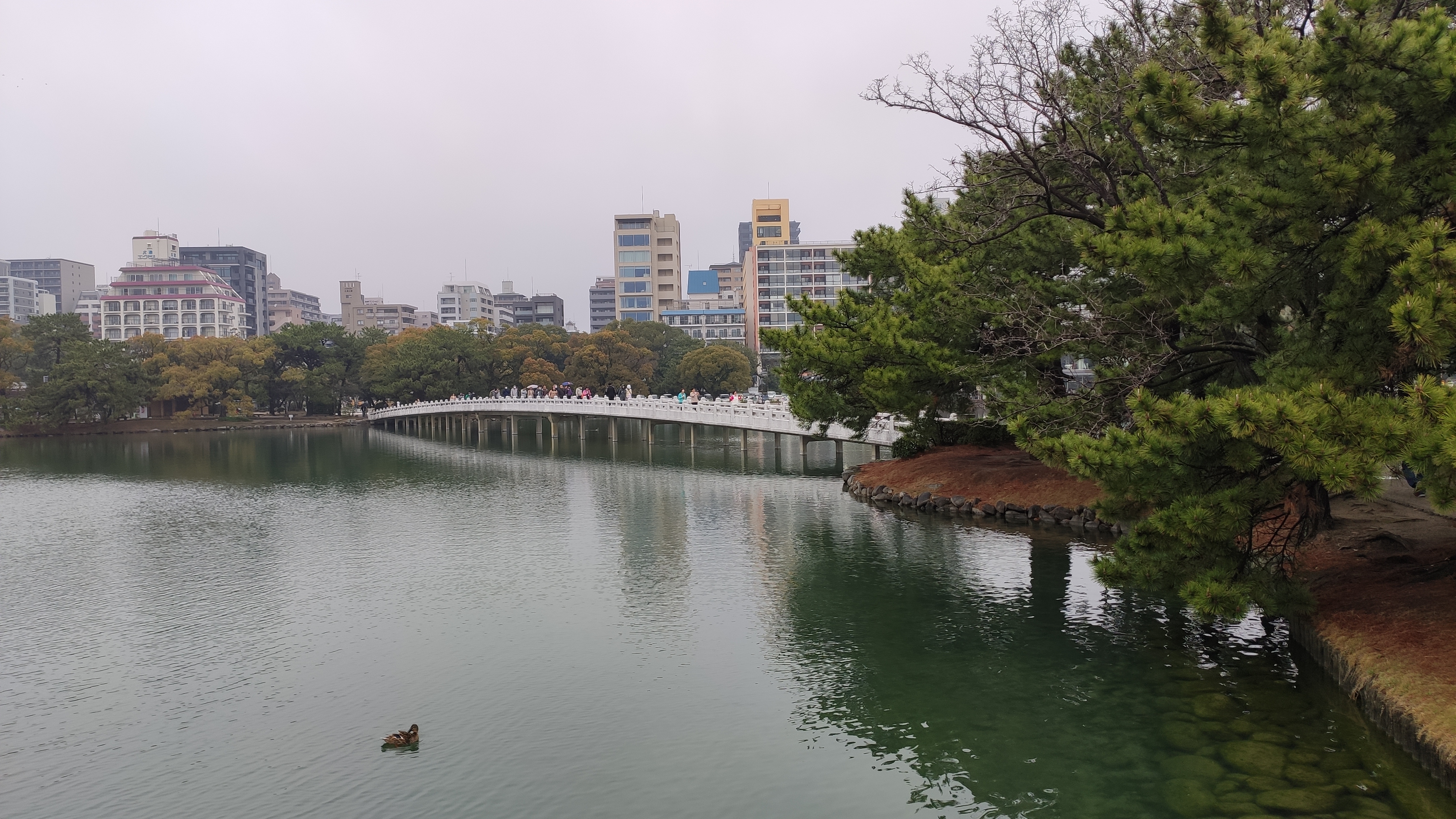 Ensuite vient le parc Ohori, où je me rappelle avoir souffert de la chaleur en été la première fois que je m’y suis rendu. Il y a un grand étang qu’enjambent des ponts.